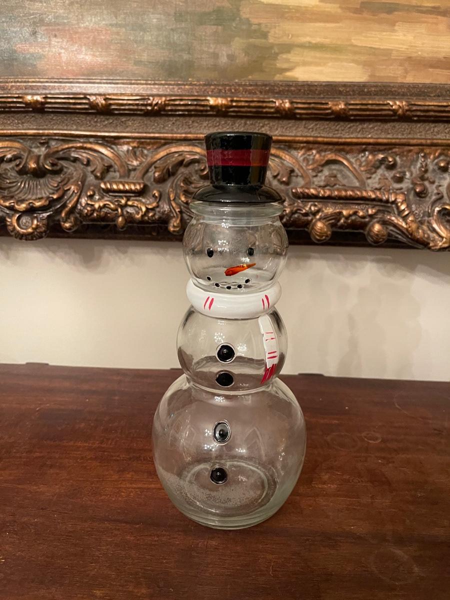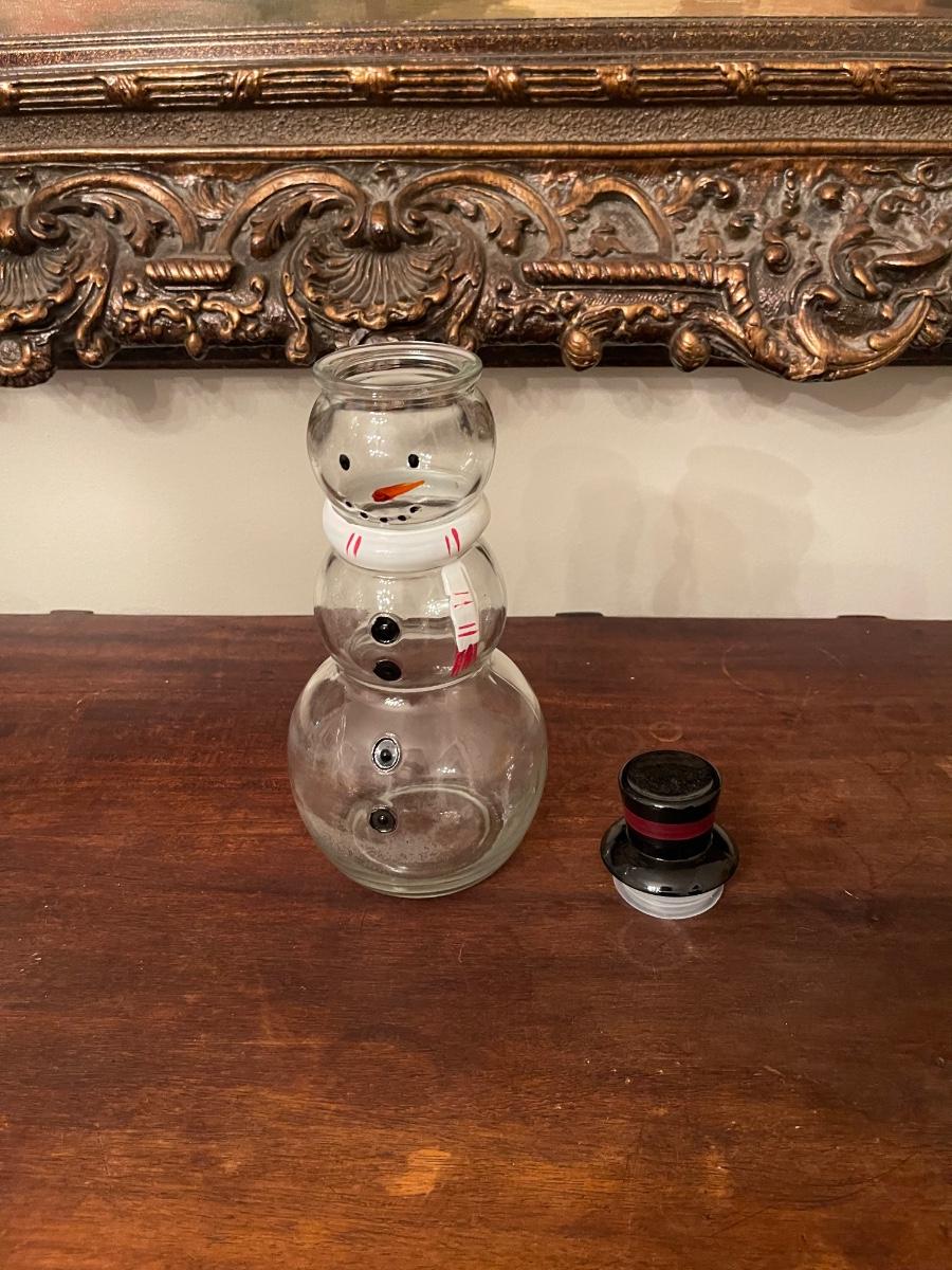 Glass Snowman Bottle. The top has a seal on it. It can be filled with something or used as a decoration.