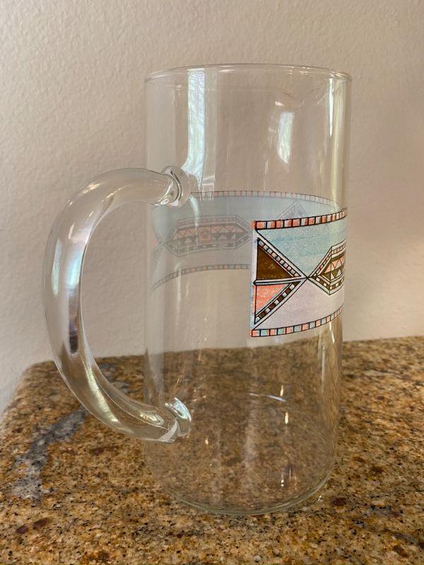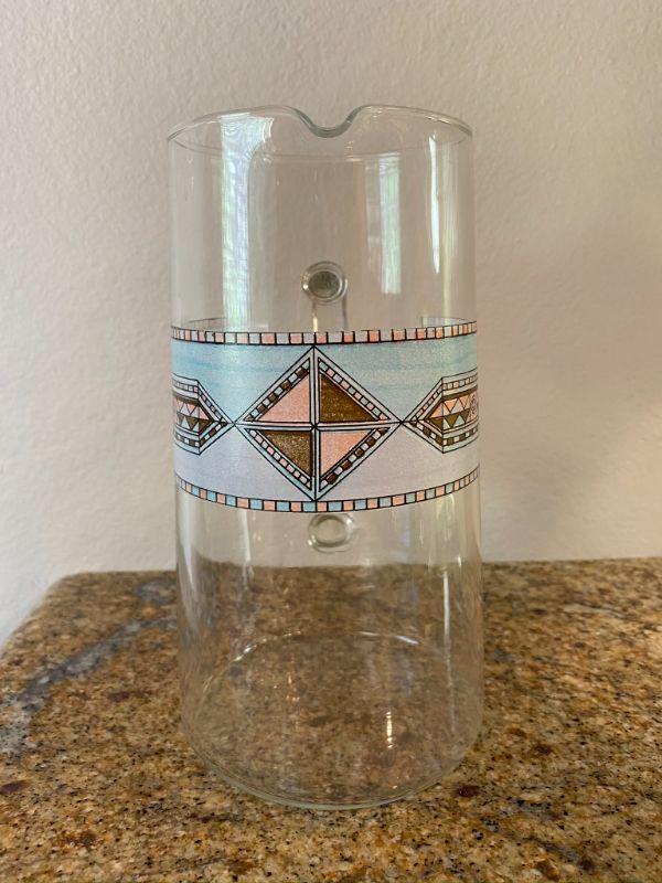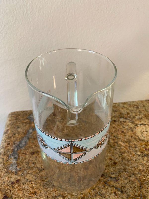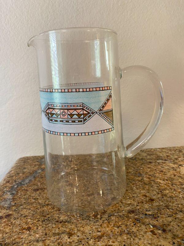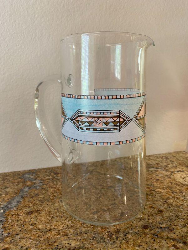 Slender iced tea/ water pitcher. Pastel southwest design on clear glass. Good condition, no chips.