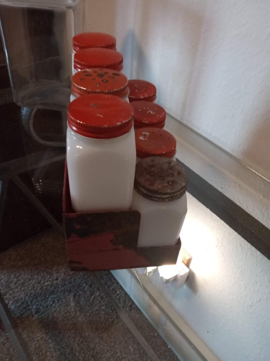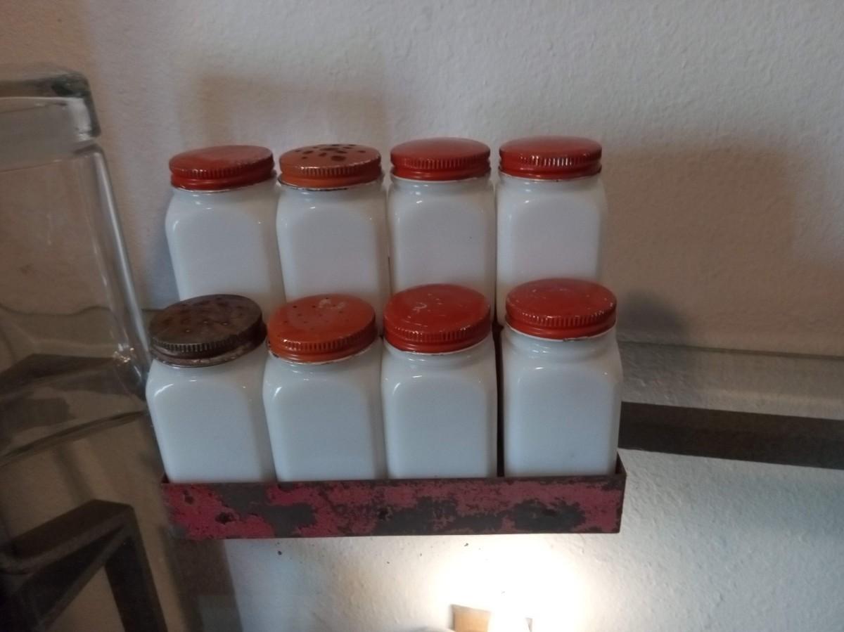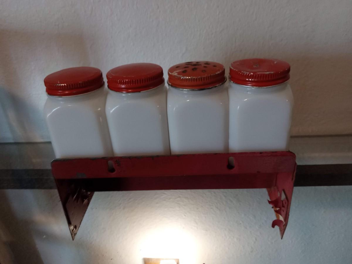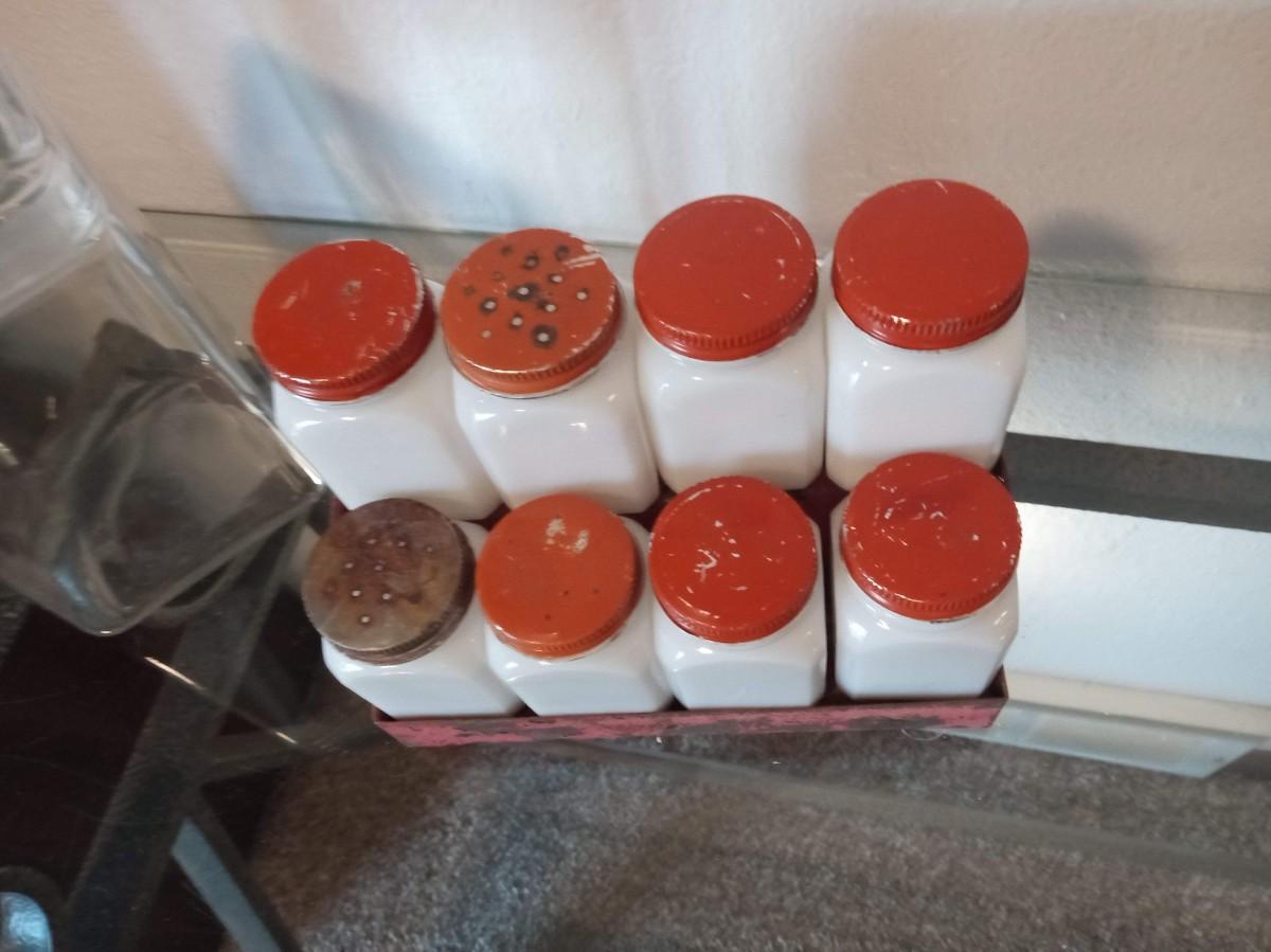 GLASS SPICE CONTAINERS IN A METAL WALL HUNG HOLDER