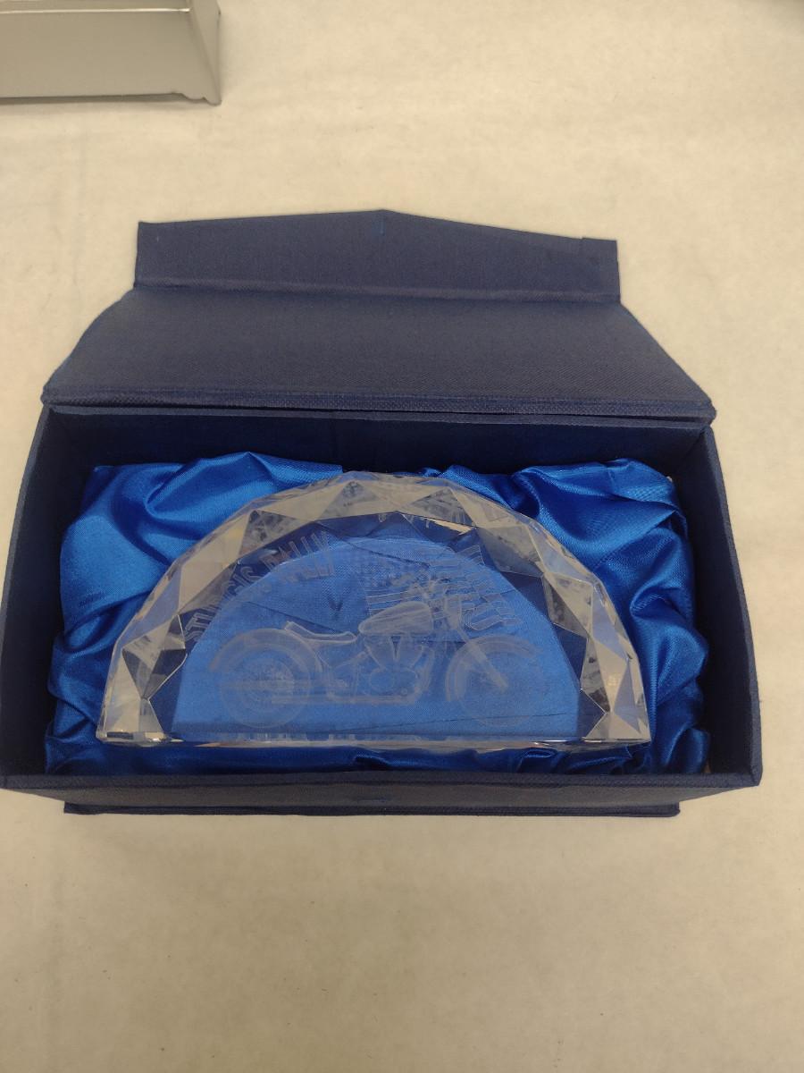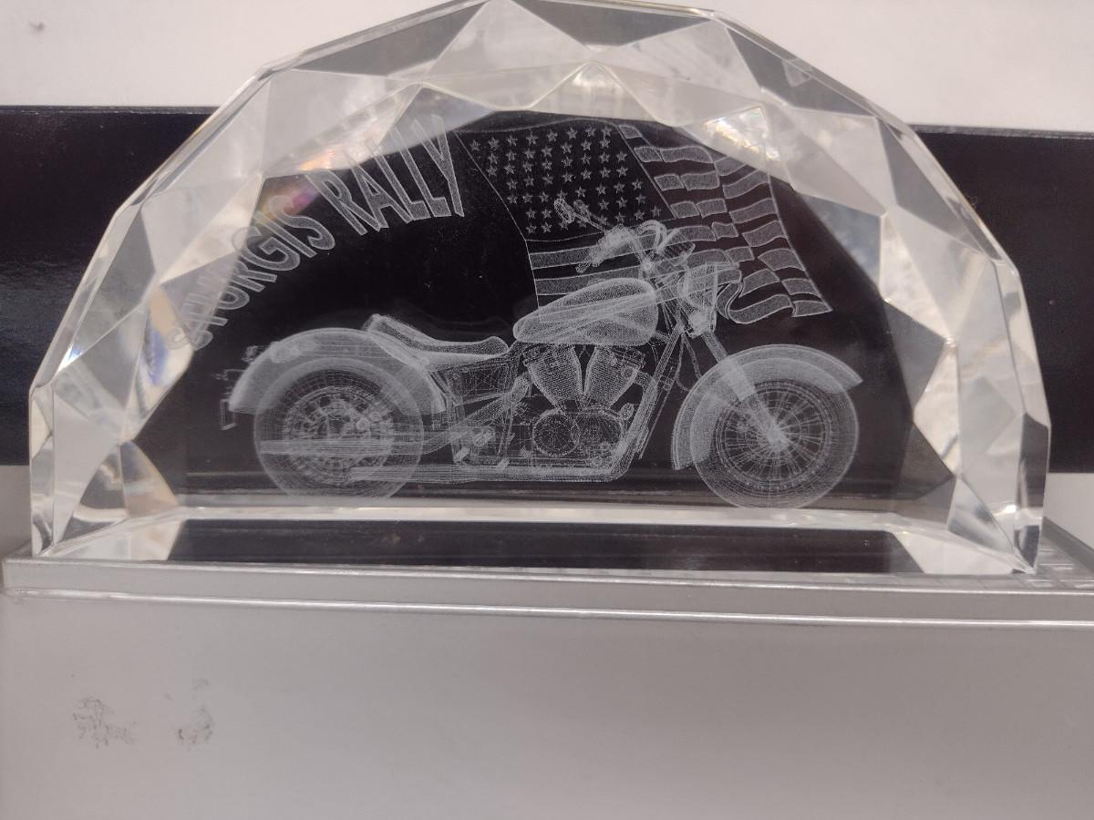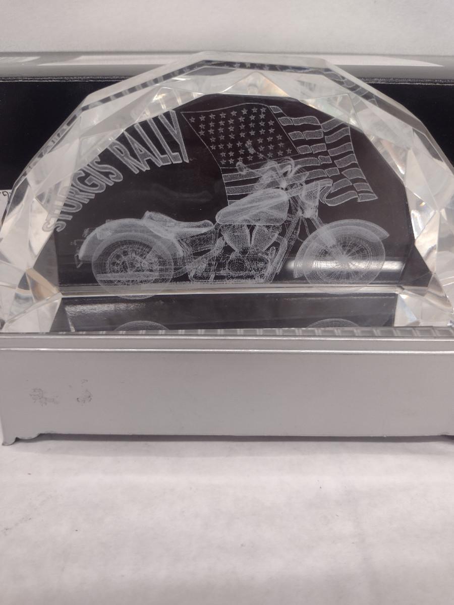 Glass Sturgis Rally Motorcycle and American Flag Design Paperweight with Lighted Display Platform (#45). Platform is not functioning- needs batteries. Paperweight measures approx 5 3/4" long, 3" tall. Item comes with original box.
