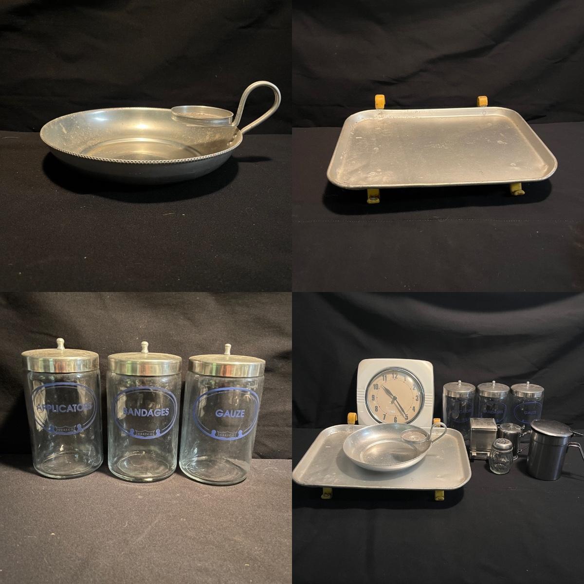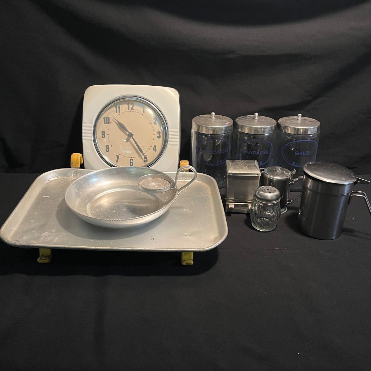 Lot includes three glass sundry jars, B.W. Buenilum chip and dip aluminum dish, aluminum drive thru tray, diner stainless steel toothpick holder, cheese jar, creamer pitcher and a retro-looking clock that was not tested. Drive thru tray measures 16” x 14” x 3.5”H.