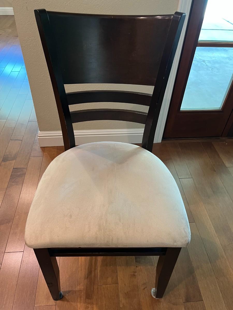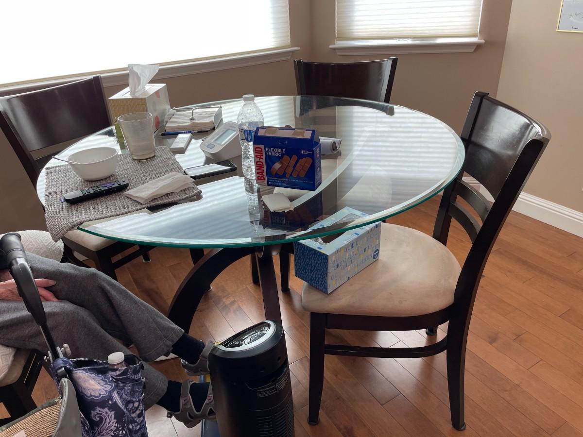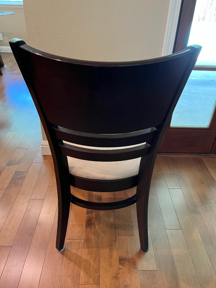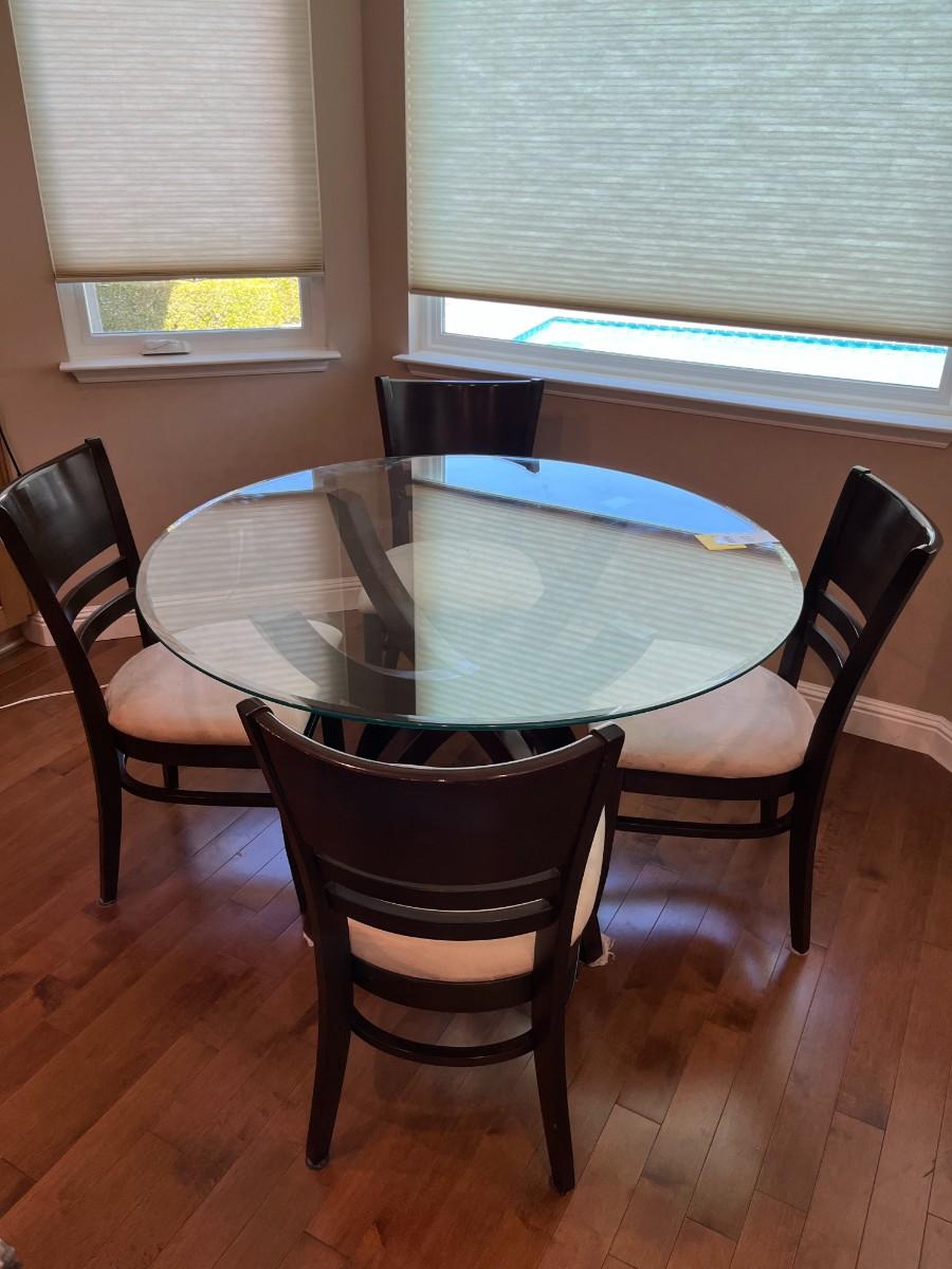 4ft diameter Dining table glass top has beveled edge.  Only 2 chairs are available. (Note that there are 4 chairs in photos, but only TWO are included with this lot) Chairs and base may have minor nicks.