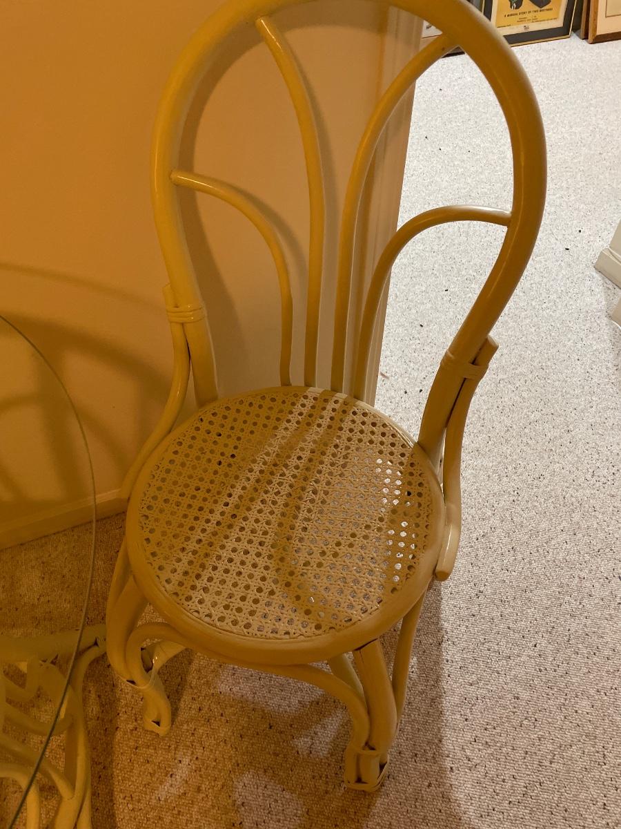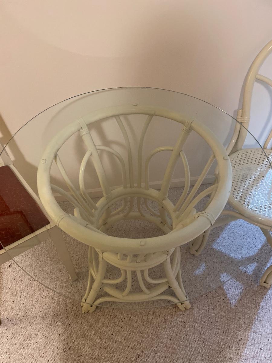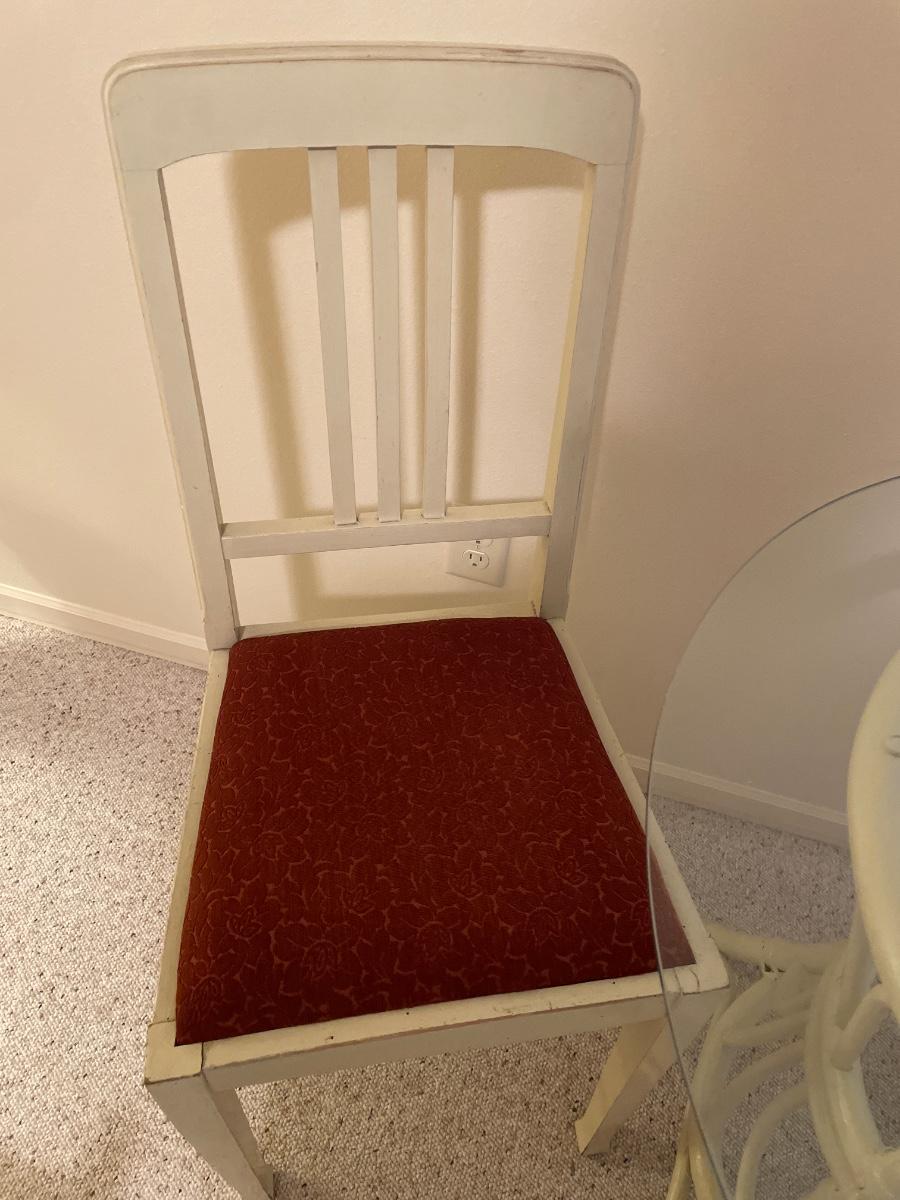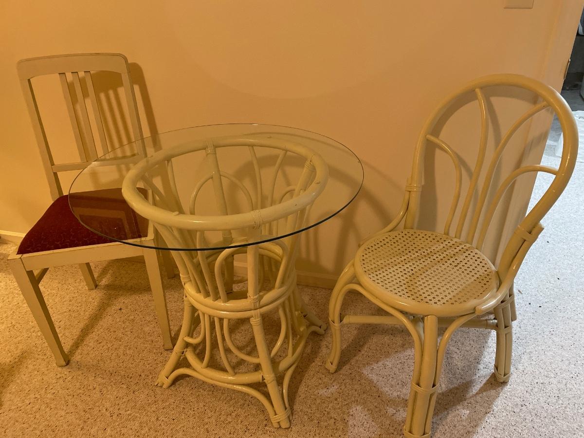 Includes 1 matches chair and 1 unmatched chair with glass table top table.