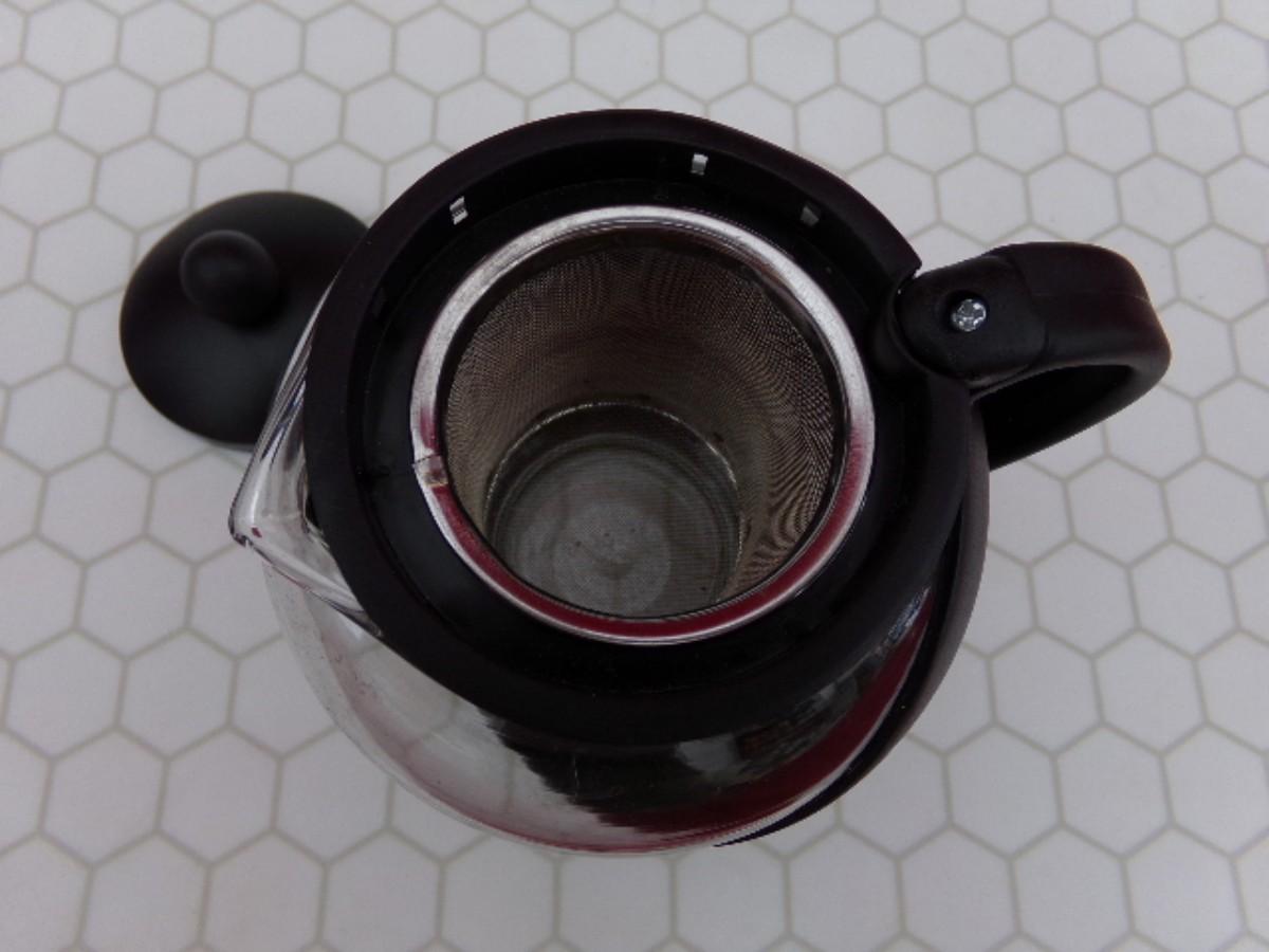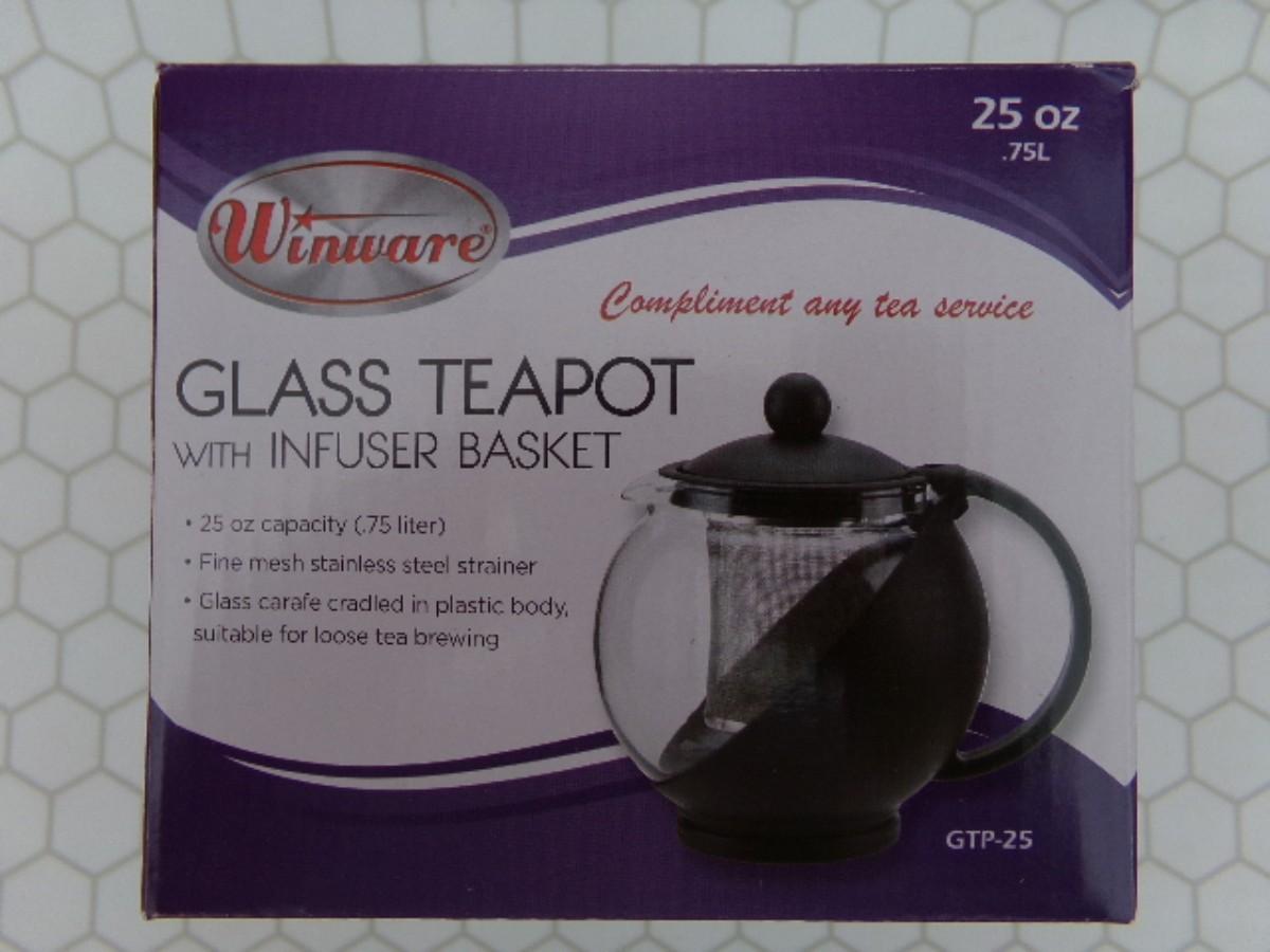Glass Teapot w/infuser basket. Labeled 25 oz. Appears NEW IN BOX