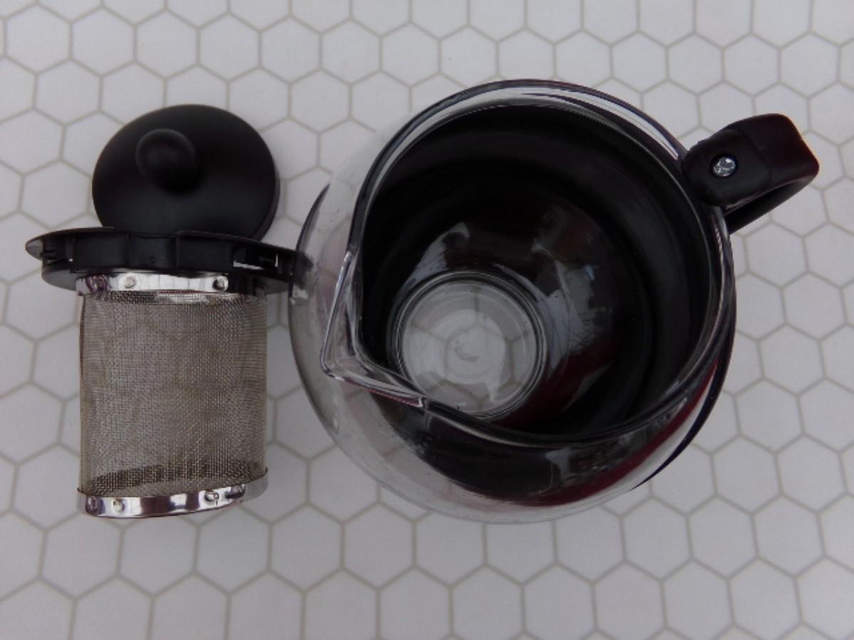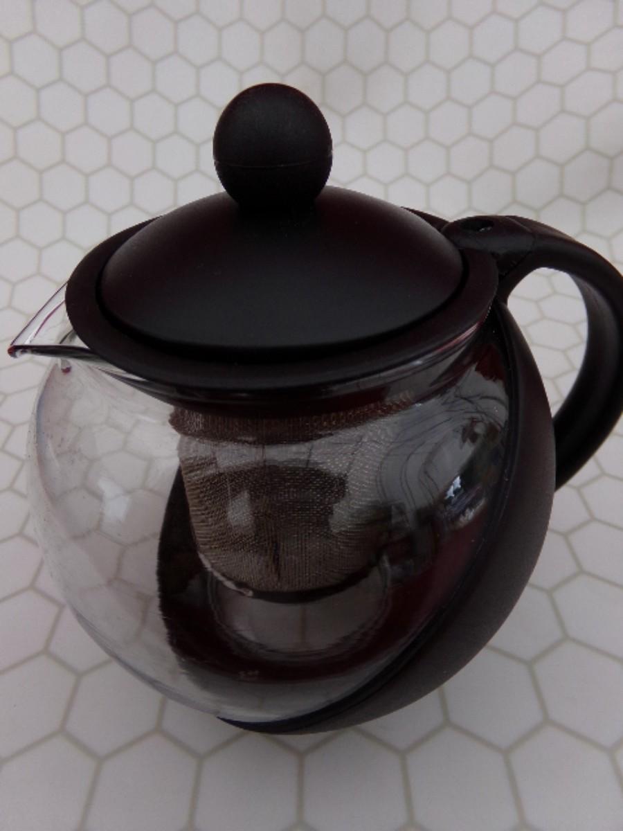 Glass Teapot with infuser basket. Labeled 25 oz. Appears to be NEW IN BOX/unused w/instruction sheet.