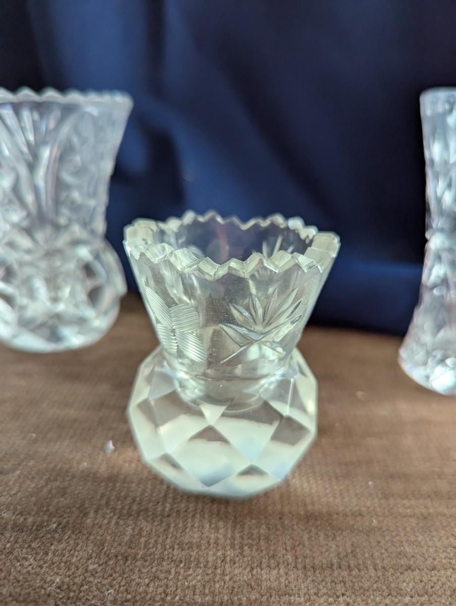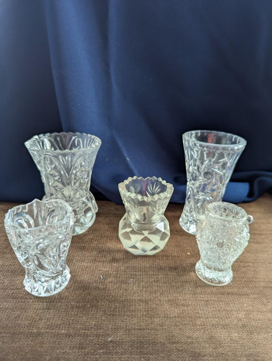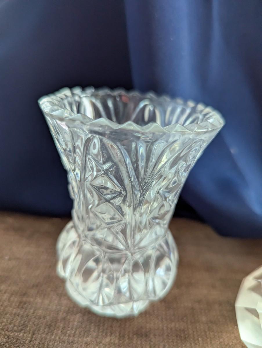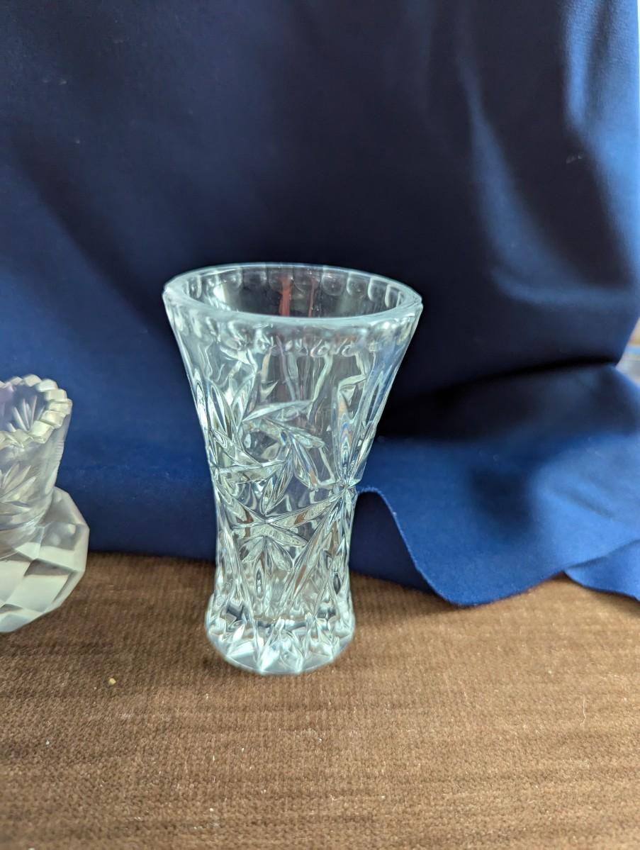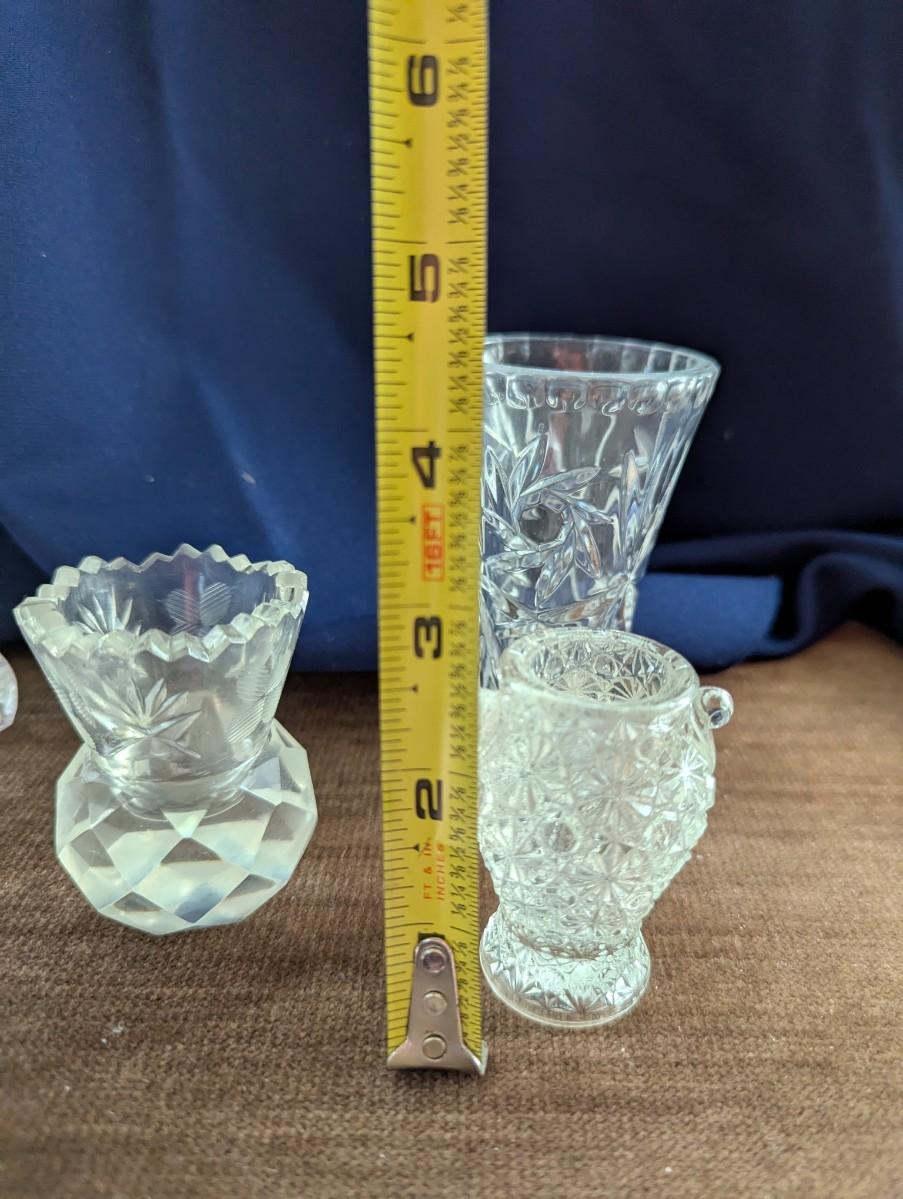 Small Crystal (Possibly Lenox) Vase, Vintage Daisy and Button Clear Glass Toothpick Holder. Etcher glass Toothpick Holder, Pattered Glass Toothpick Holder.