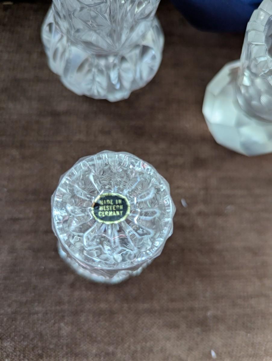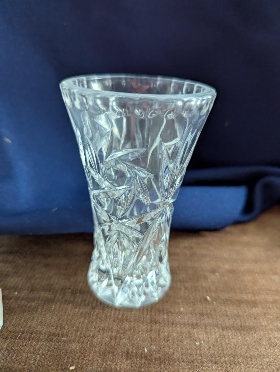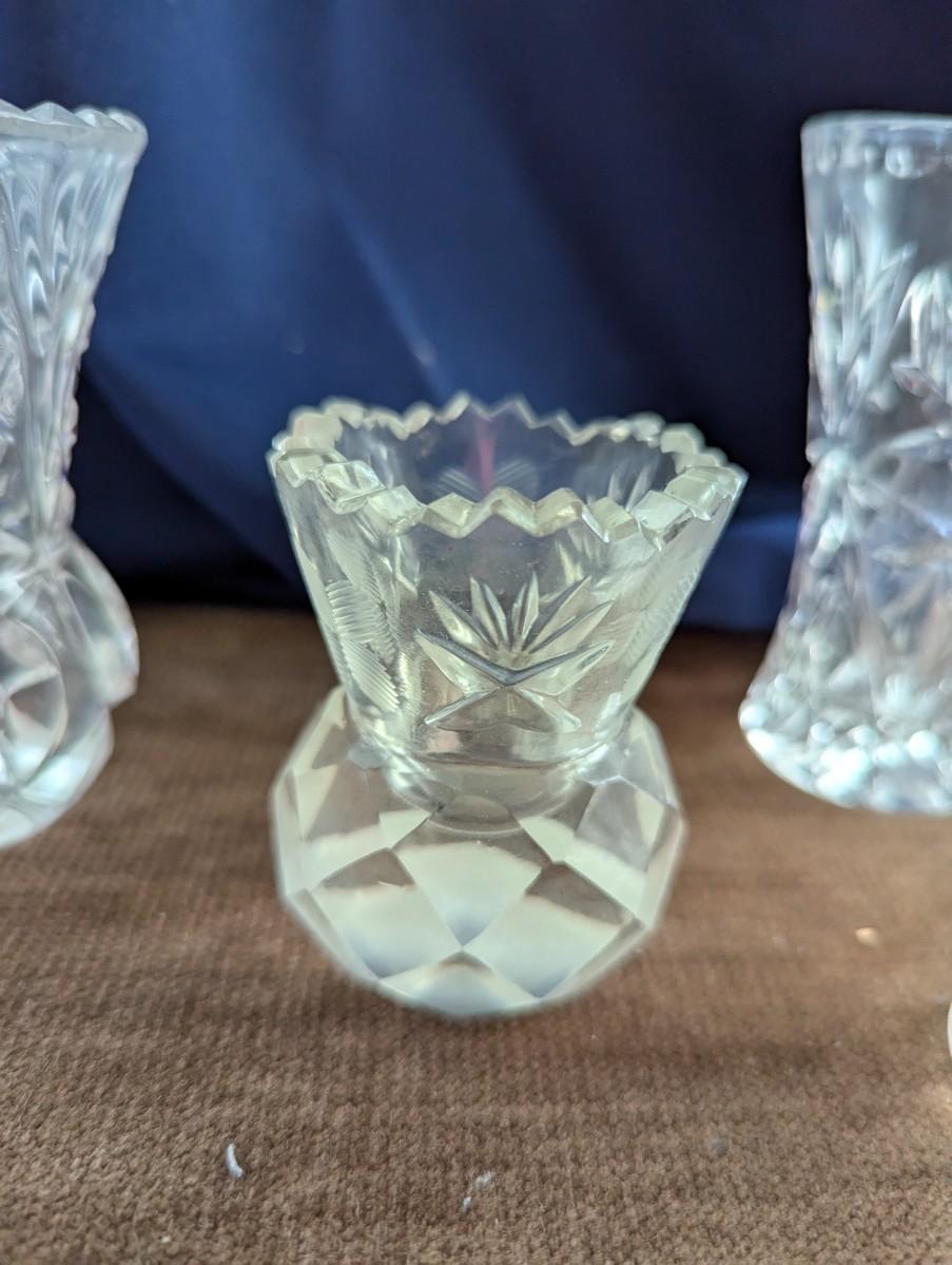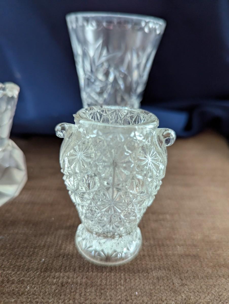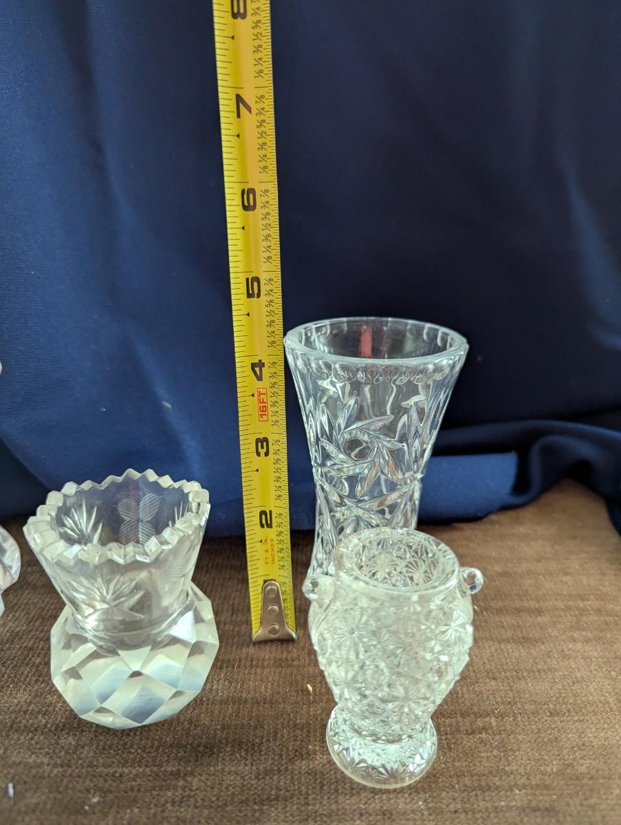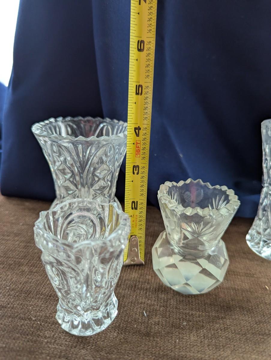 Small Crystal (Possibly Lenox) Vase, Vintage Daisy and Button Clear Glass Toothpick Holder. Etcher glass Toothpick Holder, Pattered Glass Toothpick Holder.