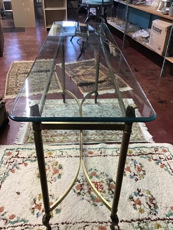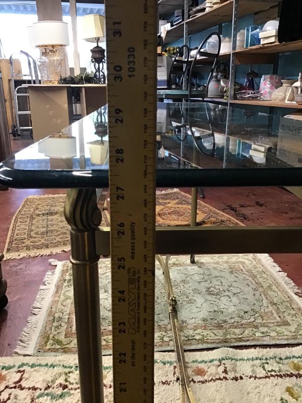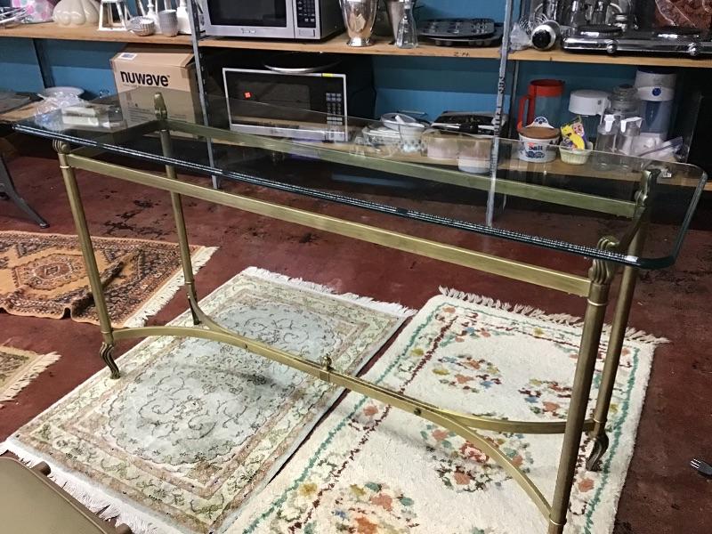 52” wide 16” deep 27” tall no issues with glass top. Some tarnishing found on brass. Great piece. Available for immediate pickup