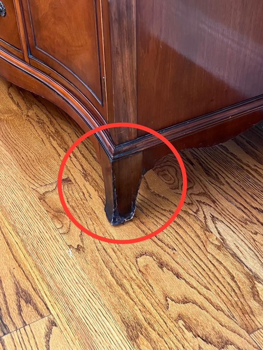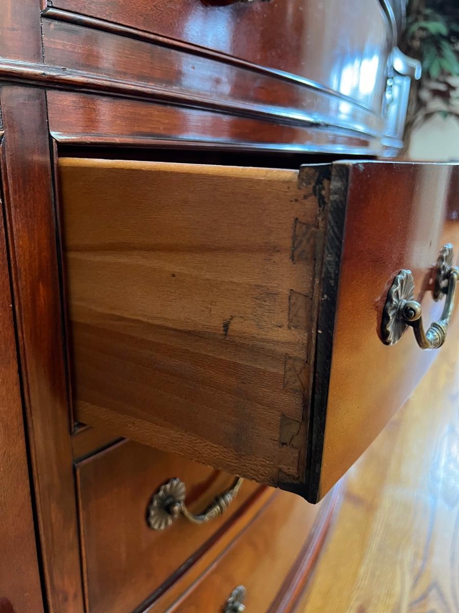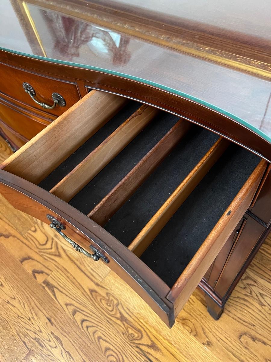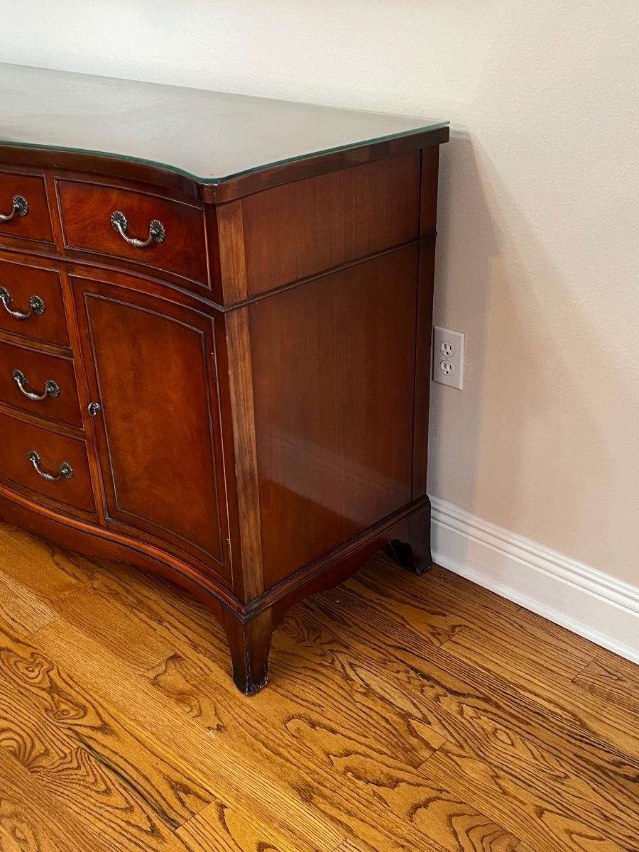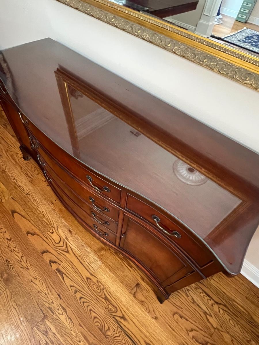 All drawers slide in & out easily ~ Has glass top ~ No name brand found ~ Has approximately about 2" of minor water damage on legs from Katrina. No Major Damage ~ 34.5” H x 63” W x 22” D