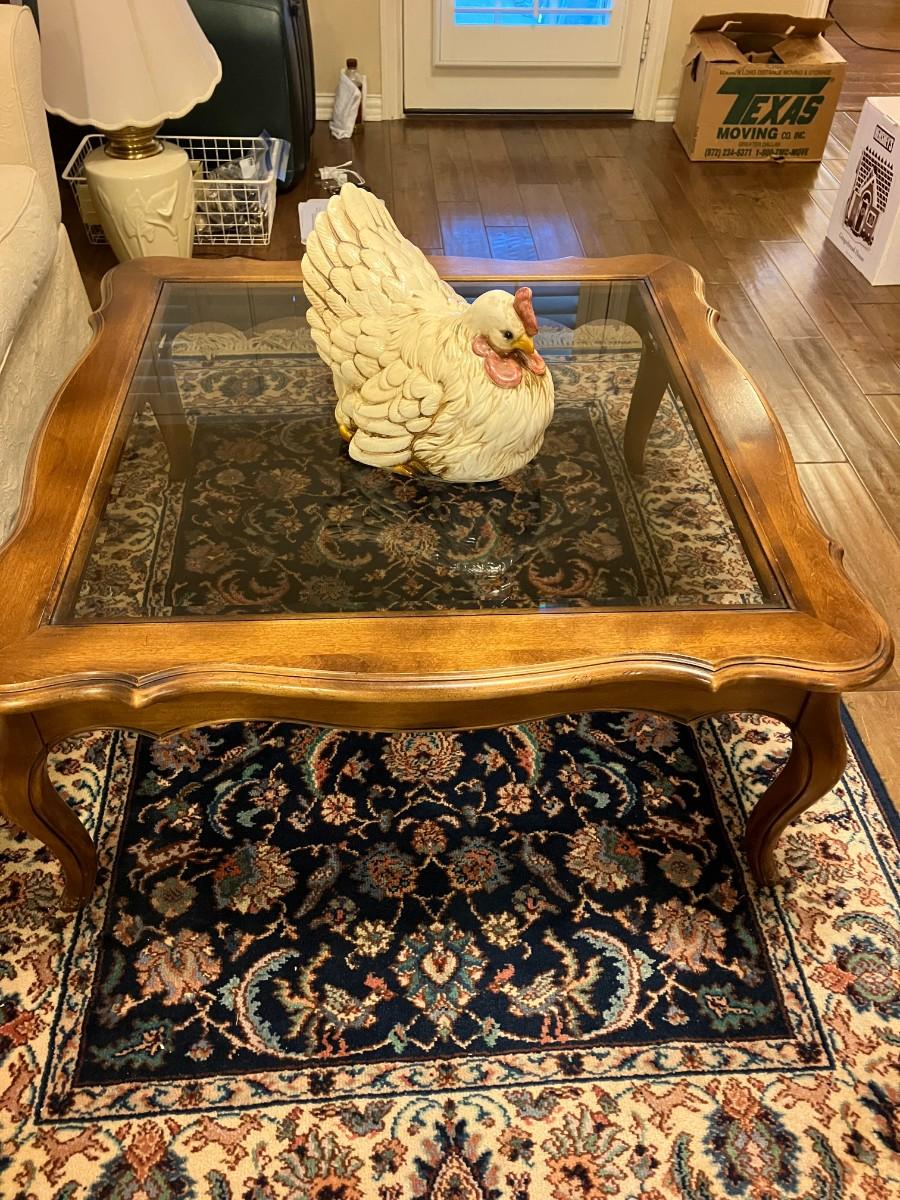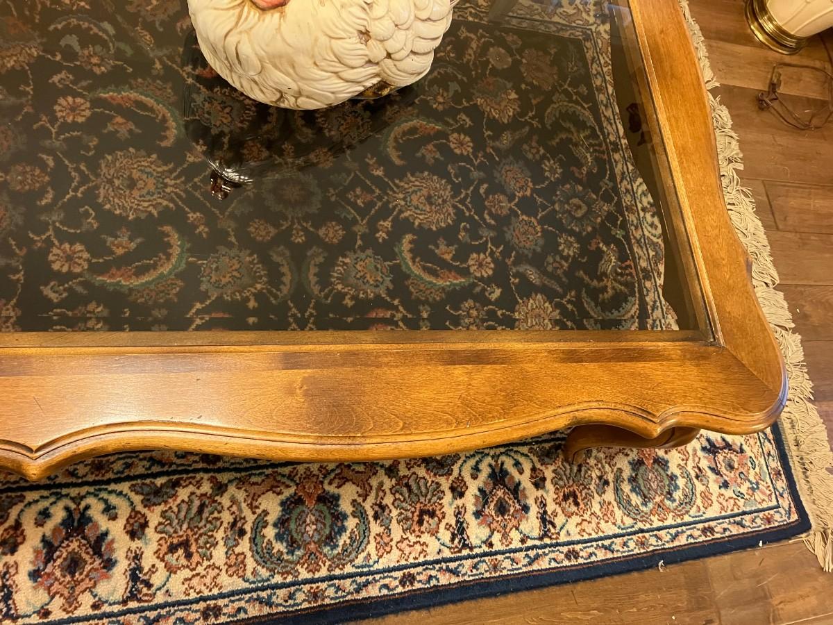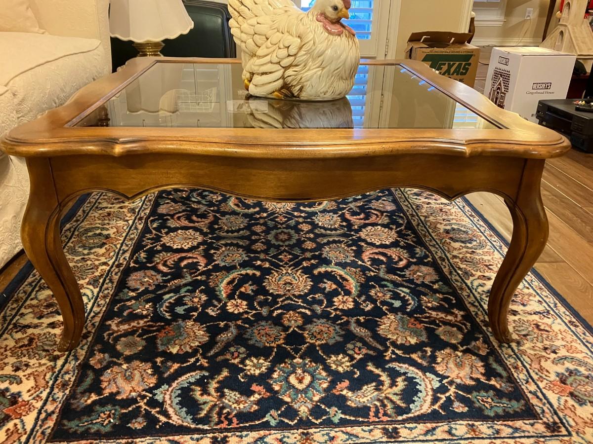 Beautiful solid wood glass top coffee table with removeable glass for transport. 17" H from floor x 38" W x 38" D