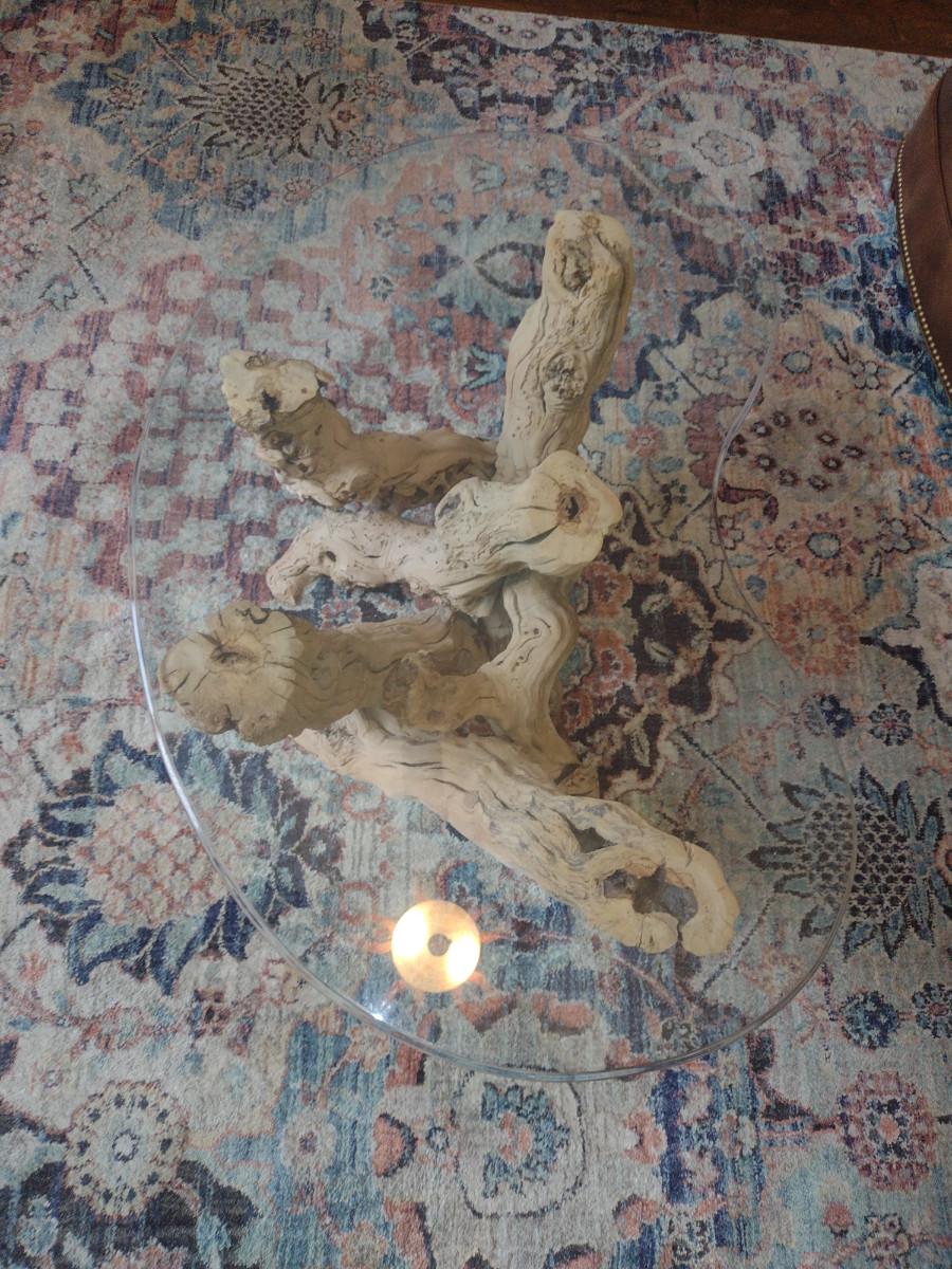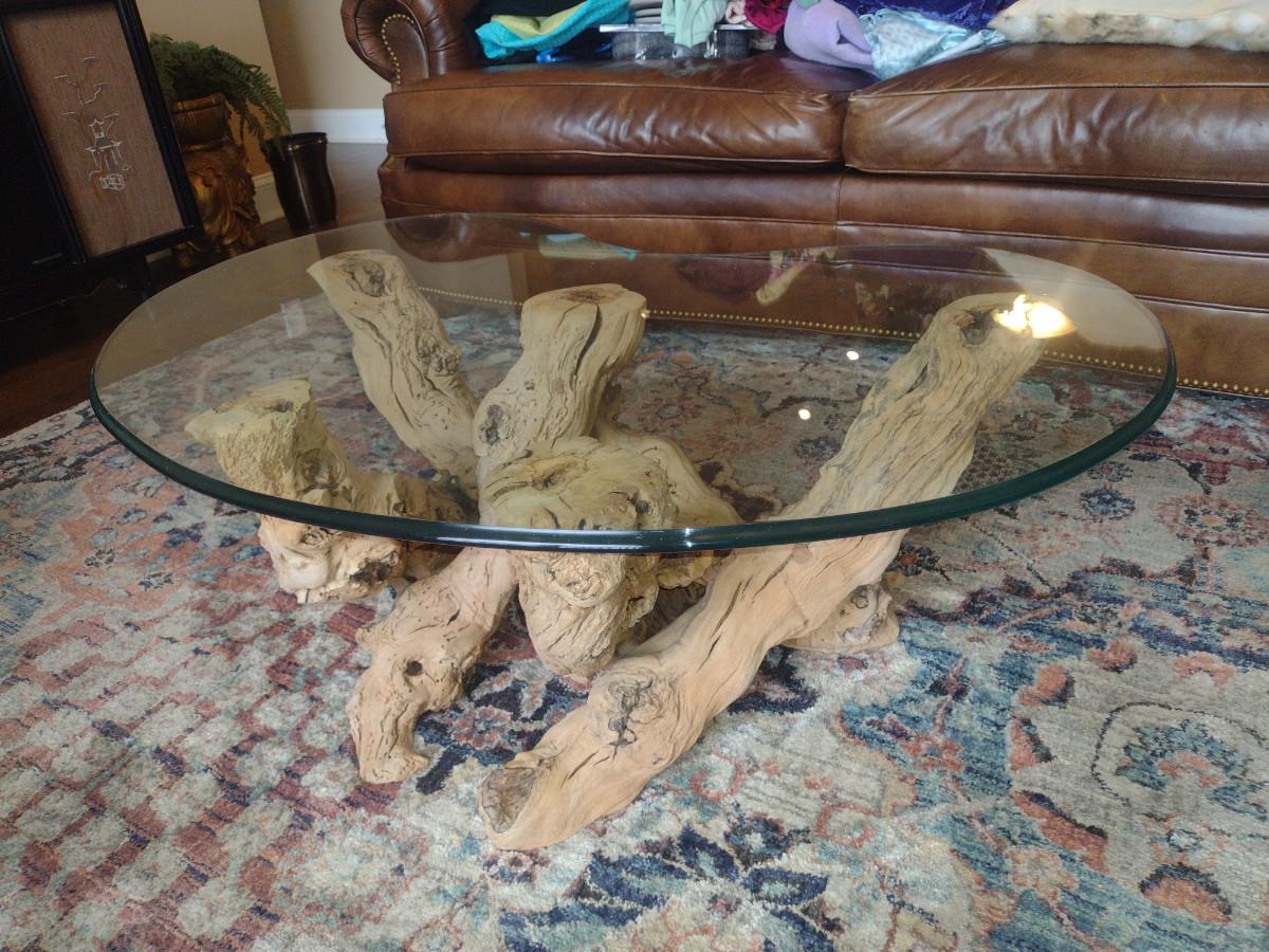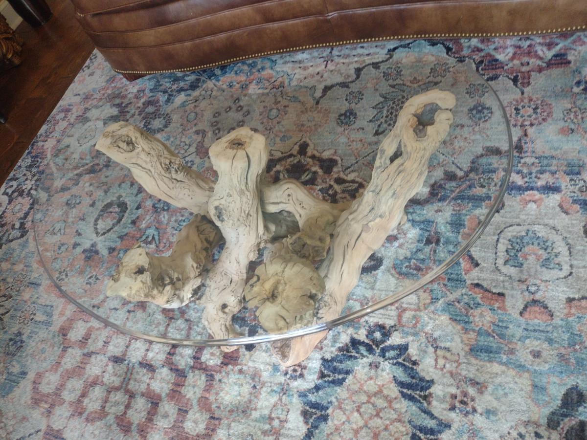 Glass Top Coffee Table with Driftwood Base- Approx 23" x 40" x 15" Tall