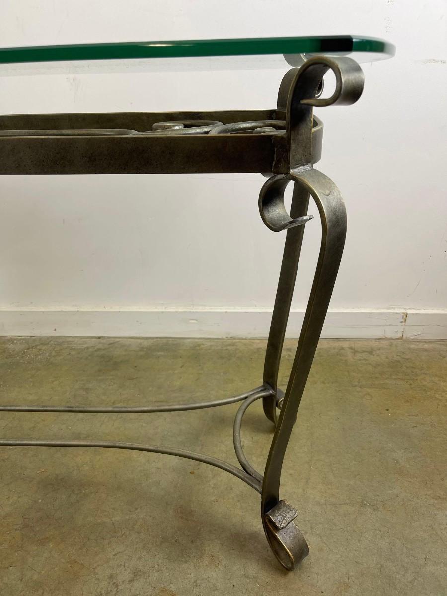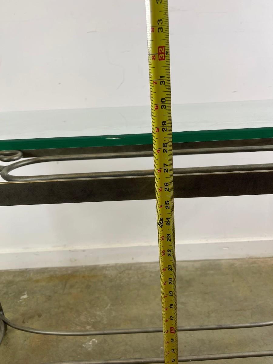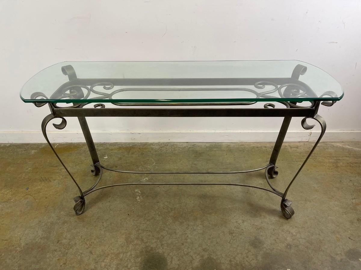 Glass Top Console Table with Scrolling Metal Base. Excellent condition except the table is missing the rubber stoppers for the glass.