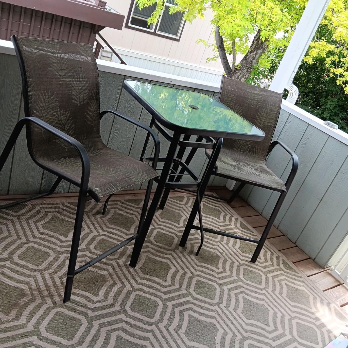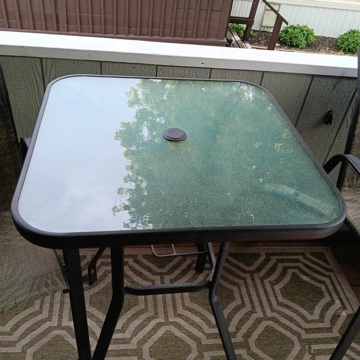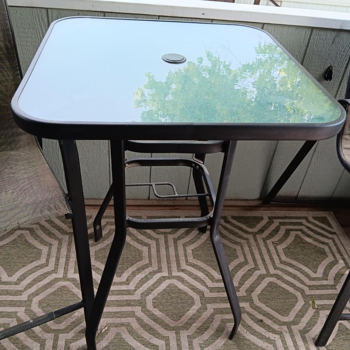 GLASS TOP COUNTER HEIGHT PATIO TABLE W/2 CHAIRS
