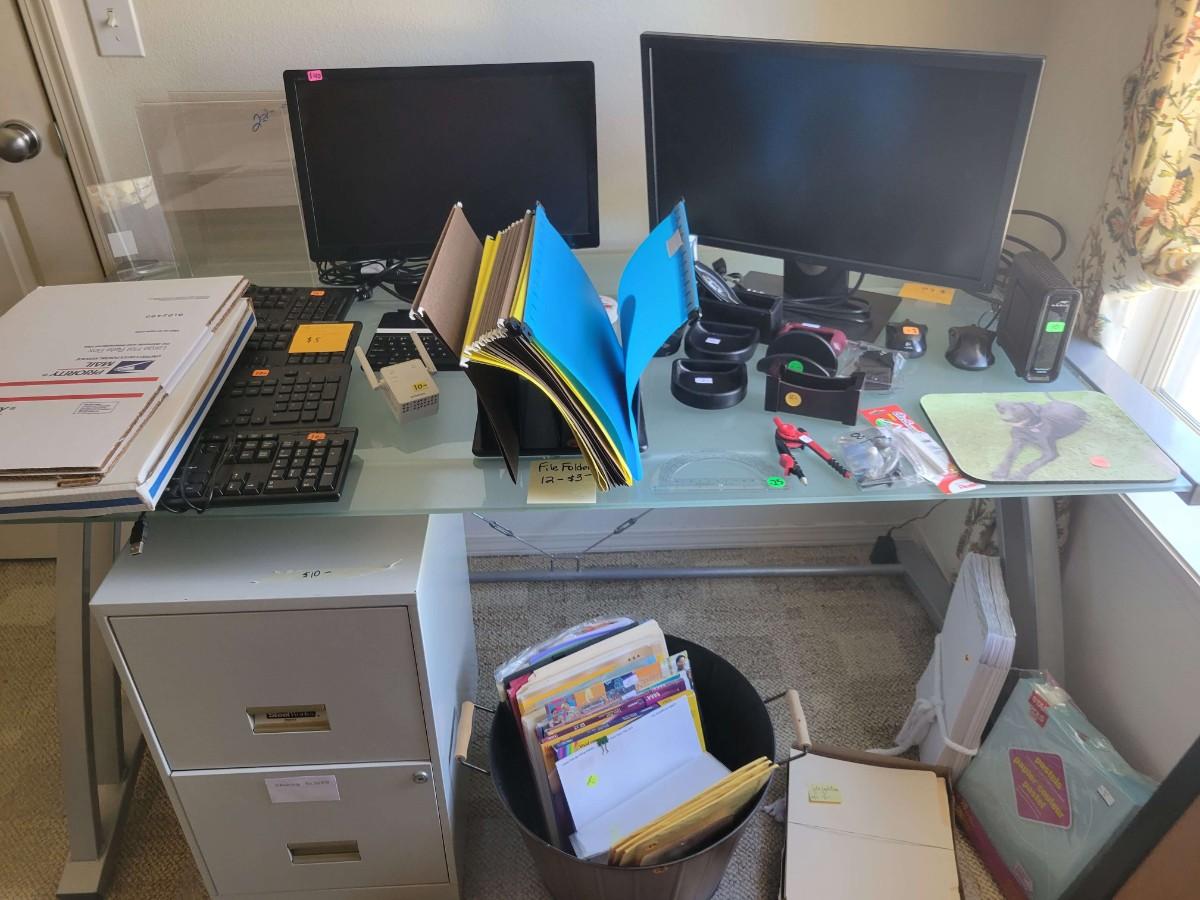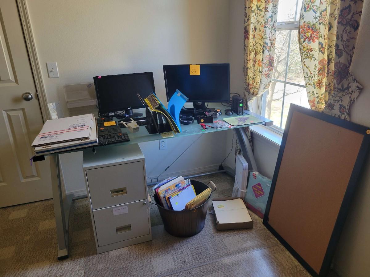 Glass top desk, monitors, keyboards, small filing cabinet and accessories.