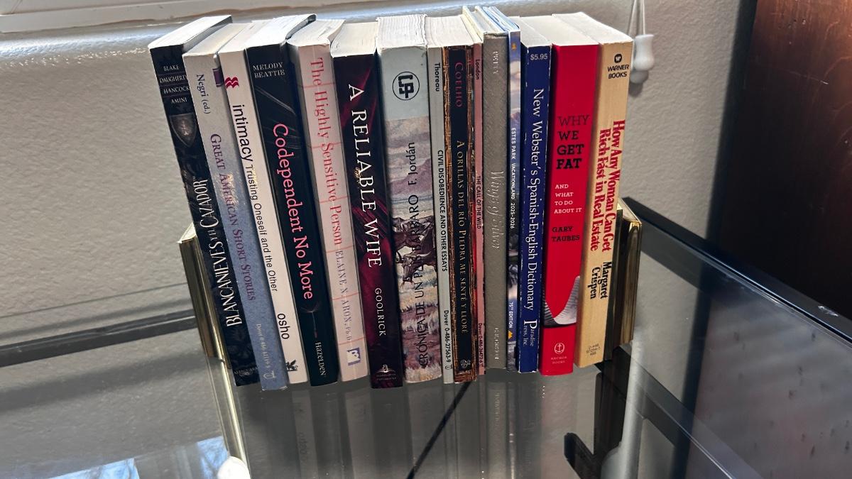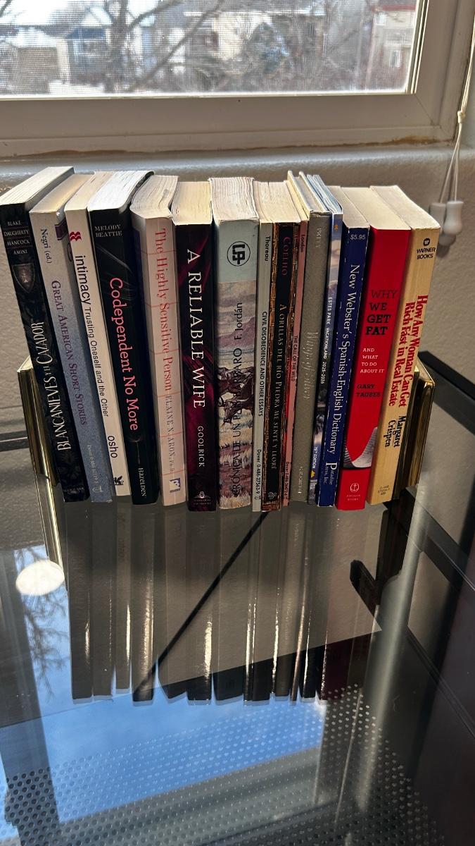 GLASS TOP DESK, CHAIR, BOOKS AND OTT-LITE LAMP