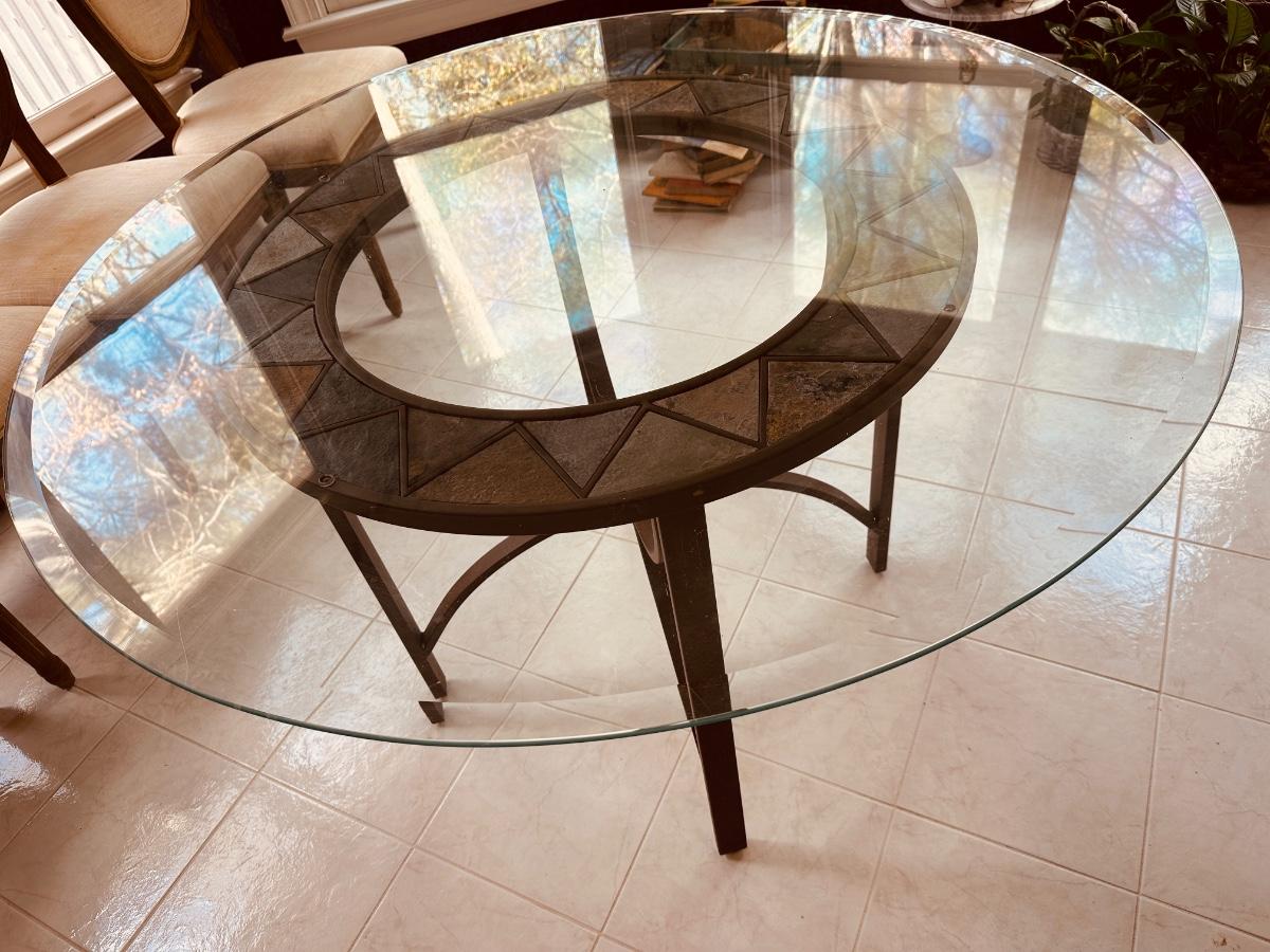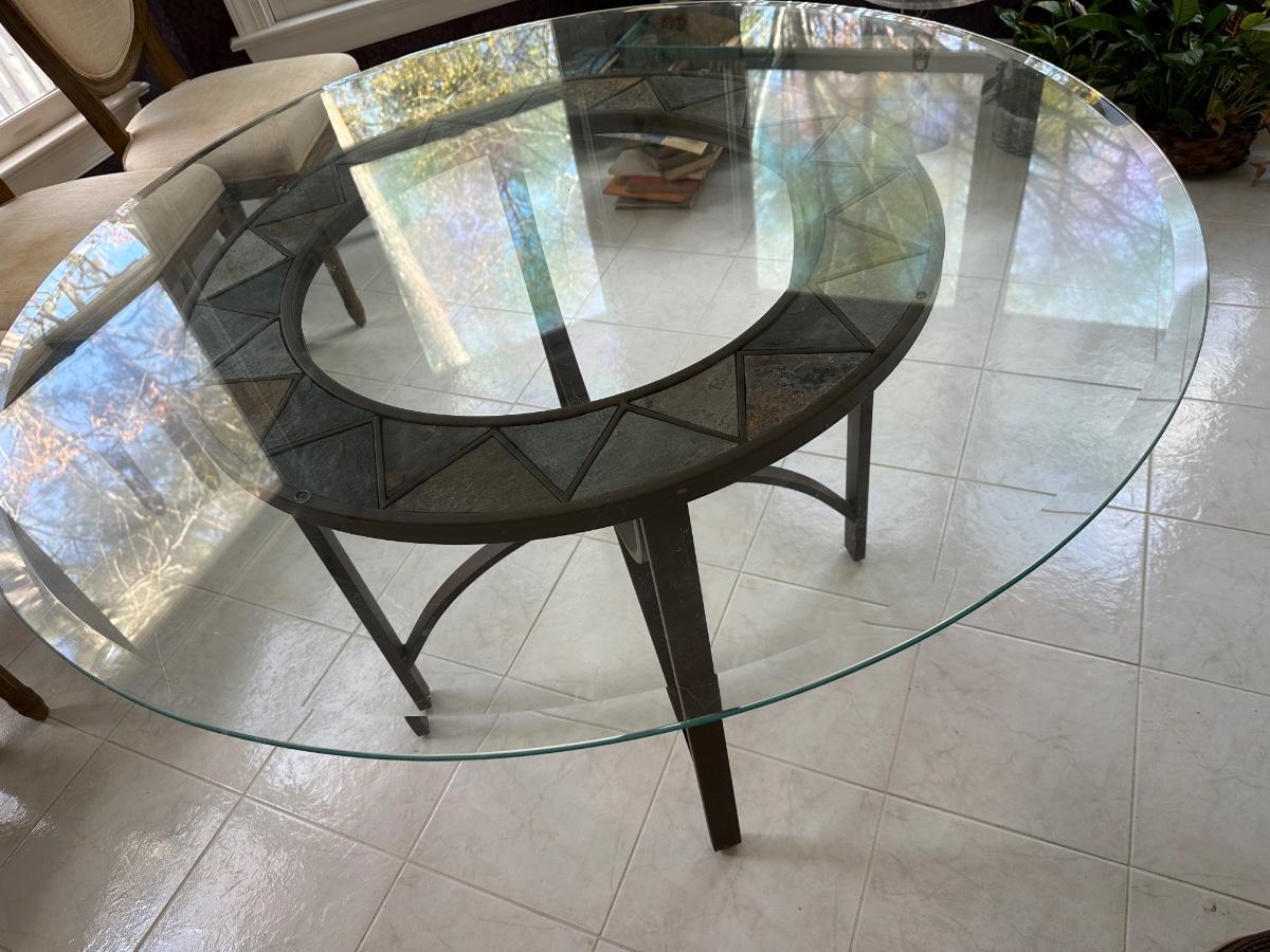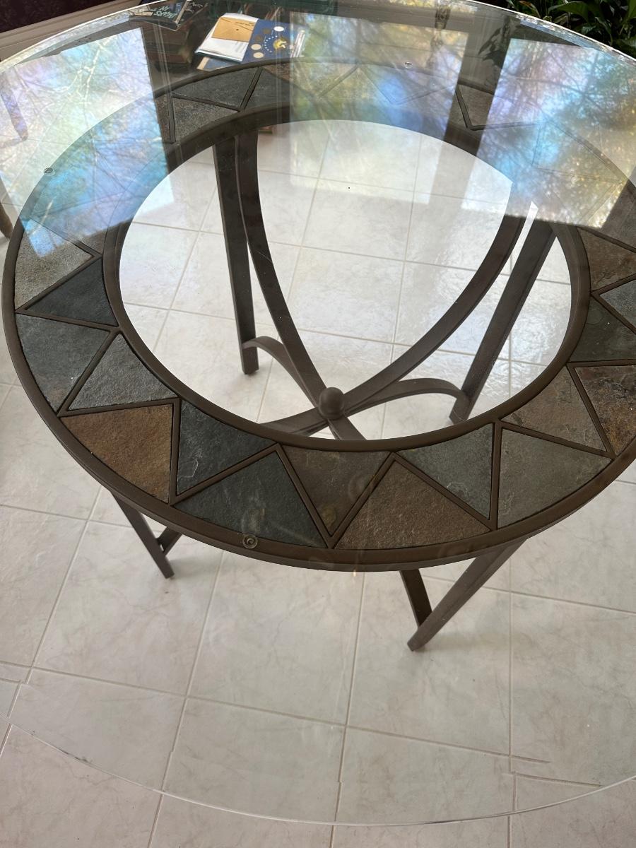 Glass Top Dining Table 48", 29 1/2 tall metal and tile accent base