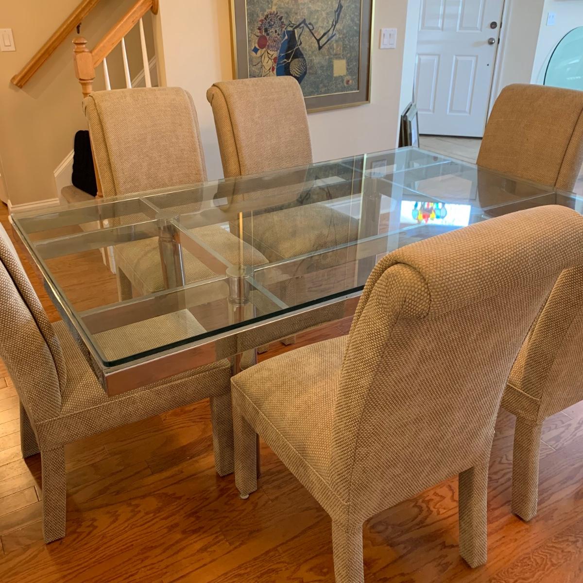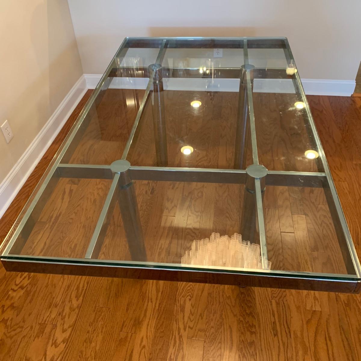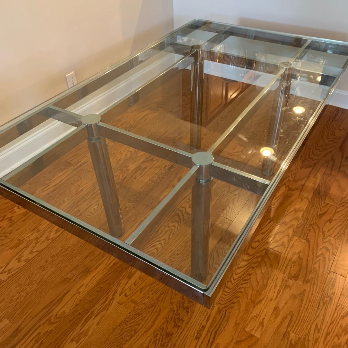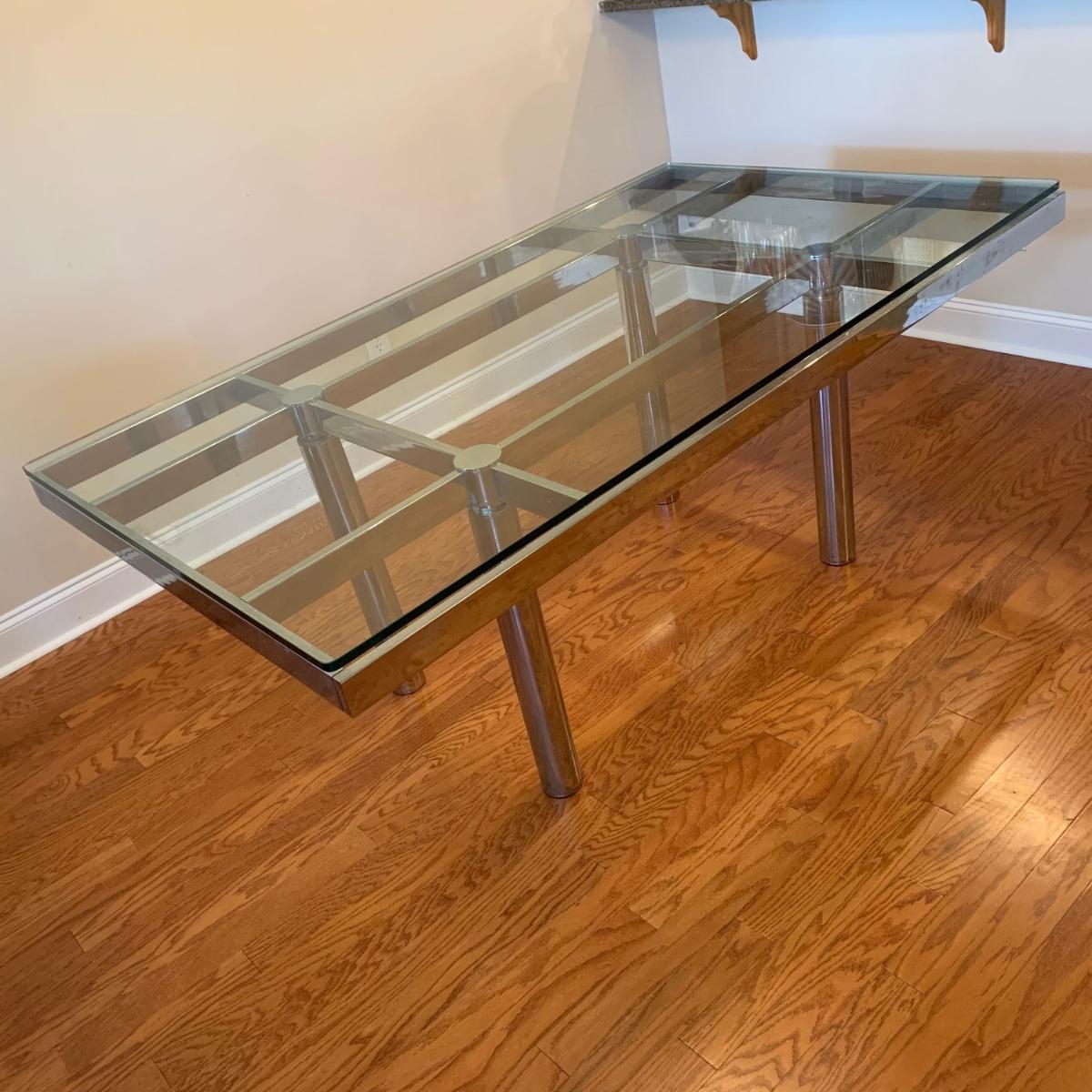 Gorgeous modern glass top dining table on a metal base. Table measures 72” x 42.25” x 29”H. Glass top is not attached to the table, glass top sits on frame and can be removed without tools for transport. Some small rust spots are seen on the metal. The chairs are NOT included in this lot, but can be found in lot 122.