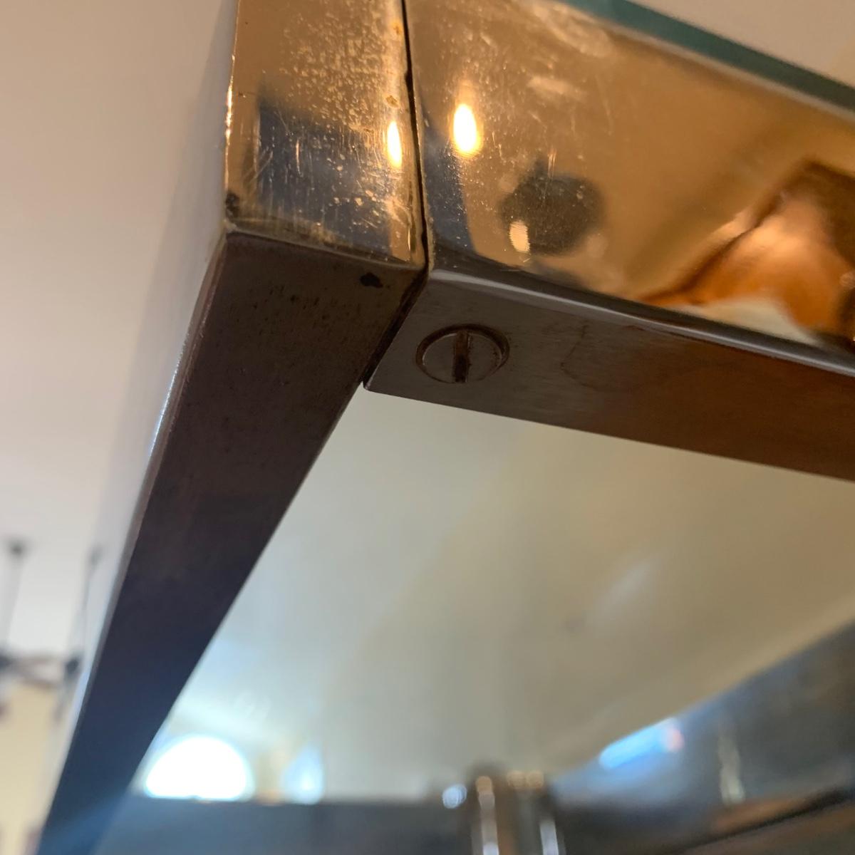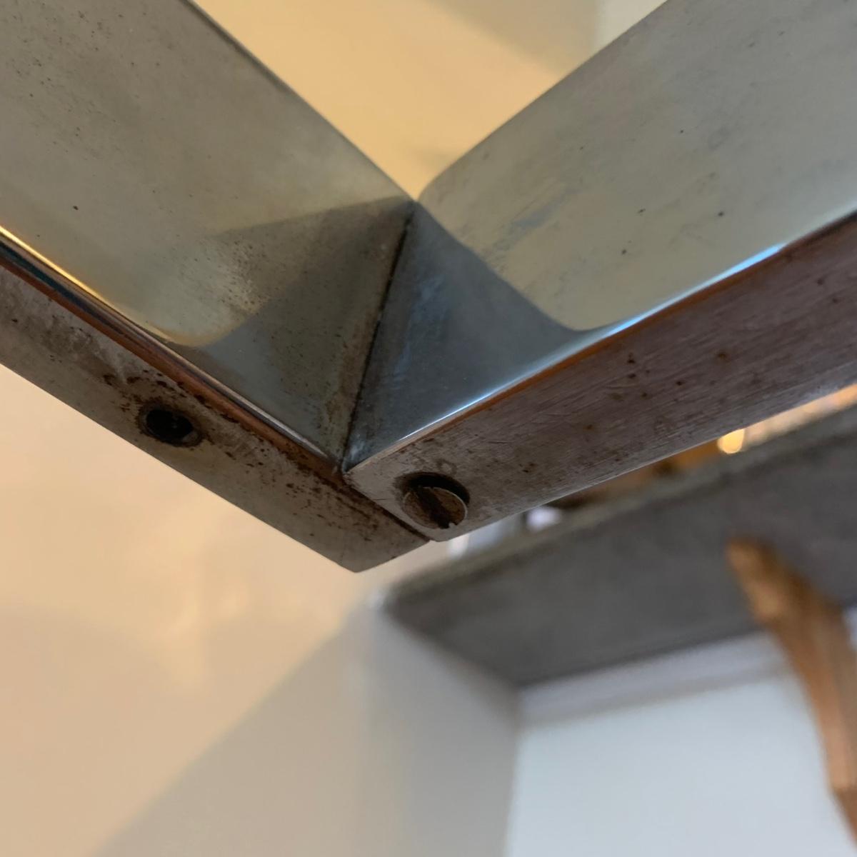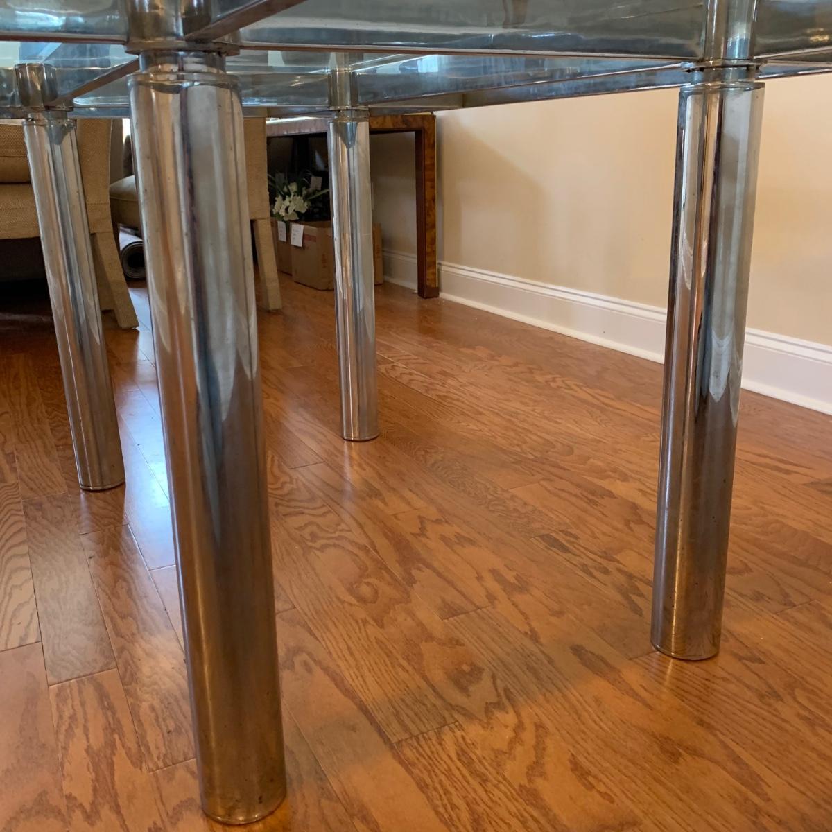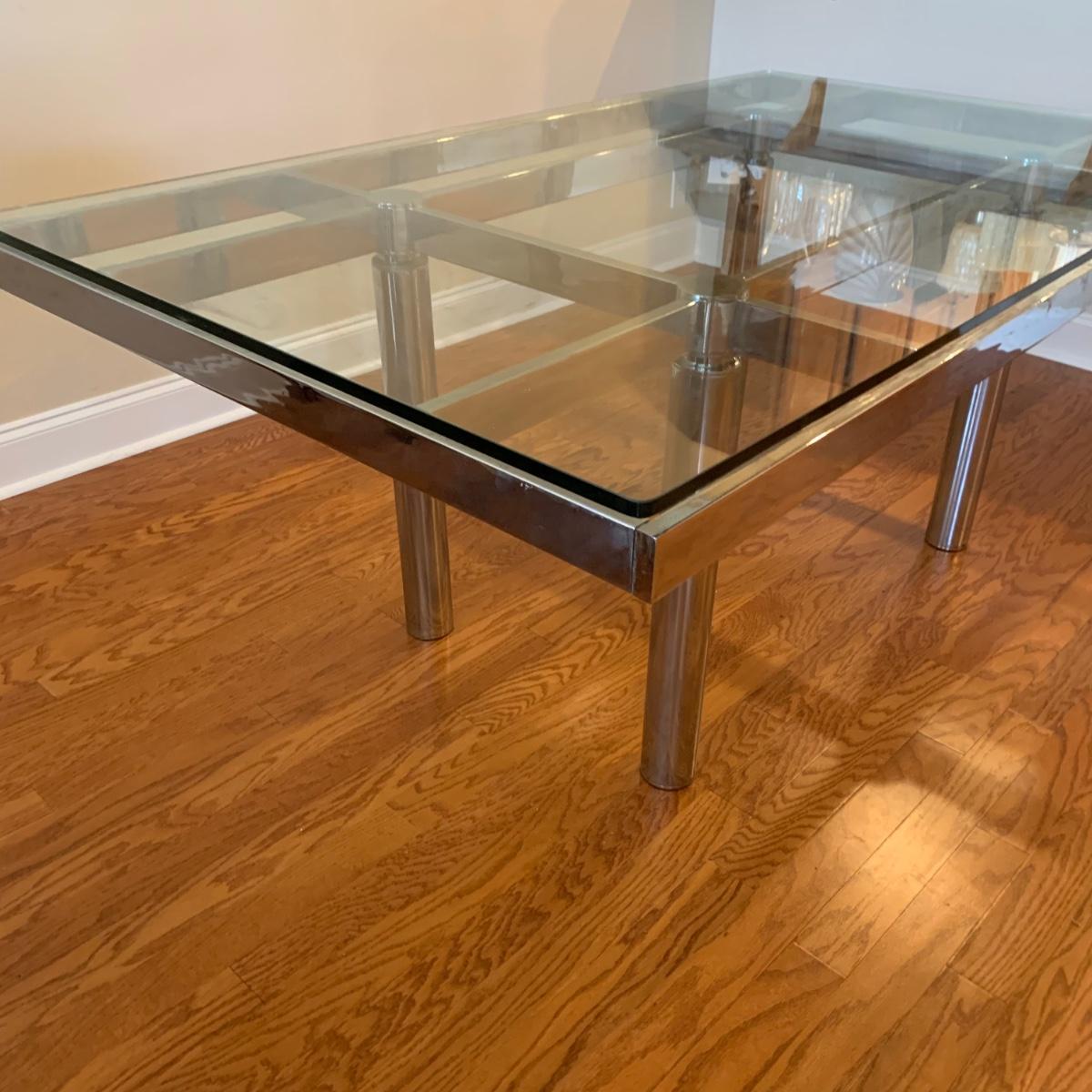 Gorgeous modern glass top dining table on a metal base. Table measures 72” x 42.25” x 29”H. Glass top is not attached to the table, glass top sits on frame and can be removed without tools for transport. Some small rust spots are seen on the metal. The chairs are NOT included in this lot, but can be found in lot 122.
