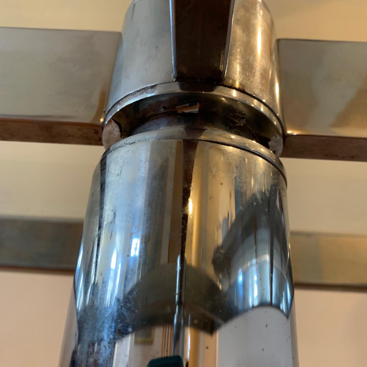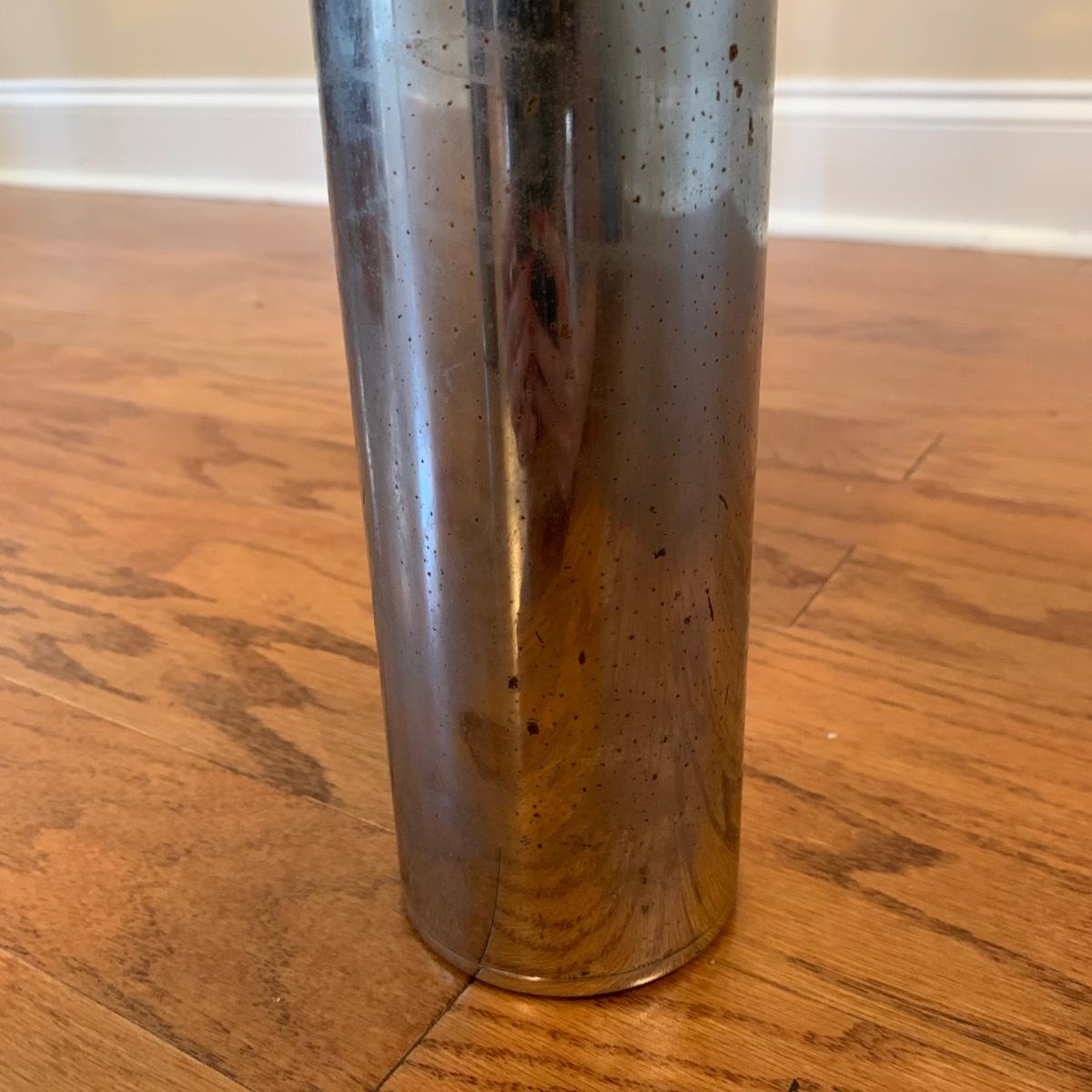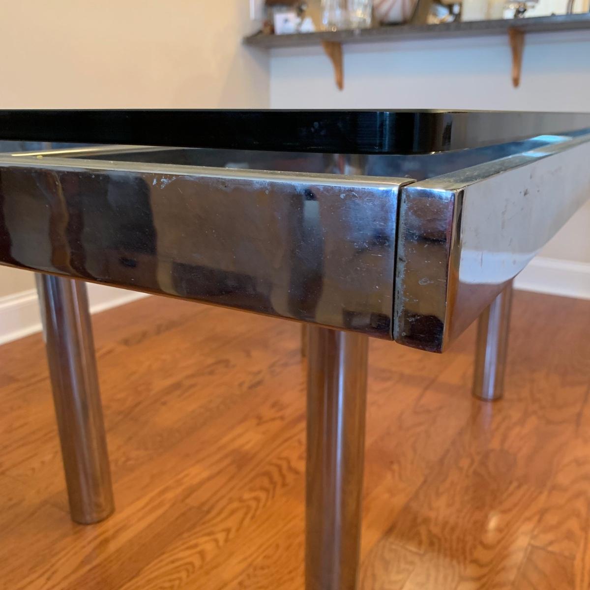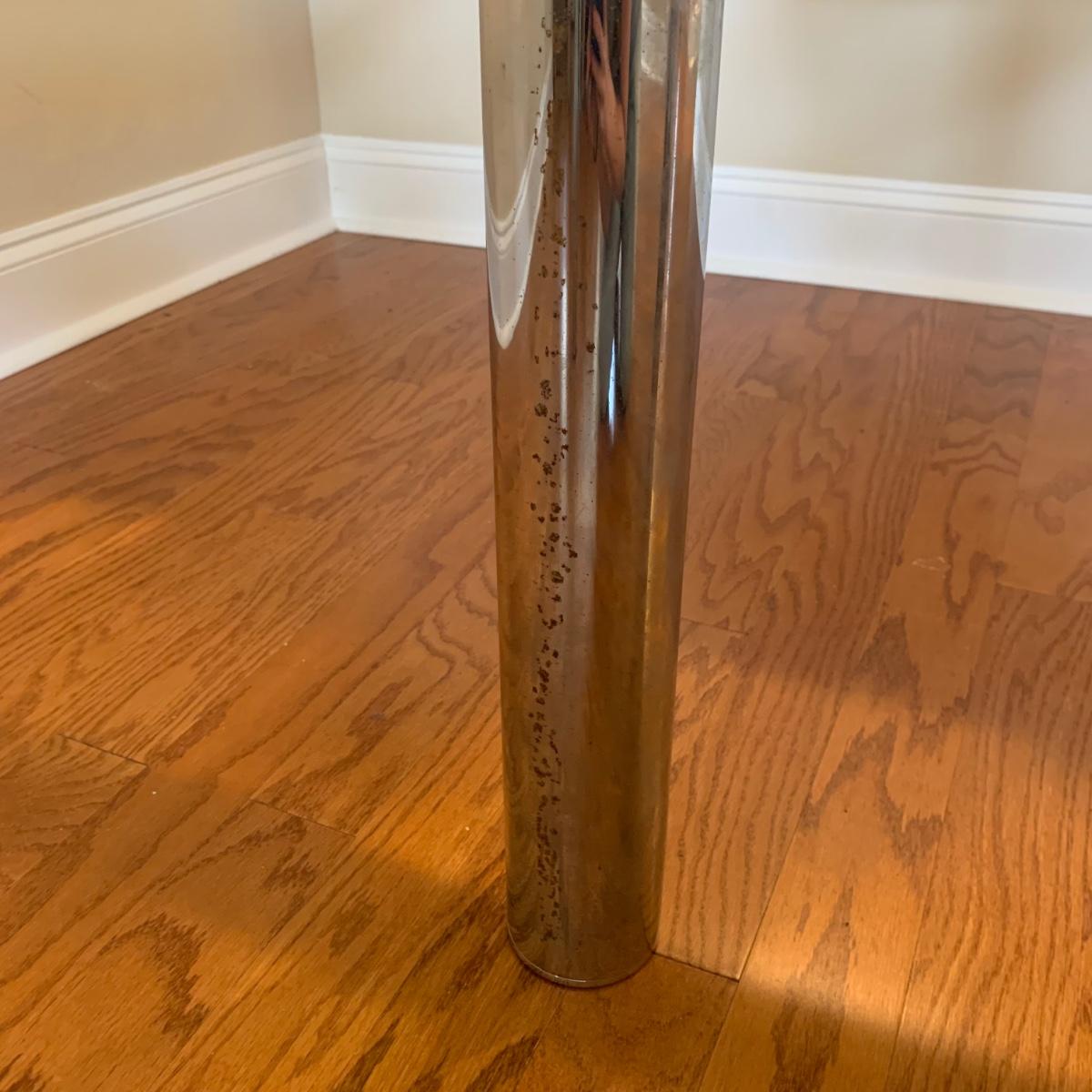 Gorgeous modern glass top dining table on a metal base. Table measures 72” x 42.25” x 29”H. Glass top is not attached to the table, glass top sits on frame and can be removed without tools for transport. Some small rust spots are seen on the metal. The chairs are NOT included in this lot, but can be found in lot 122.