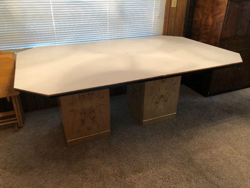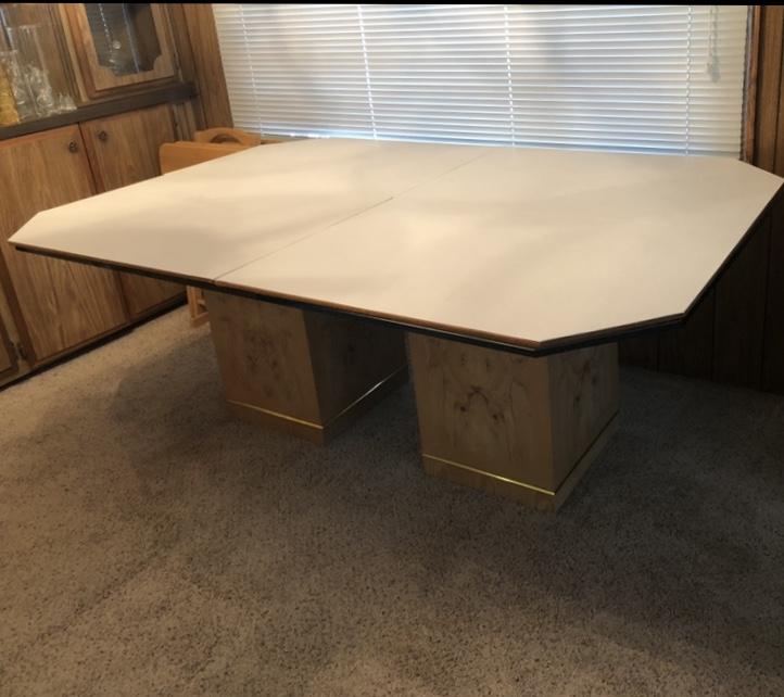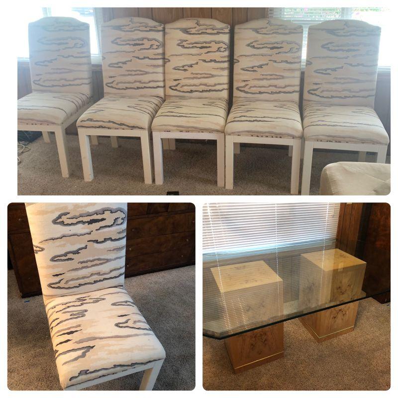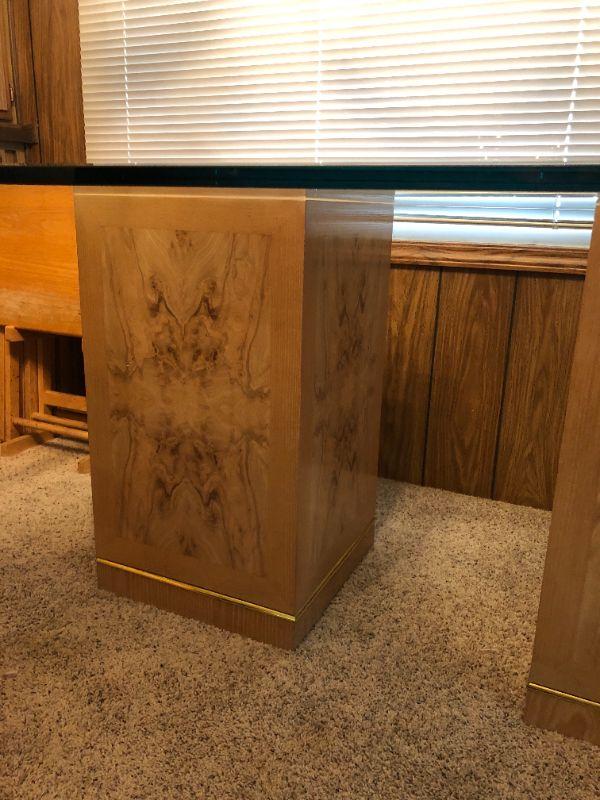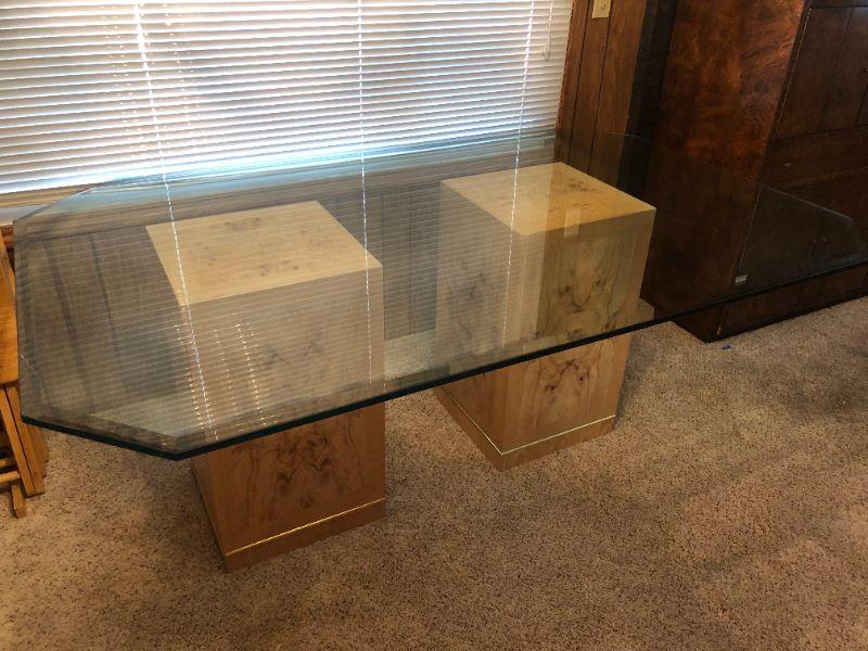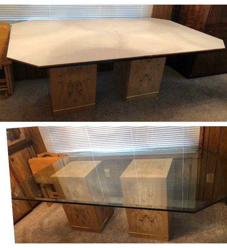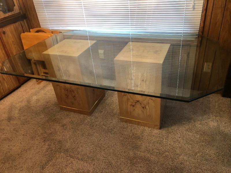 Elegant Glass Top Bi-pedestal Dining Table with 8 chairs. Glass top protector included.