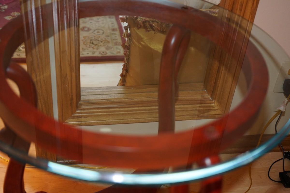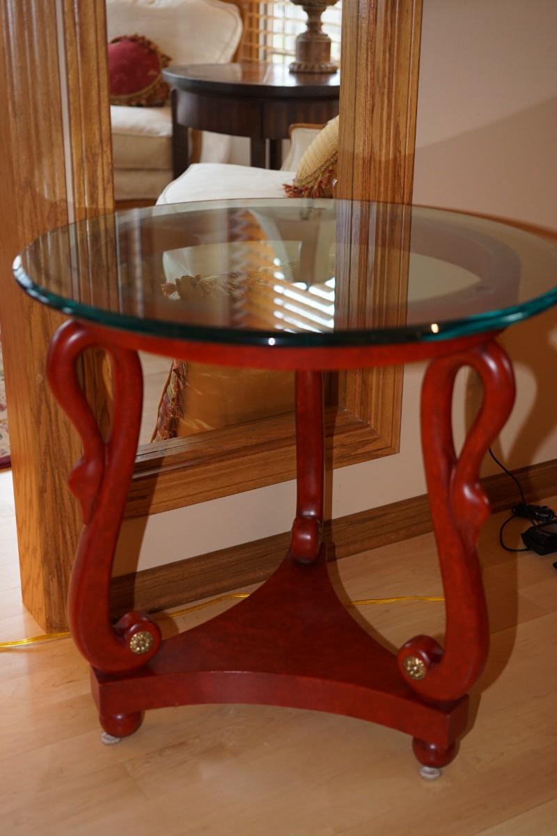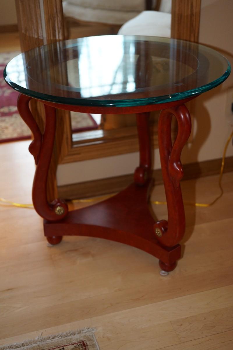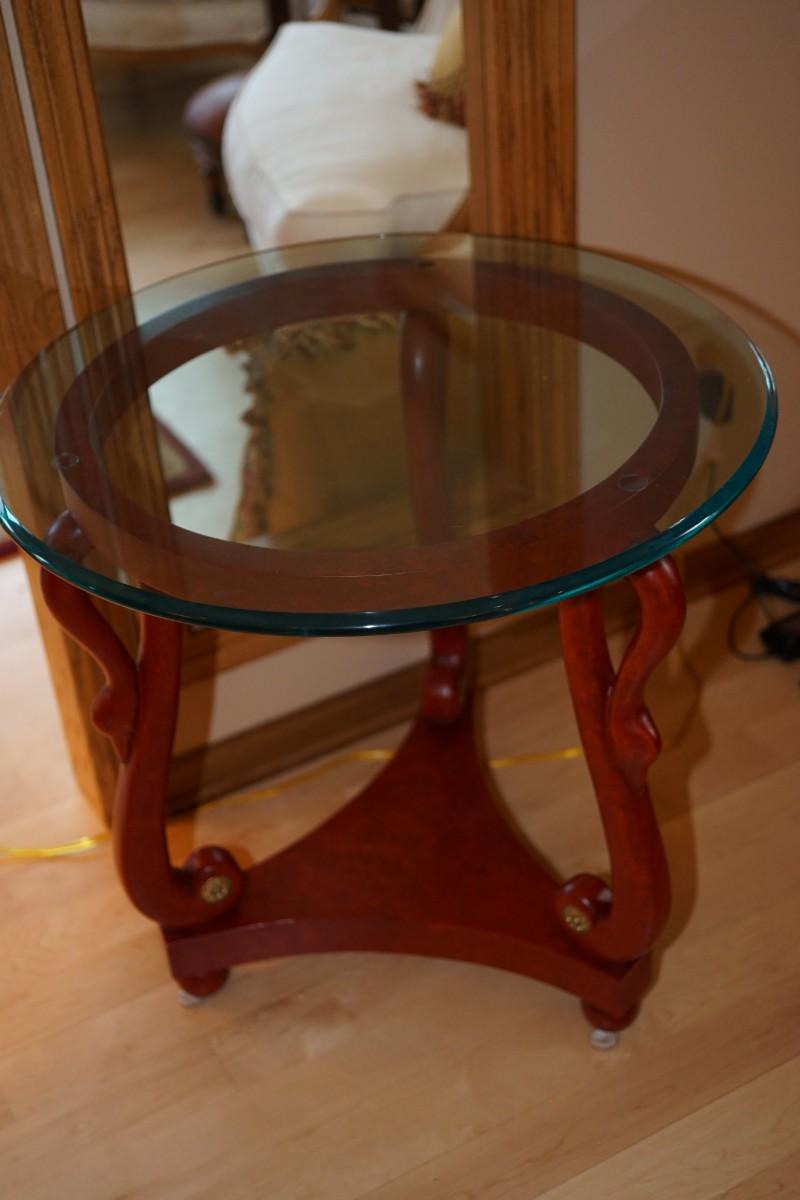 Very classic style end table. Round bevel glass top.