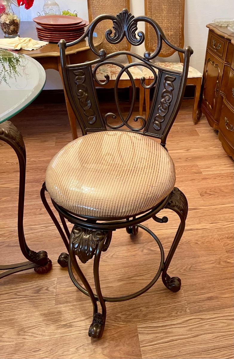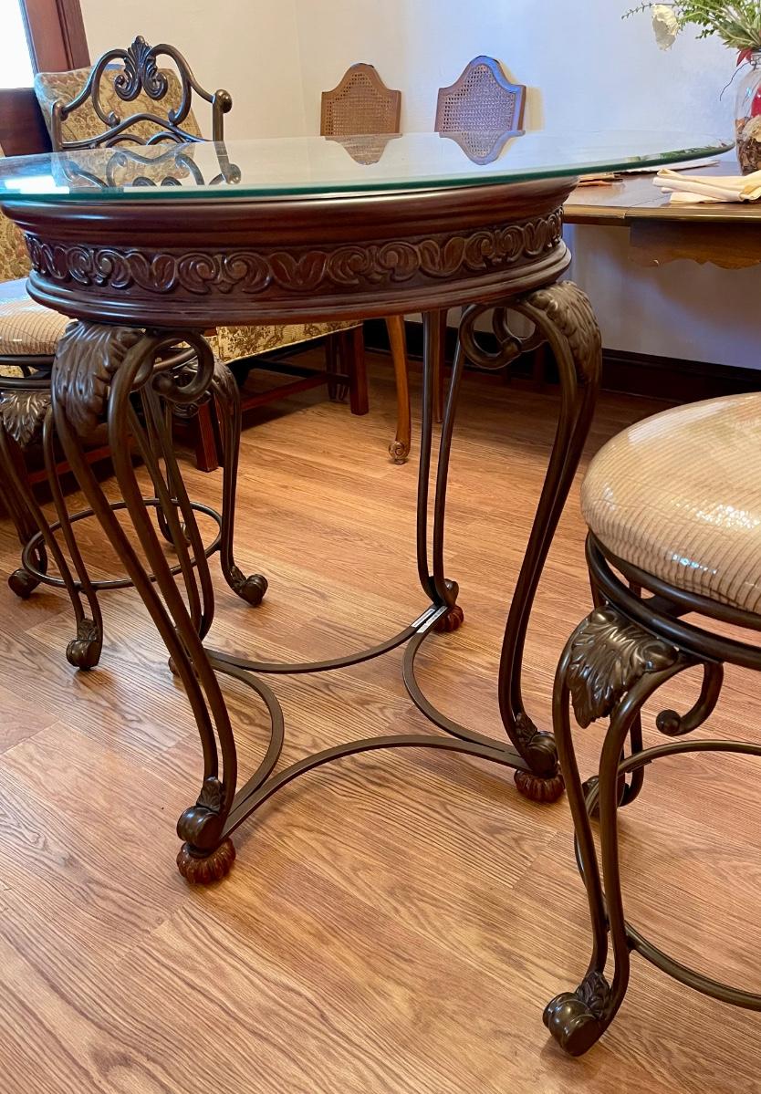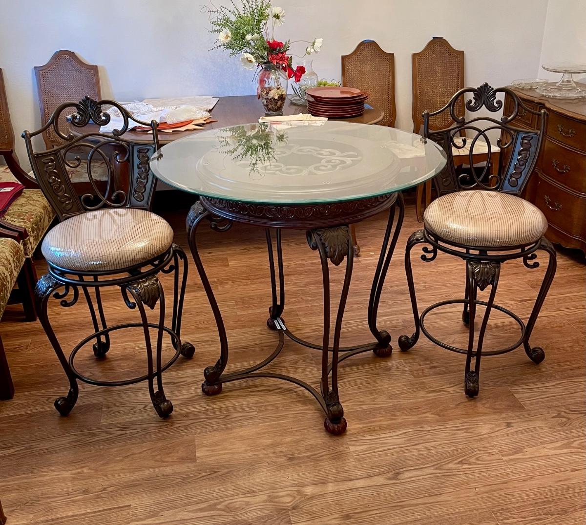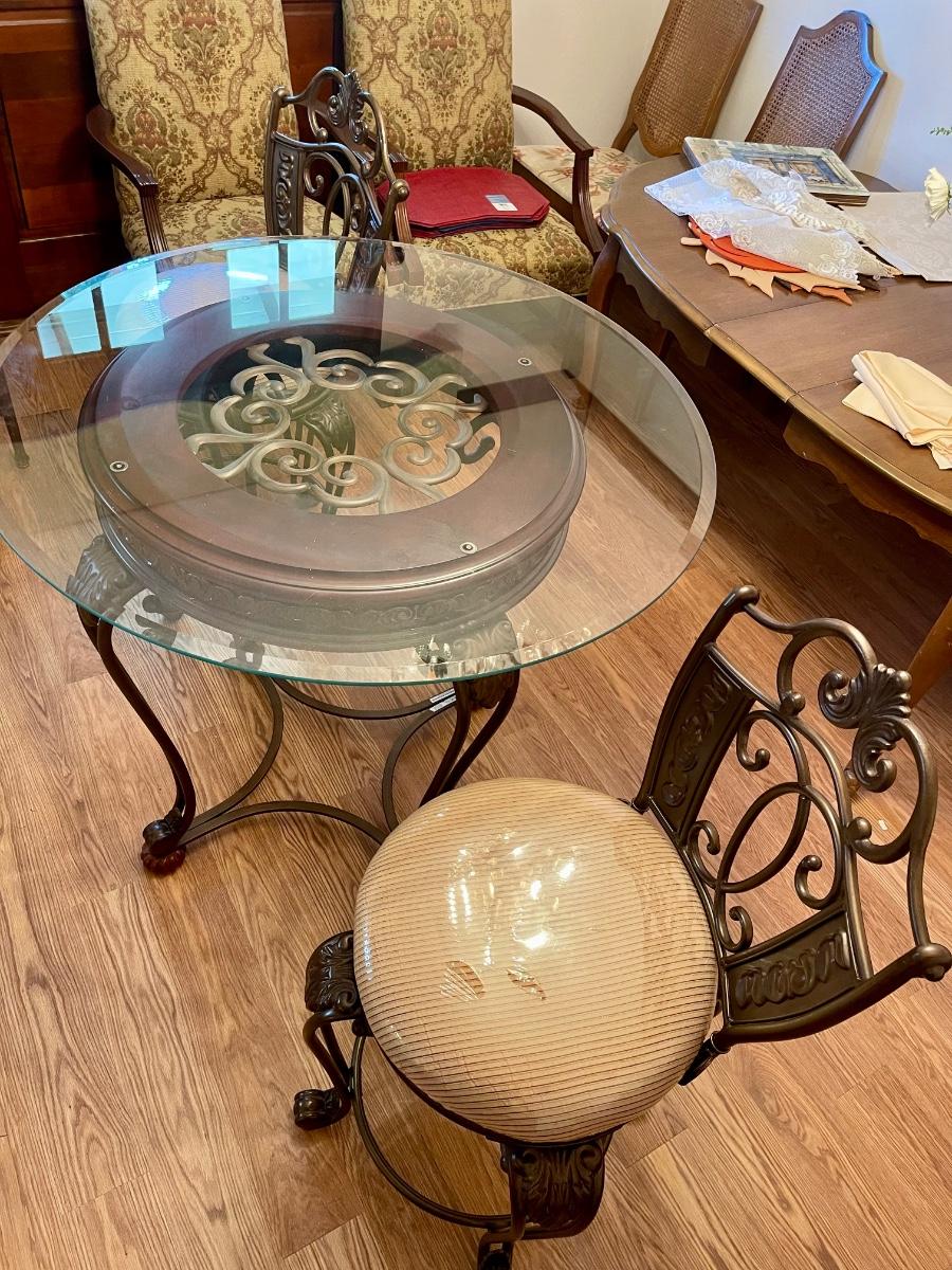 Glass top table with metal base. Comes with 3 barstools. 2 match the table, 3 barstool is a bonus chair 36" tall and 40" wide