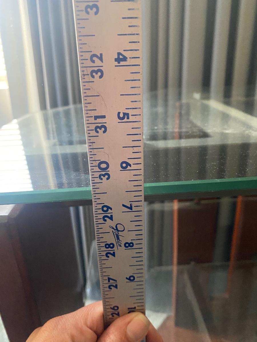 Glass Top Media TV Corner Table. Glass top with two glass shoves. Angled back for setting in a corner. In good used condition. Approx. 32"w x 20"d x 29.5"h.