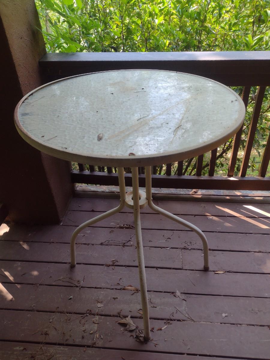Glass Top Metal Base Patio Table. Will need to be cleaned. Lower-level item. Stairs to the main floor.