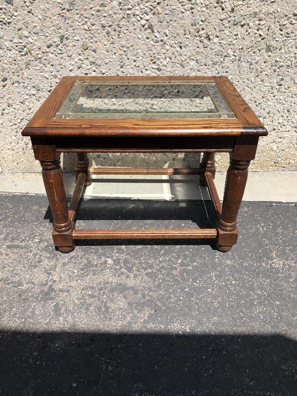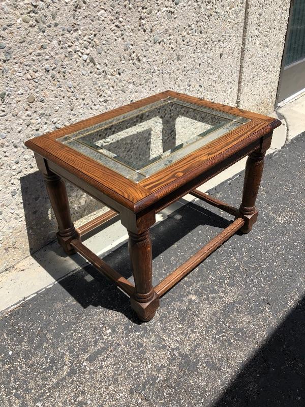 Oak glass top end table. Good Used Condition. Wood has some scrapes and scratches here and there.