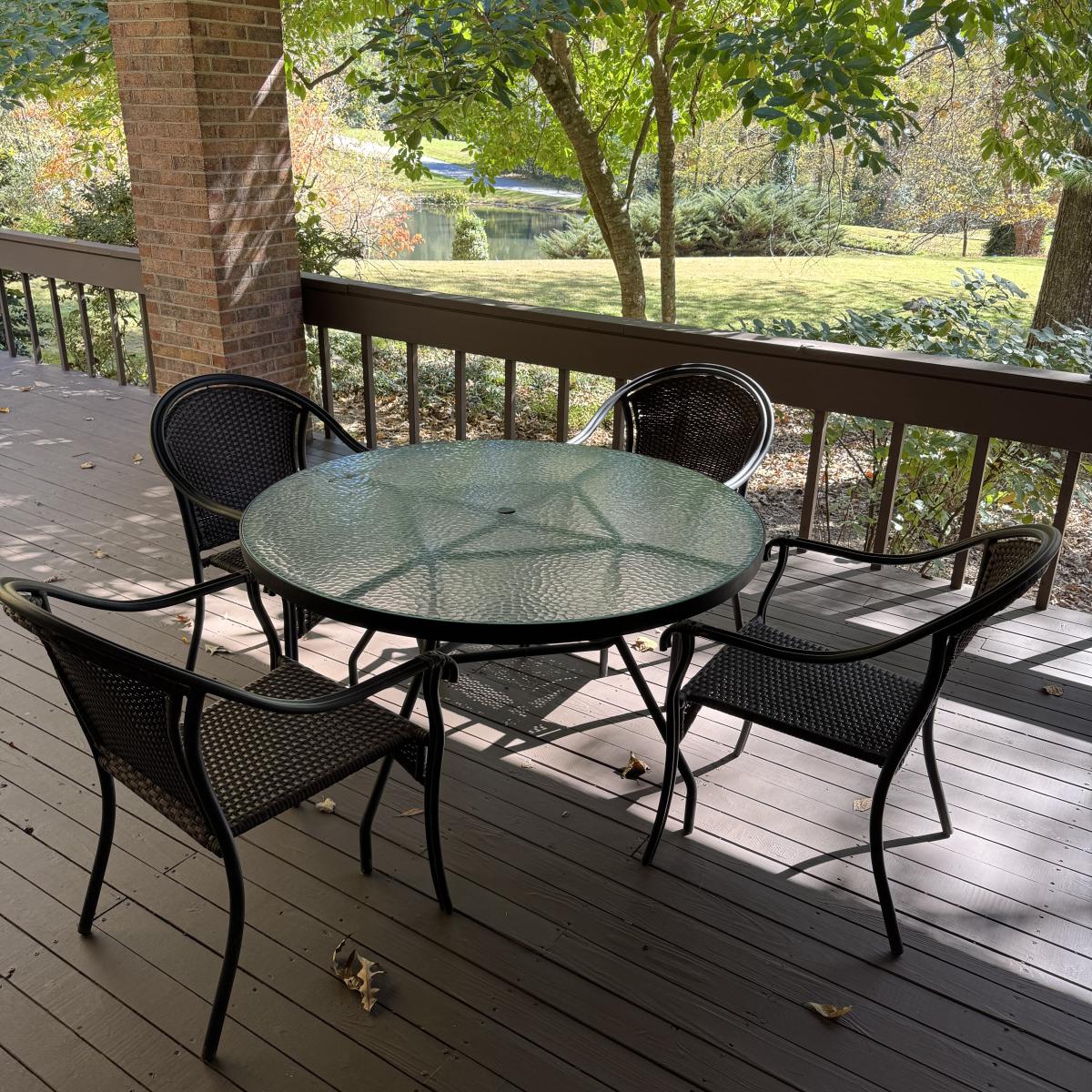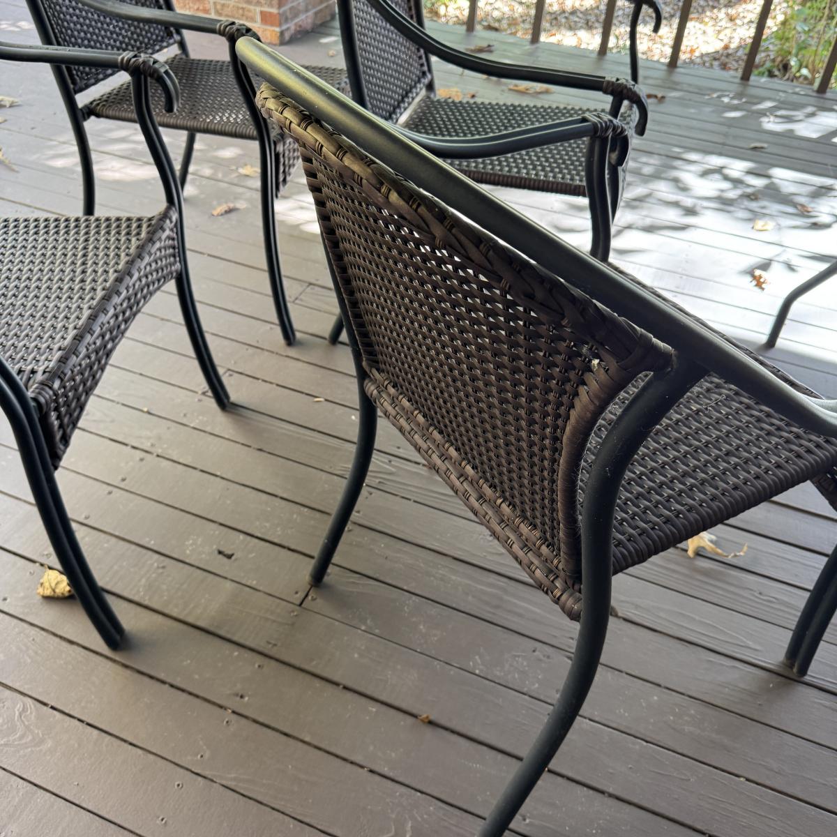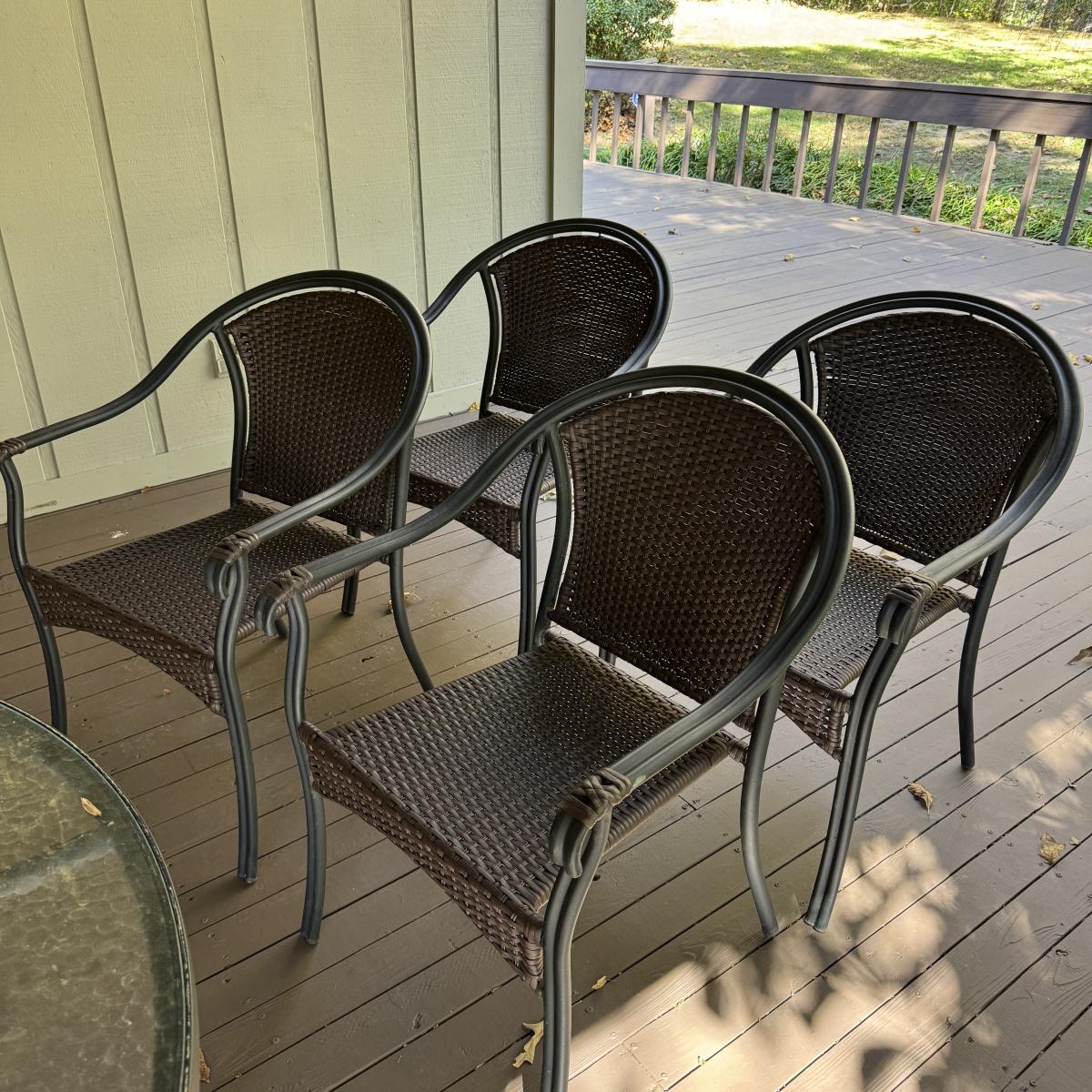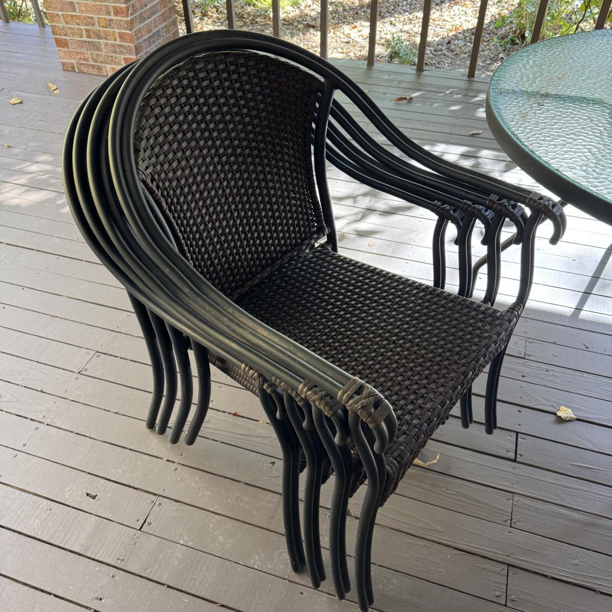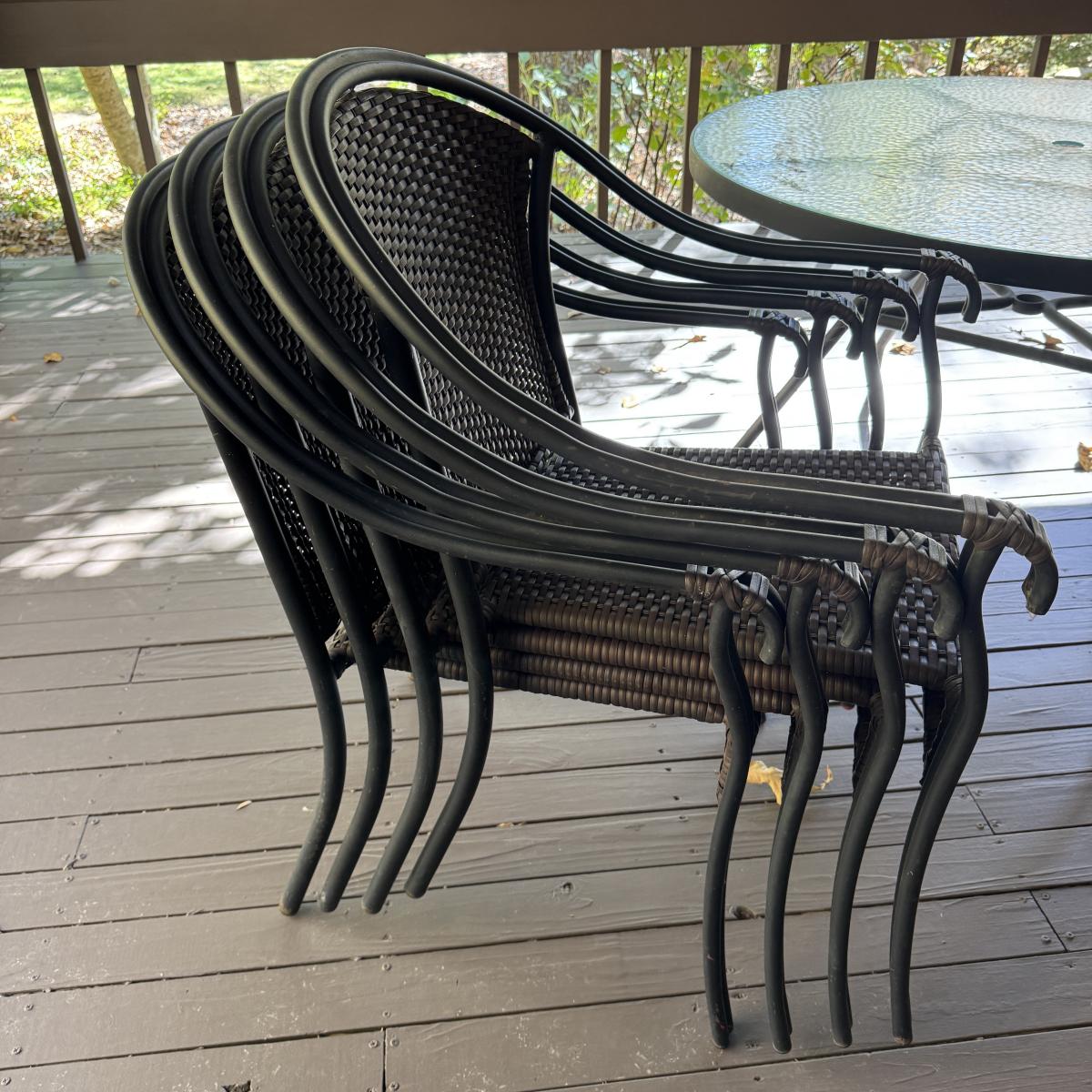 Removable glass top on metal base circular patio table. Has a hole in center to add an umbrella if you’d like. It has been on a covered porch. Some of the edges where glass sits on metal are a little worn. It measures 48”d x 27.5” h. Comes with 4 woven arm chairs. Good condition and nice and sturdy. They are stackable. Chairs measure approximately 24” w x 25” d x 33”h. Seat is 16” h.