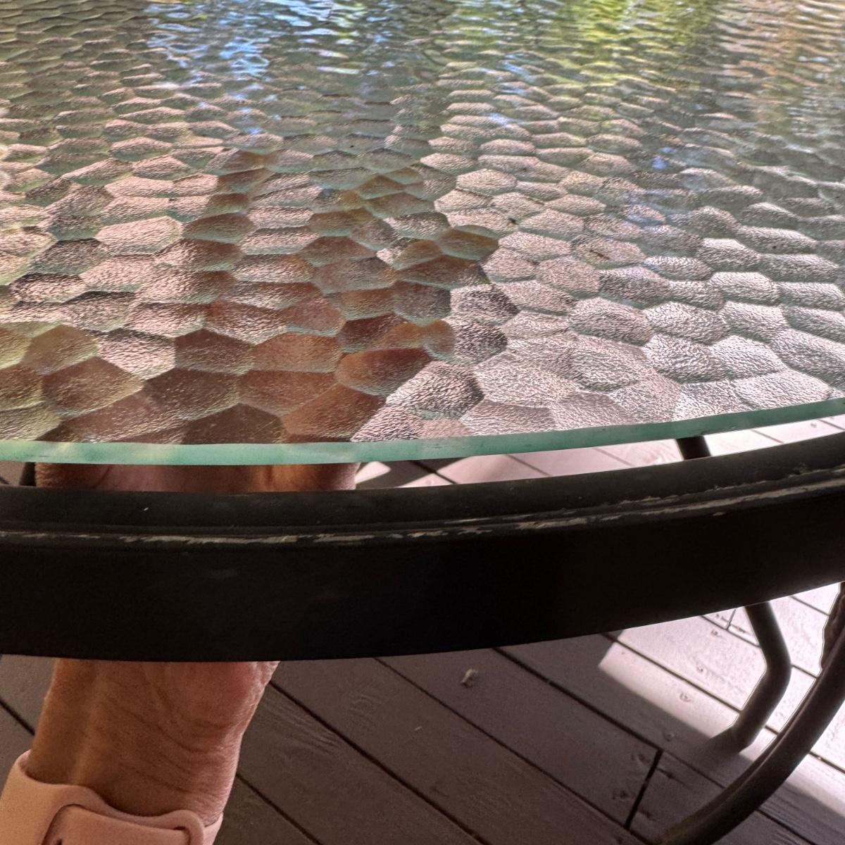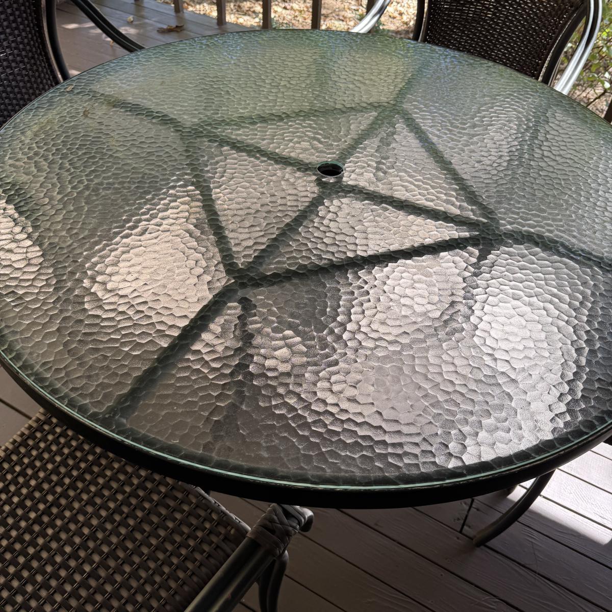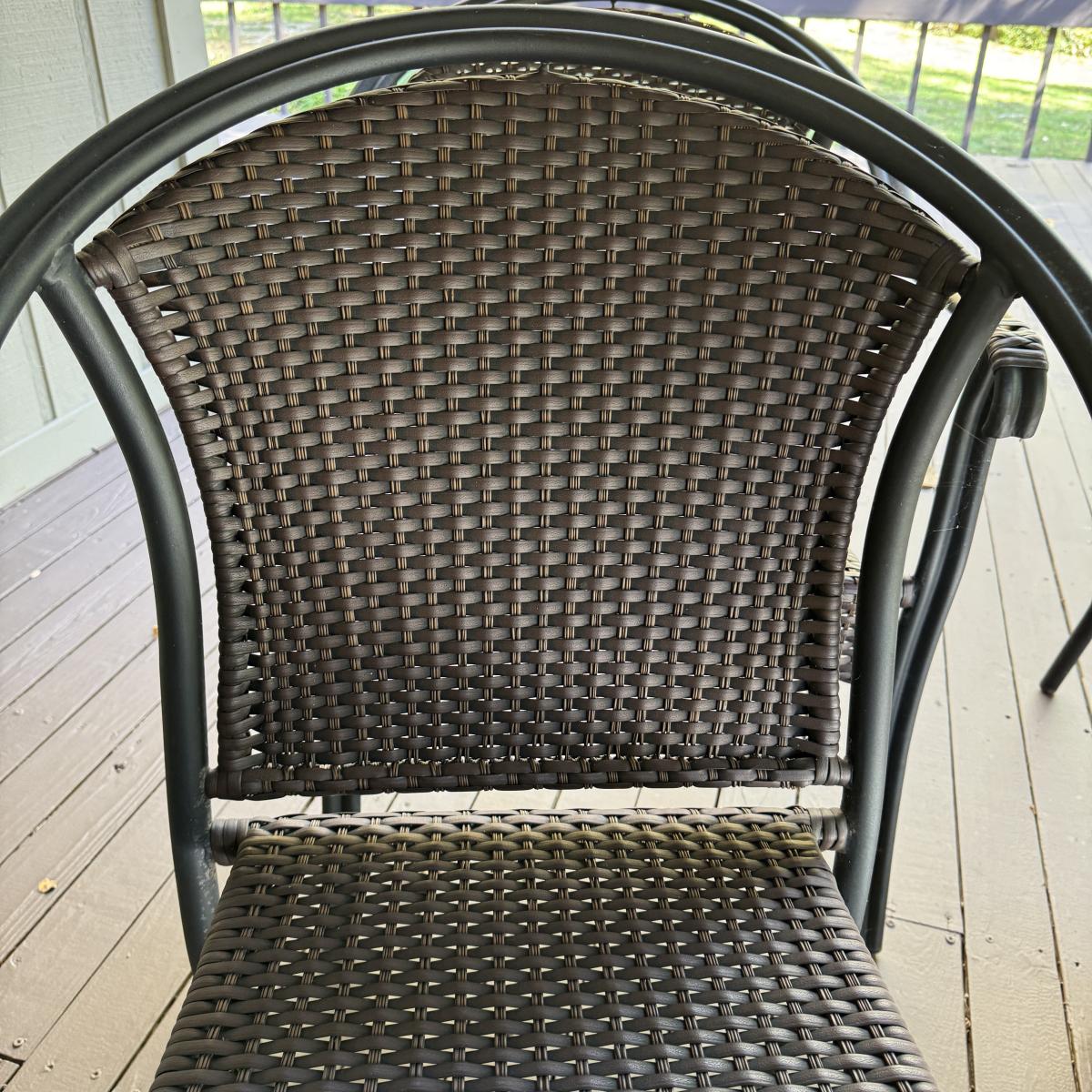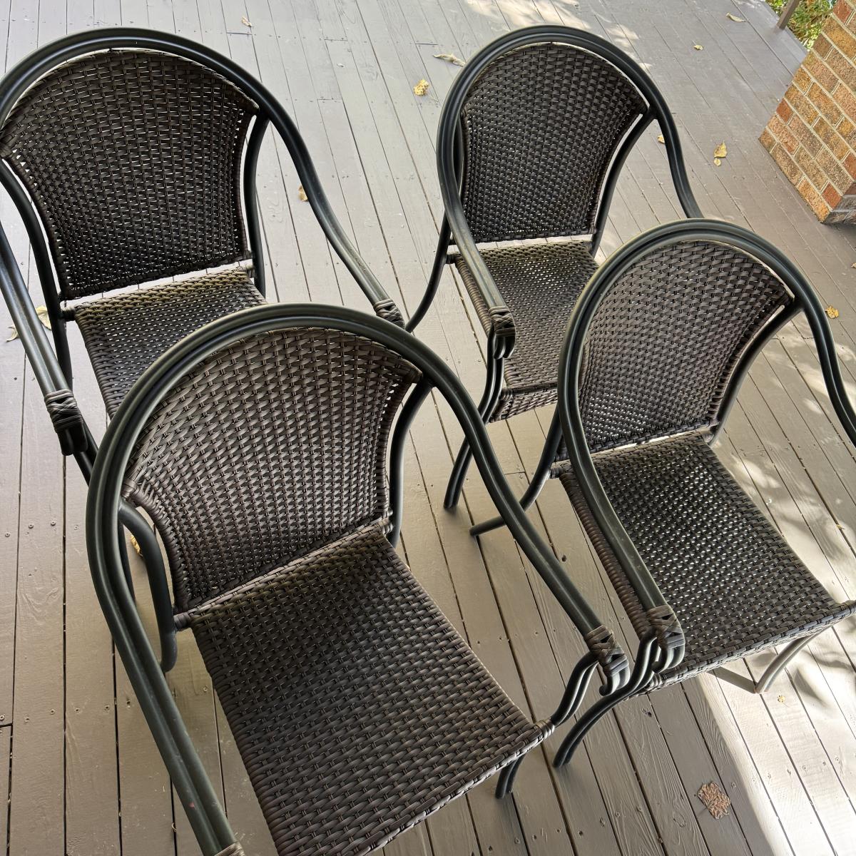 Removable glass top on metal base circular patio table. Has a hole in center to add an umbrella if you’d like. It has been on a covered porch. Some of the edges where glass sits on metal are a little worn. It measures 48”d x 27.5” h. Comes with 4 woven arm chairs. Good condition and nice and sturdy. They are stackable. Chairs measure approximately 24” w x 25” d x 33”h. Seat is 16” h.
