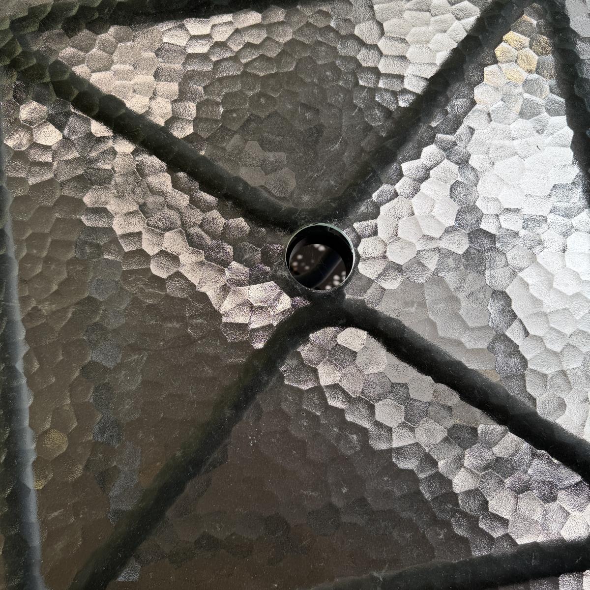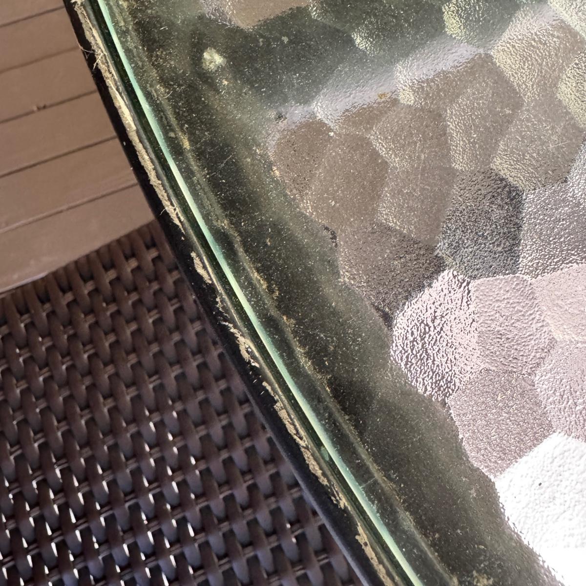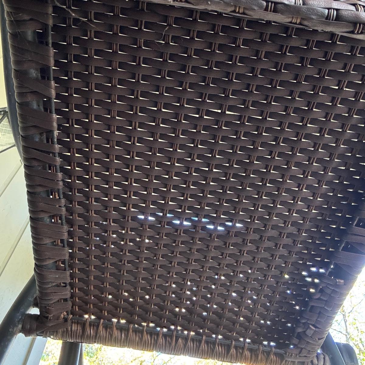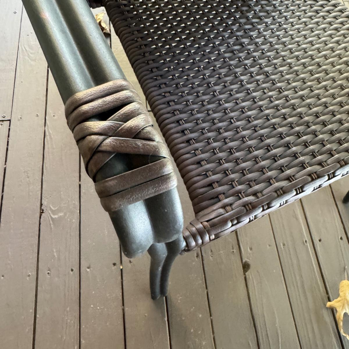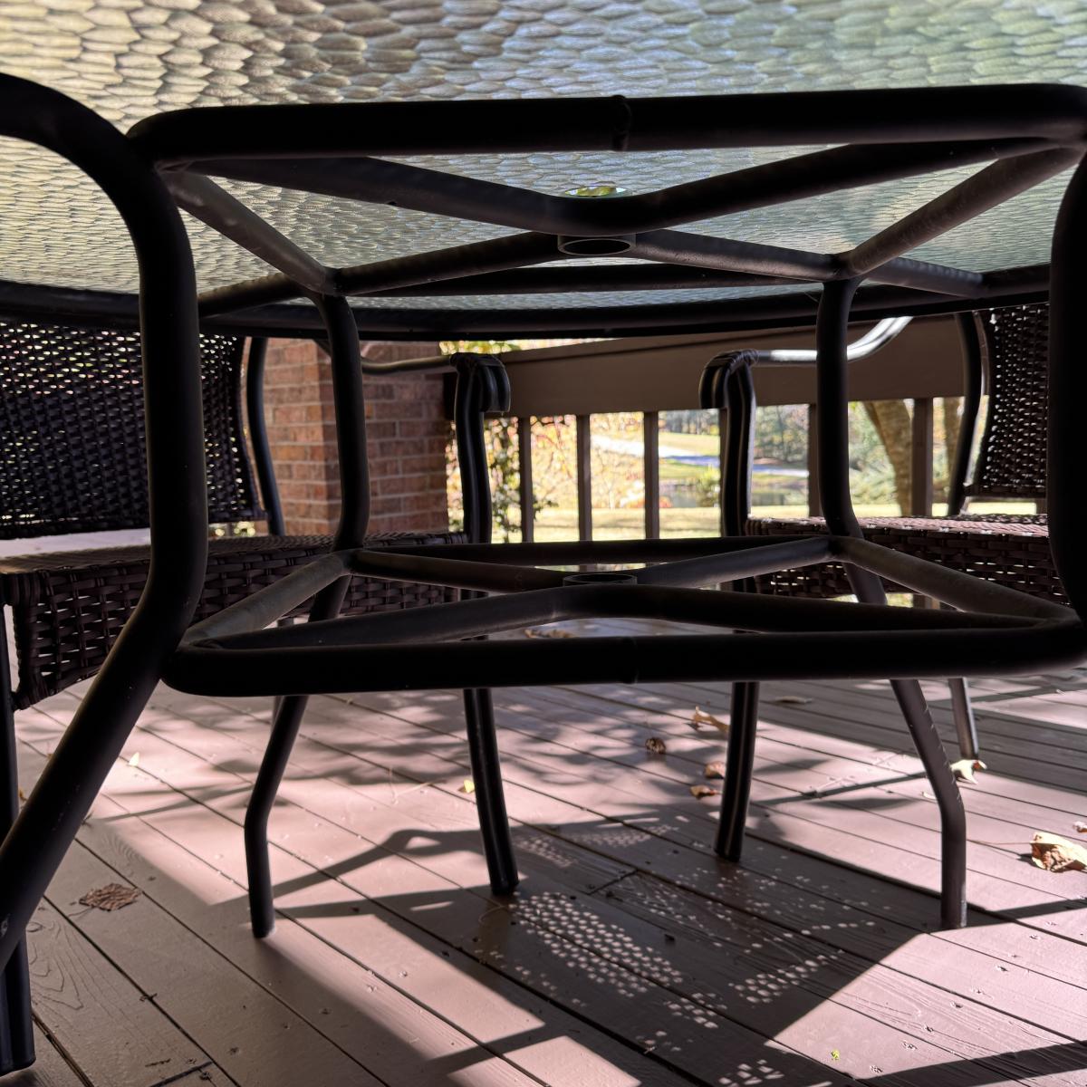 Removable glass top on metal base circular patio table. Has a hole in center to add an umbrella if you’d like. It has been on a covered porch. Some of the edges where glass sits on metal are a little worn. It measures 48”d x 27.5” h. Comes with 4 woven arm chairs. Good condition and nice and sturdy. They are stackable. Chairs measure approximately 24” w x 25” d x 33”h. Seat is 16” h.
