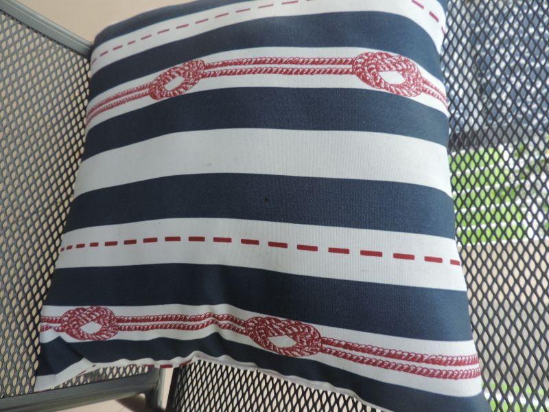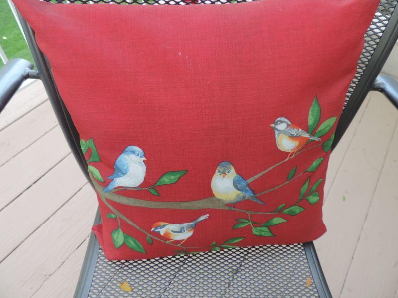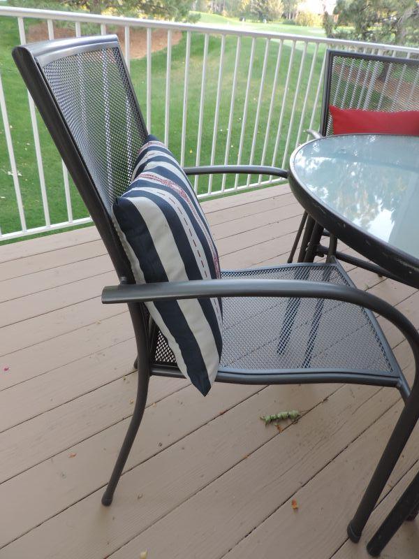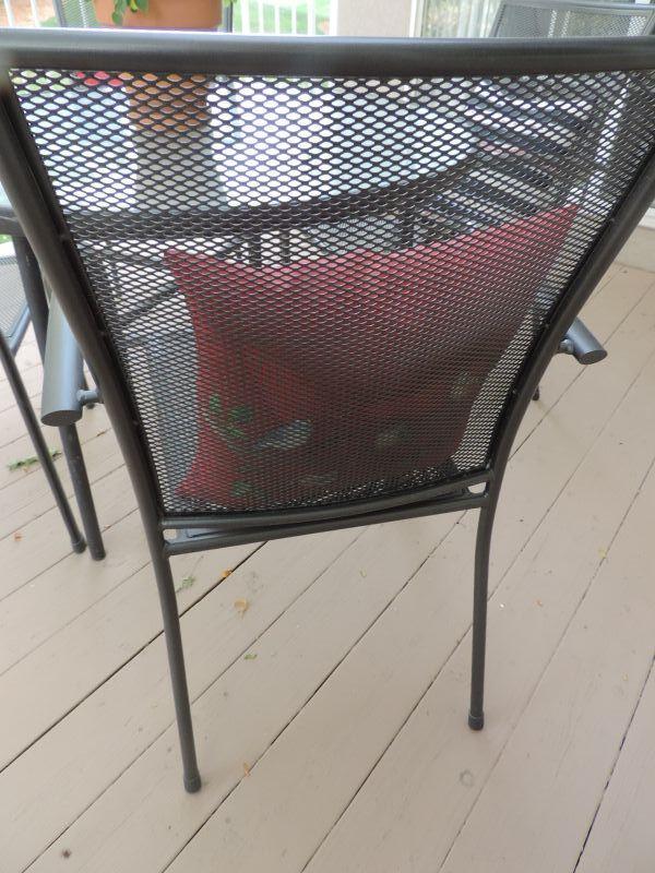 IRON CHAIRS AND ROUND GLASS TOP TABLE. COMES WITH 4 DECORATIVE THROW PILLOWS