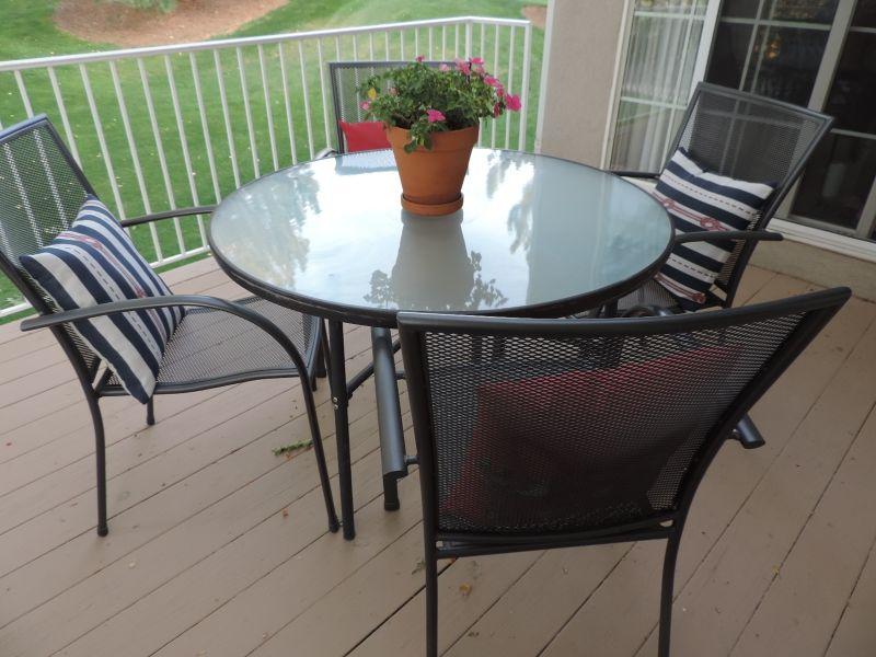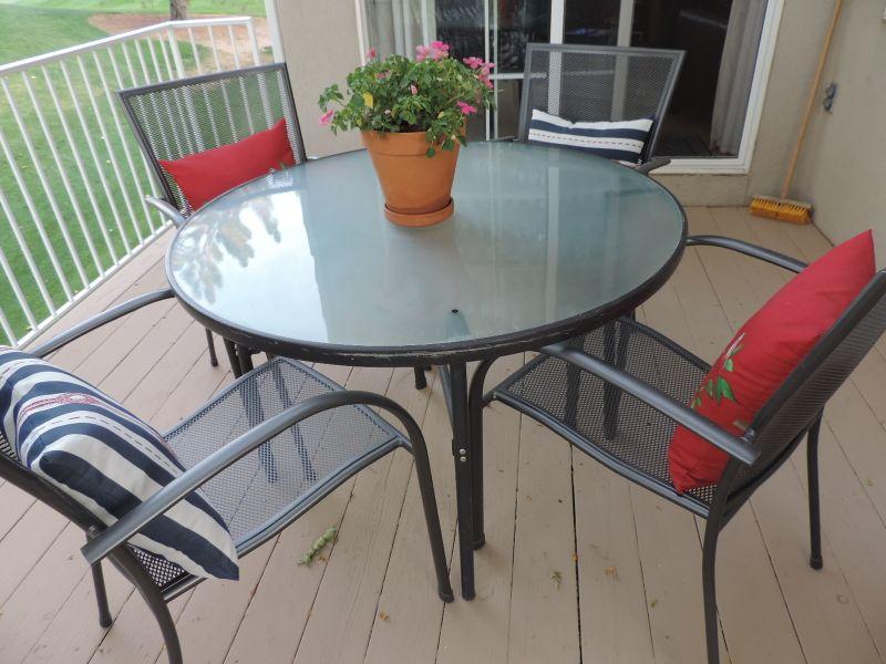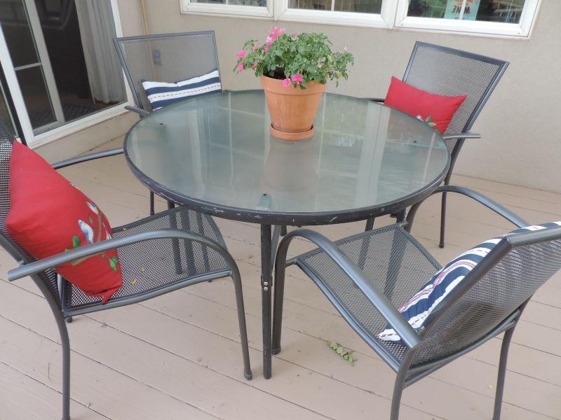 LOT 160  GLASS TOP PATIO TABLE AND 4 CHAIRS