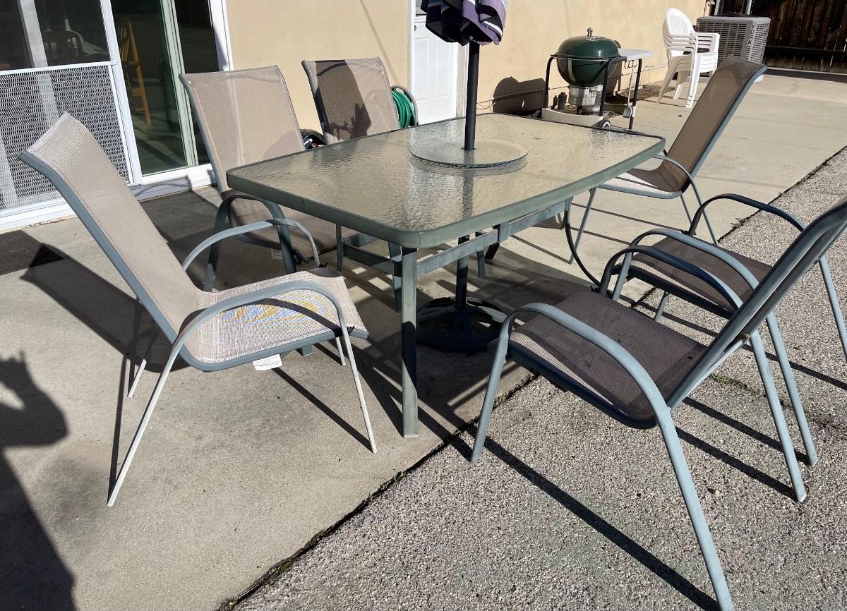 Metal and glass table with hole for umbrella (umbrella is not included). 6 chairs of fabric and metal. All in good condition. *NEEDS TO BE PICKED UP BY 2/11*