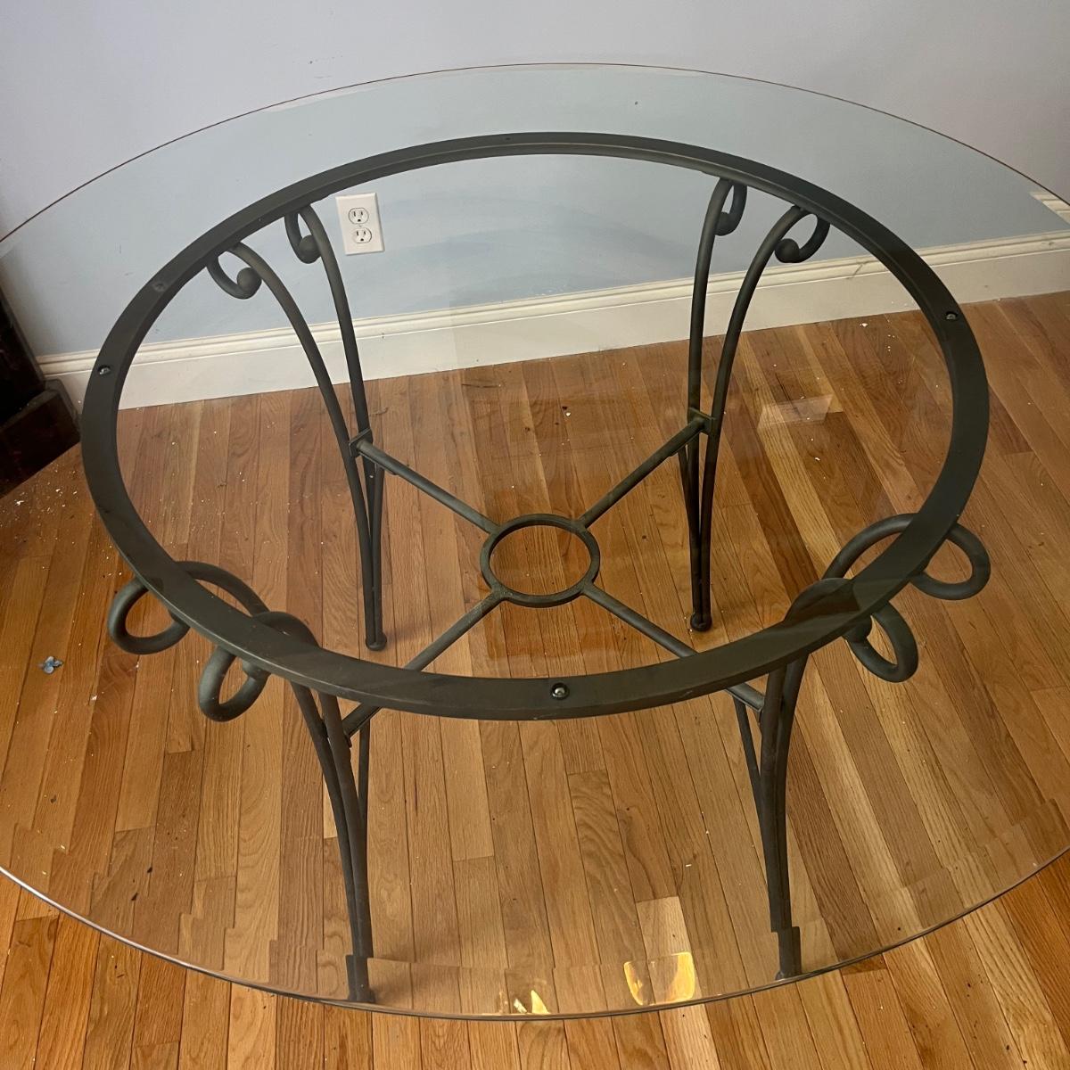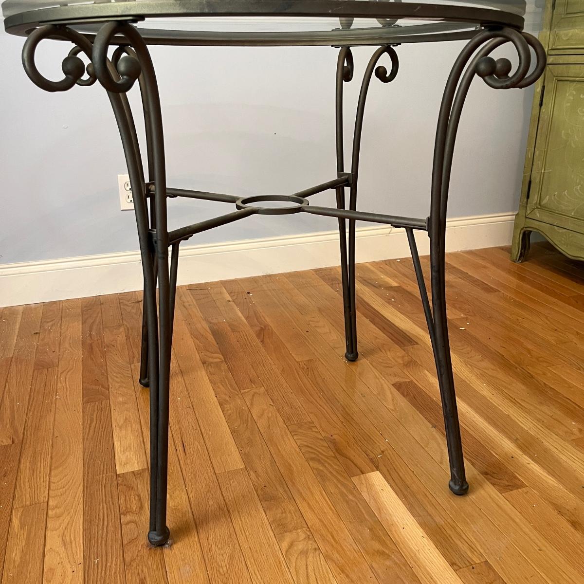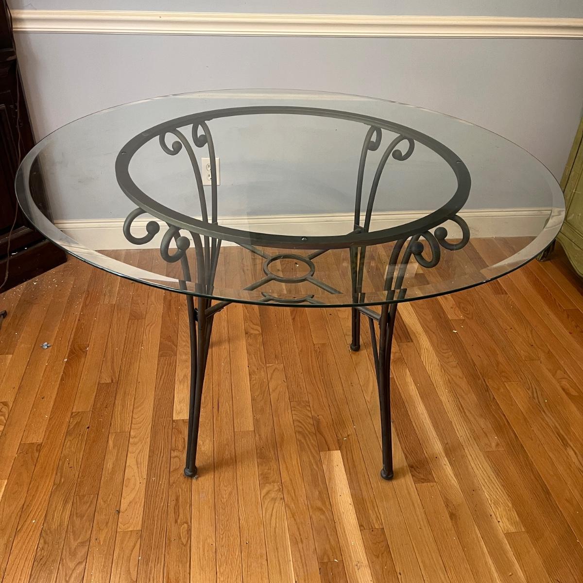 Lot includes a beveled glass top table with an iron base. Table measures 45”D x 30”H.