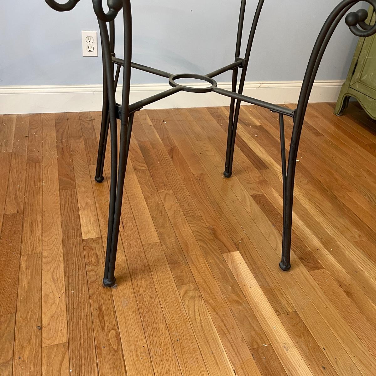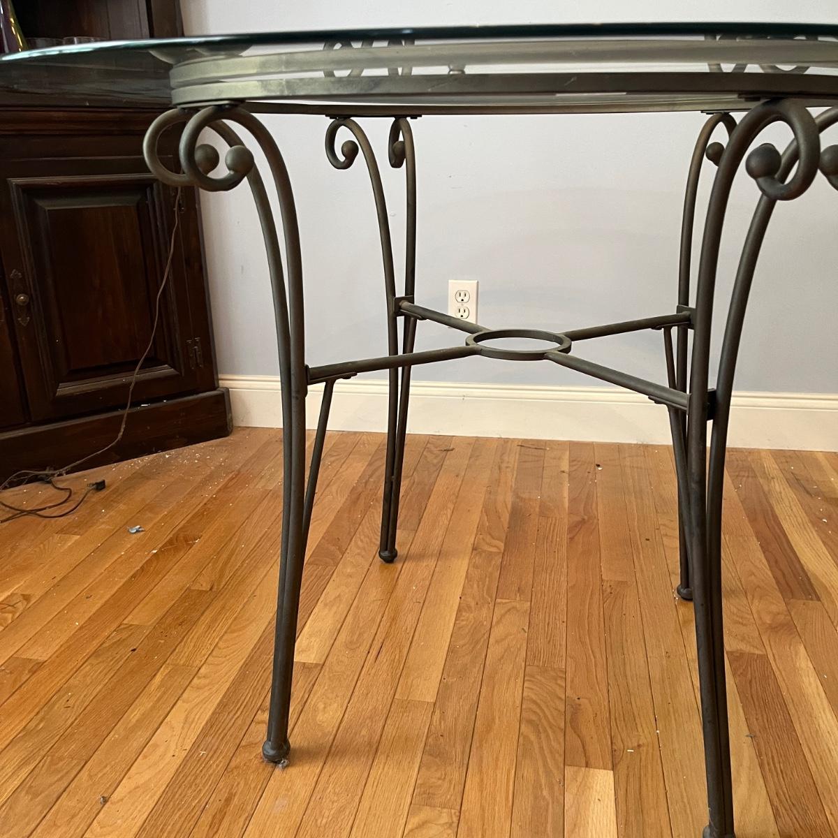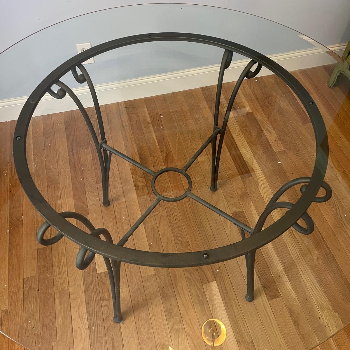 Lot includes a beveled glass top table with an iron base. Table measures 45”D x 30”H.