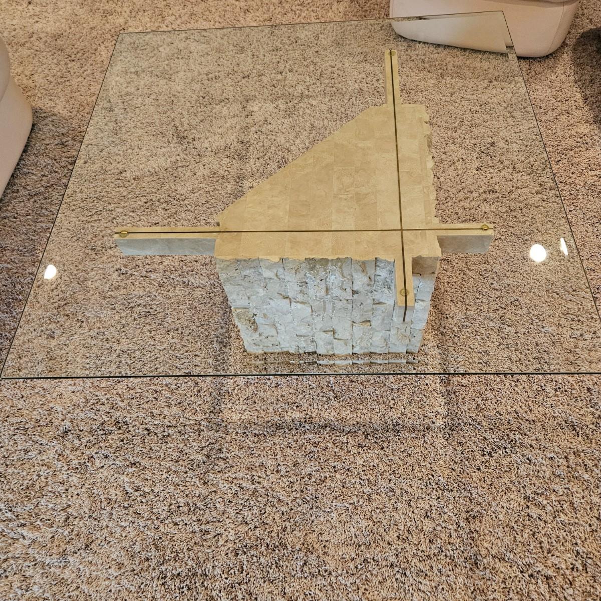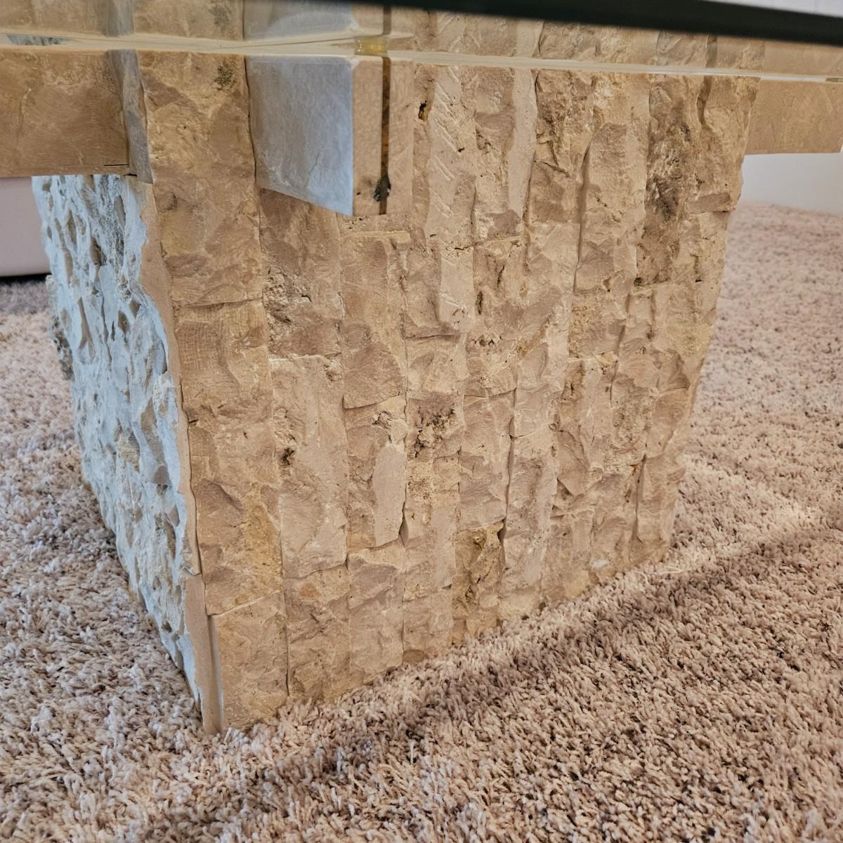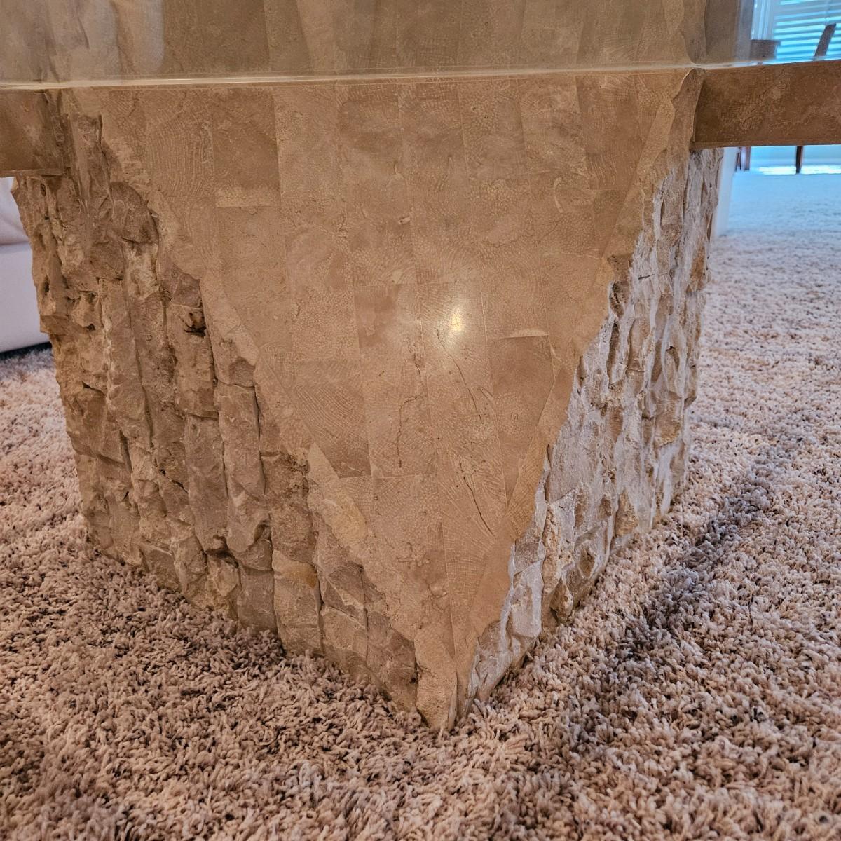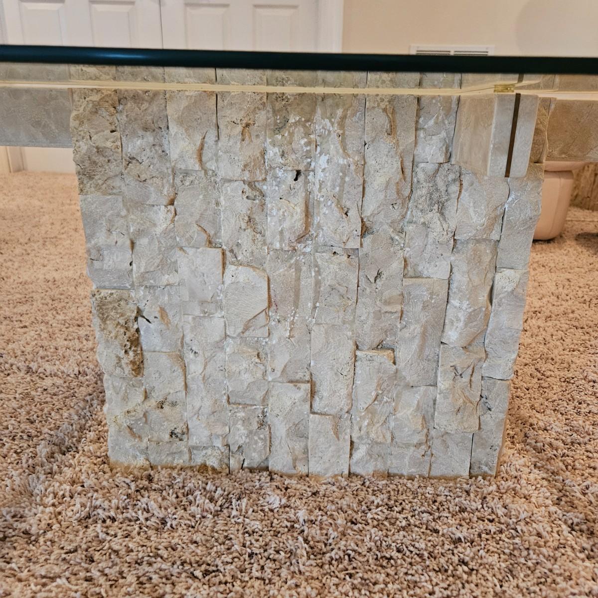 A tempered glass top coffee table that has a beveled edge and a modern stone style base. It appears the base is a resin cast material. The table measures approximately. 38” x 38” x 16.5”H. This table matches two side tables in this auction. The glass top does not separate from the base. Local pickup only. Winning bidder must bring assistance to help move and load this item due to its weight and/or size.