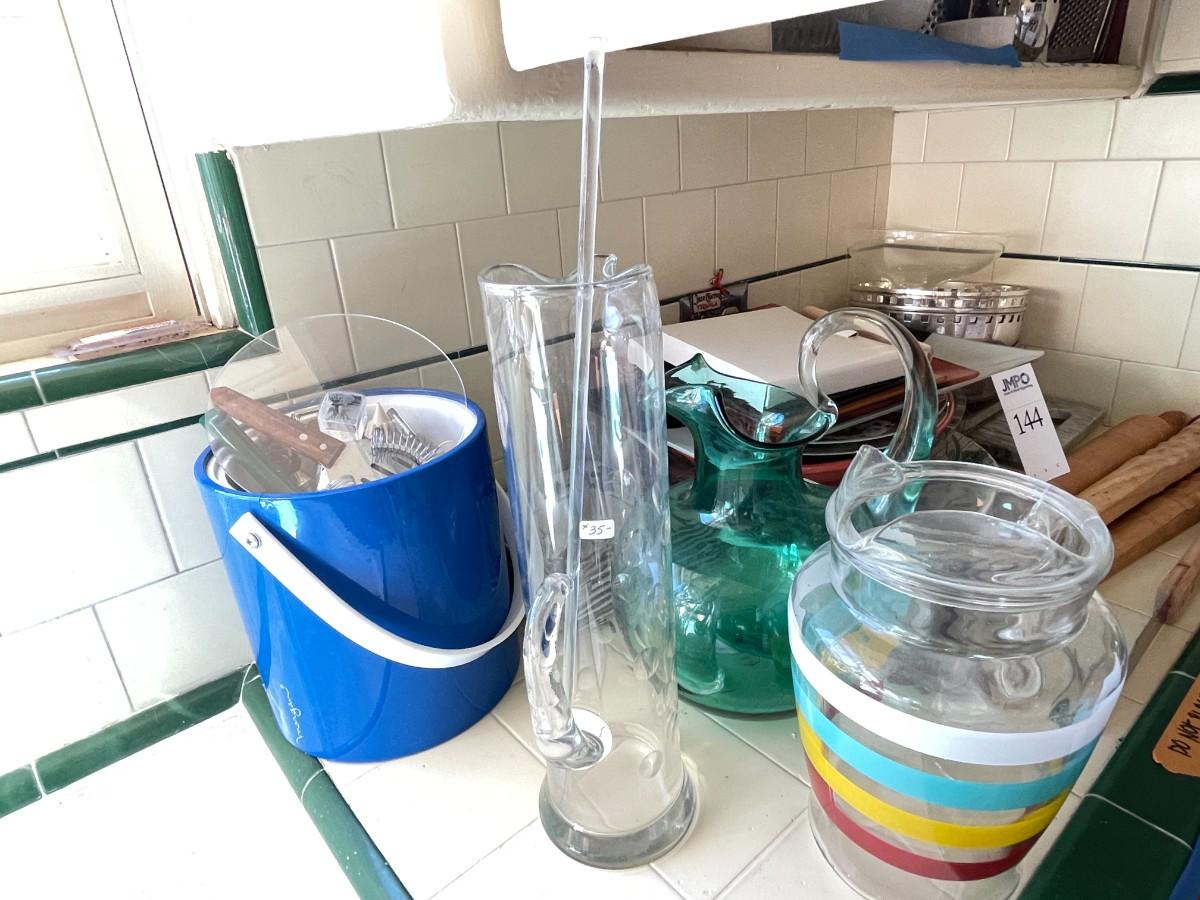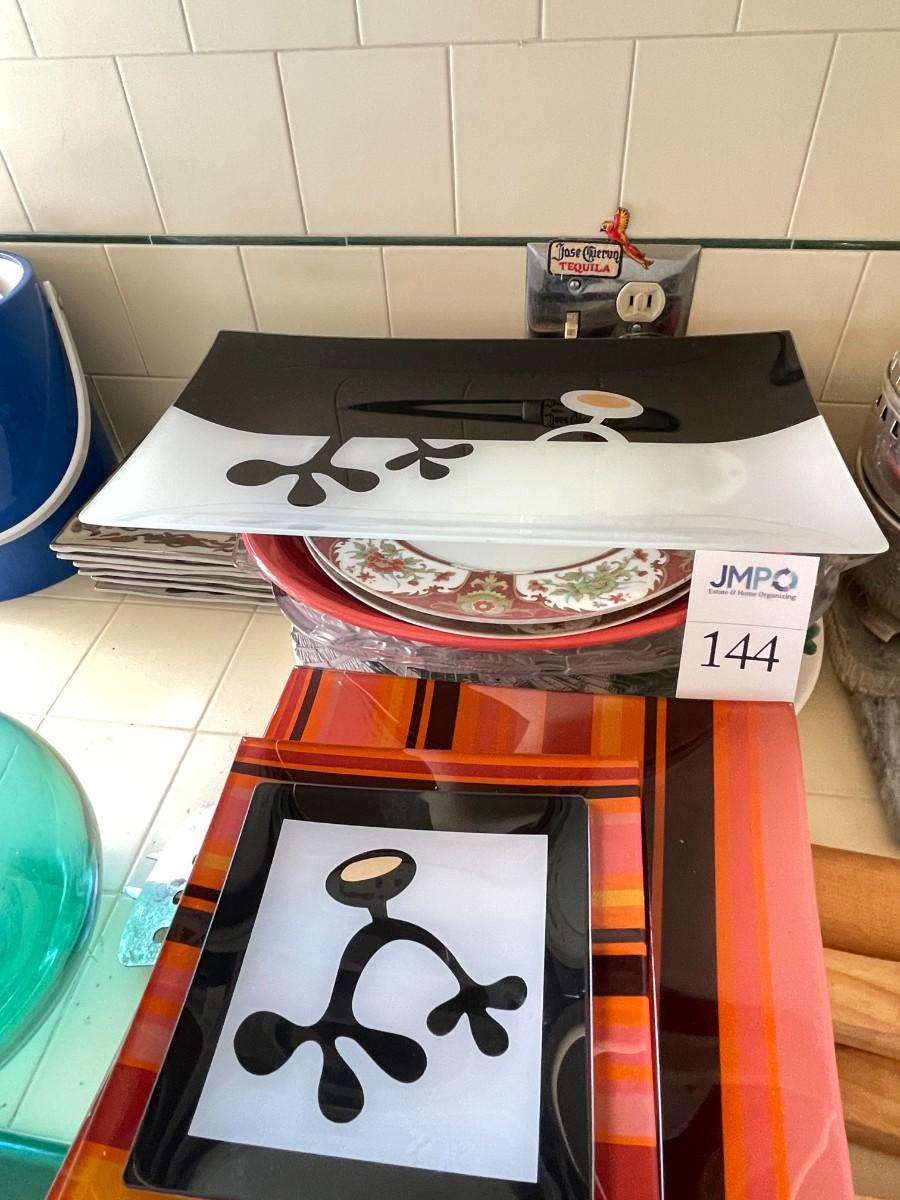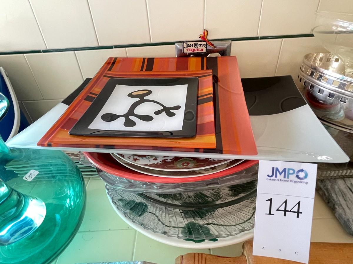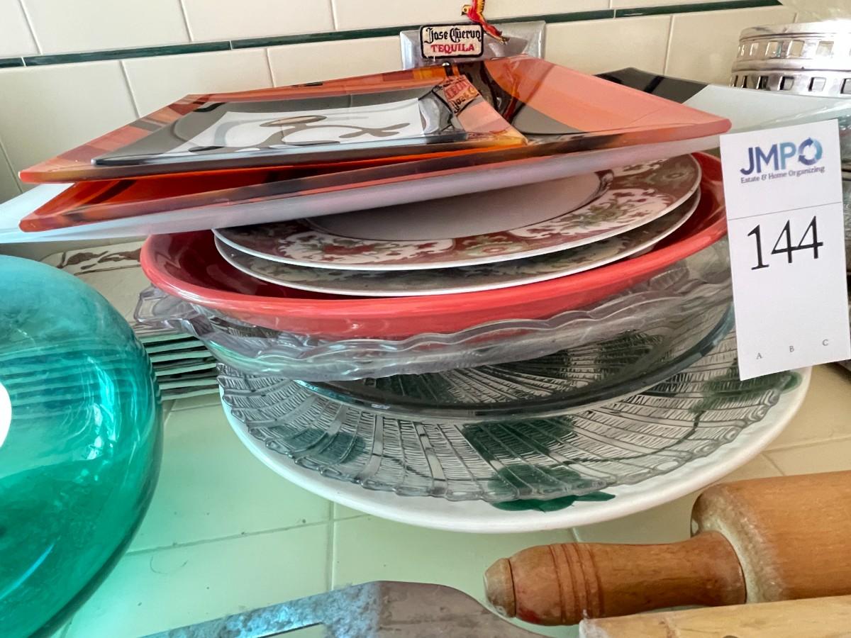 3 rectangular glass serving trays. 6 square small plates, crazing. Serving platters, ice bucket and barware, 3 pitchers and more as shown. Includes BBQ tools