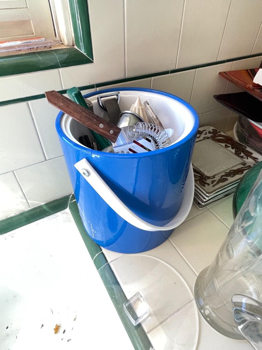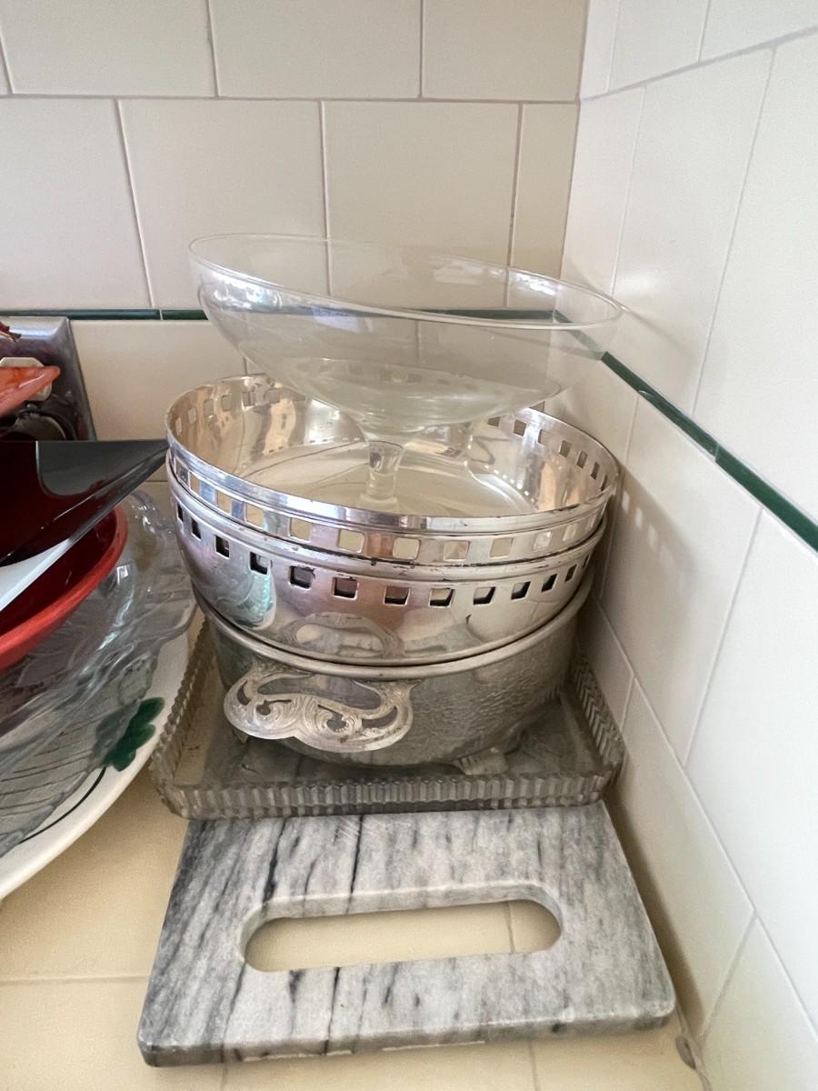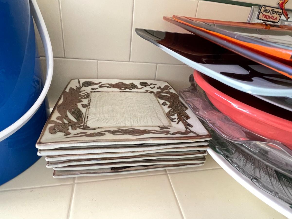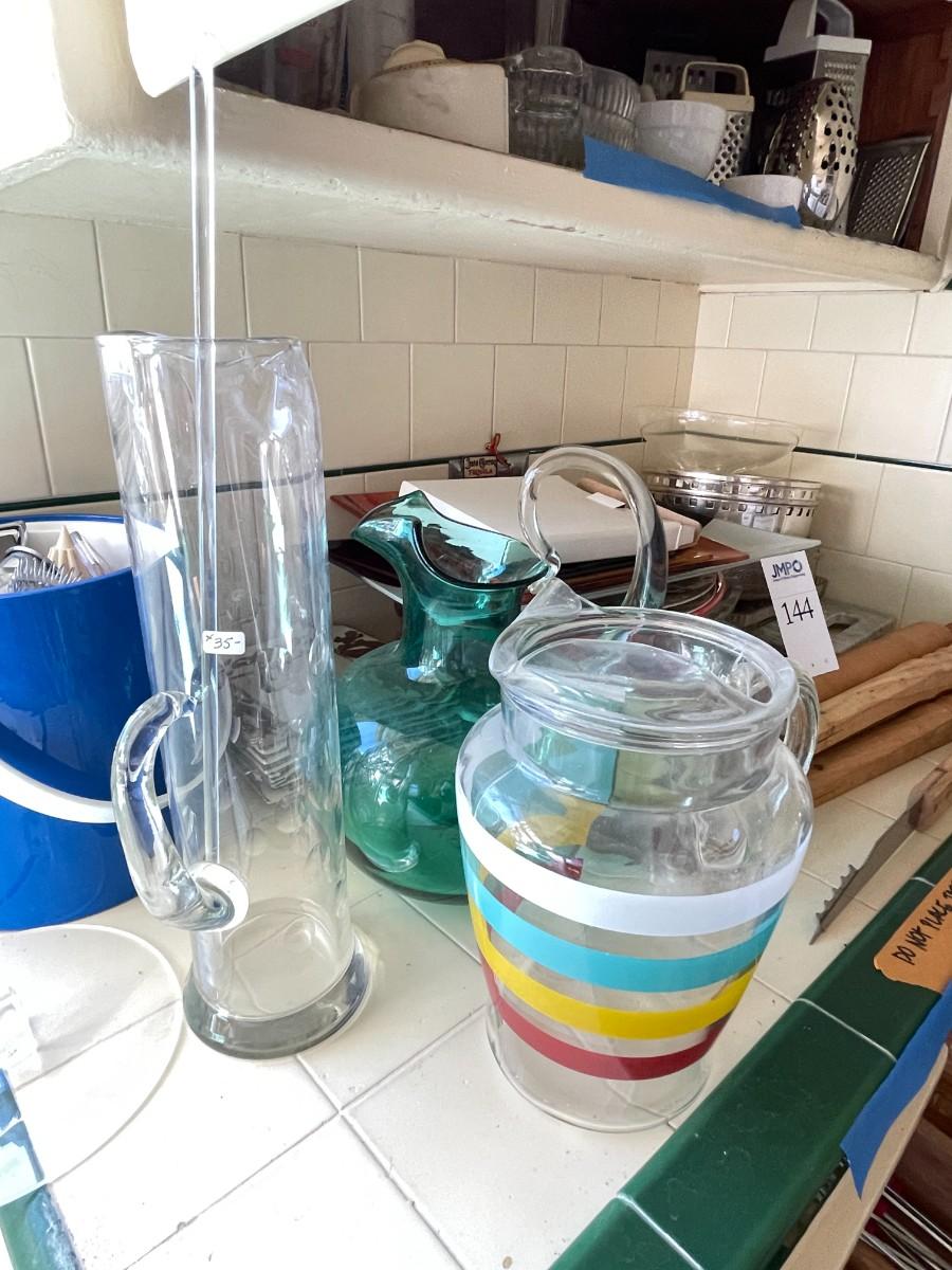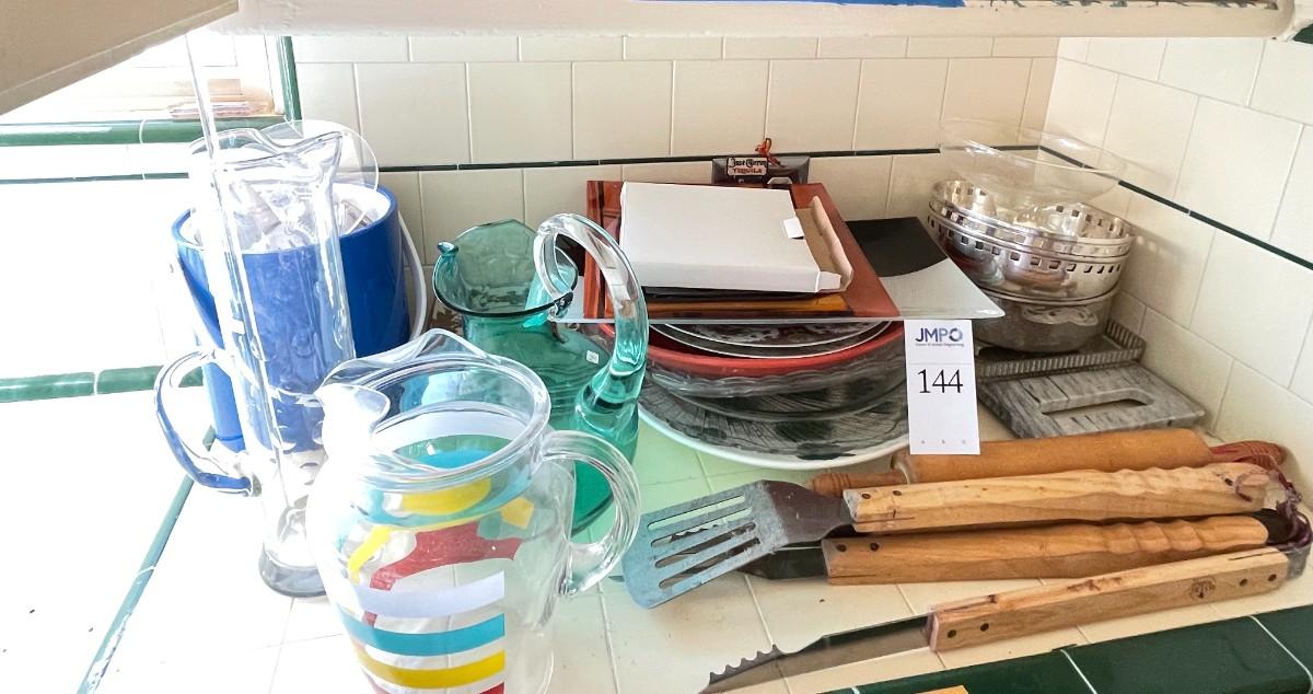 3 rectangular glass serving trays. 6 square small plates, crazing. Serving platters, ice bucket and barware, 3 pitchers and more as shown. Includes BBQ tools