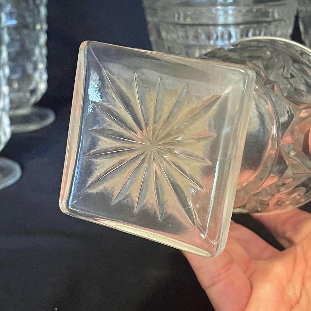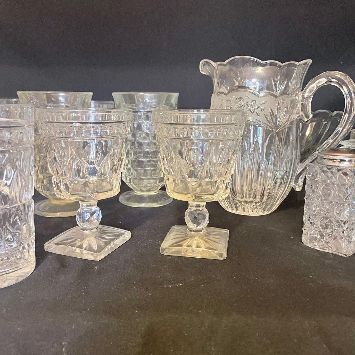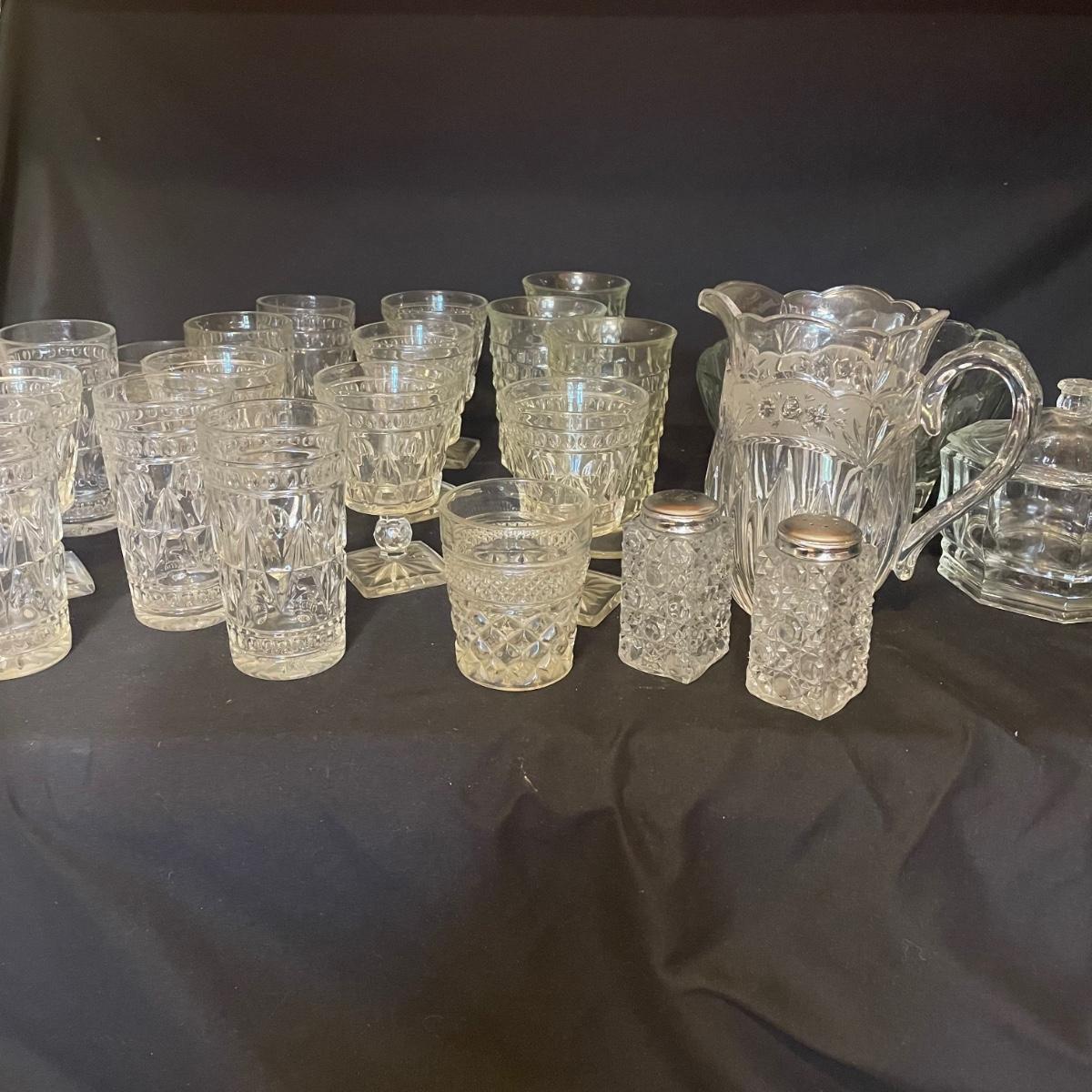 Stylish yet durable, this large glass lot offers plenty of options for elegant entertaining. 6 each of the stemmed glasses and the water glasses, plus 3 larger glasses and two smaller ones. Lot also includes salt and pepper shakers, a pitcher, lidded bowl and an oval footed dish that measures 9” x 12”.