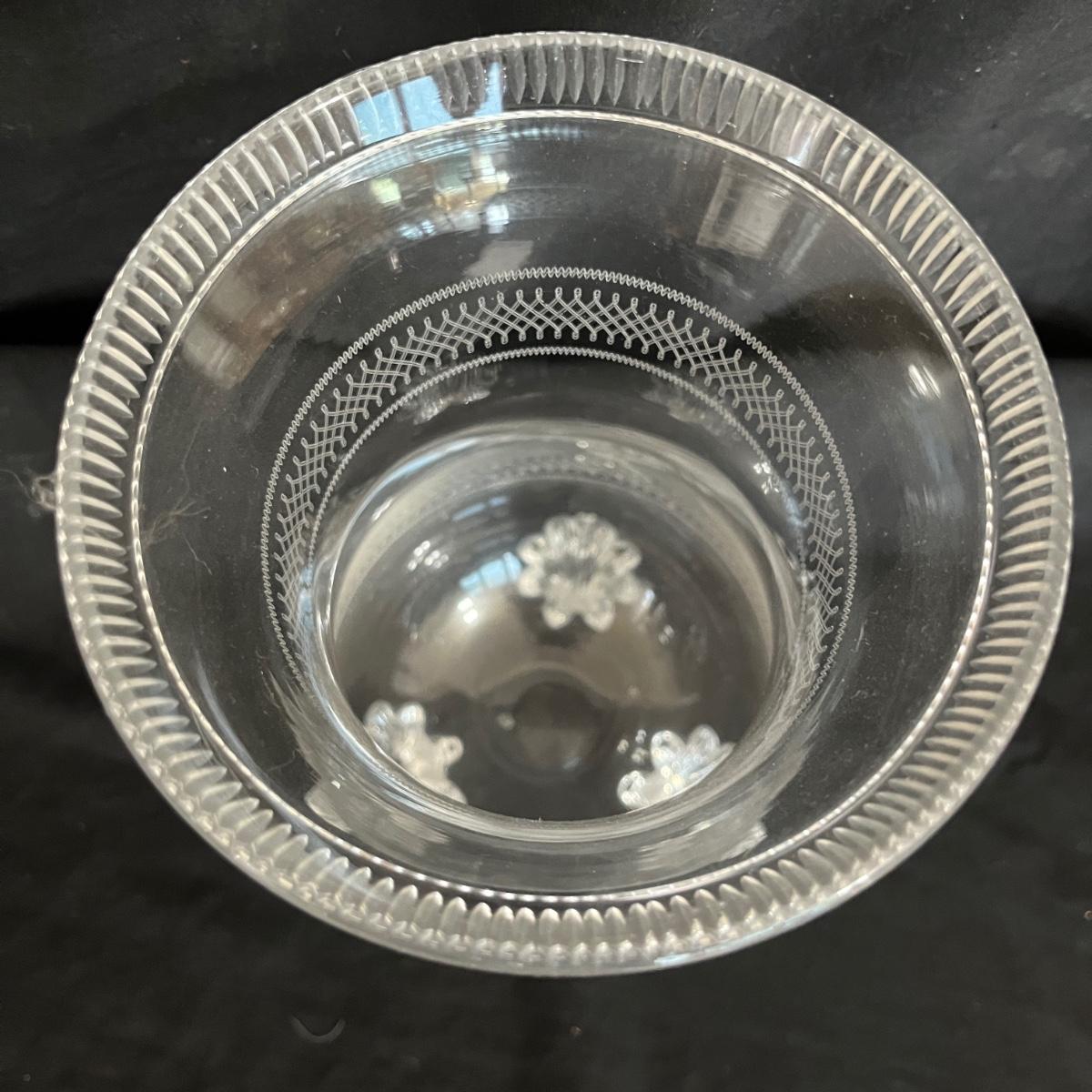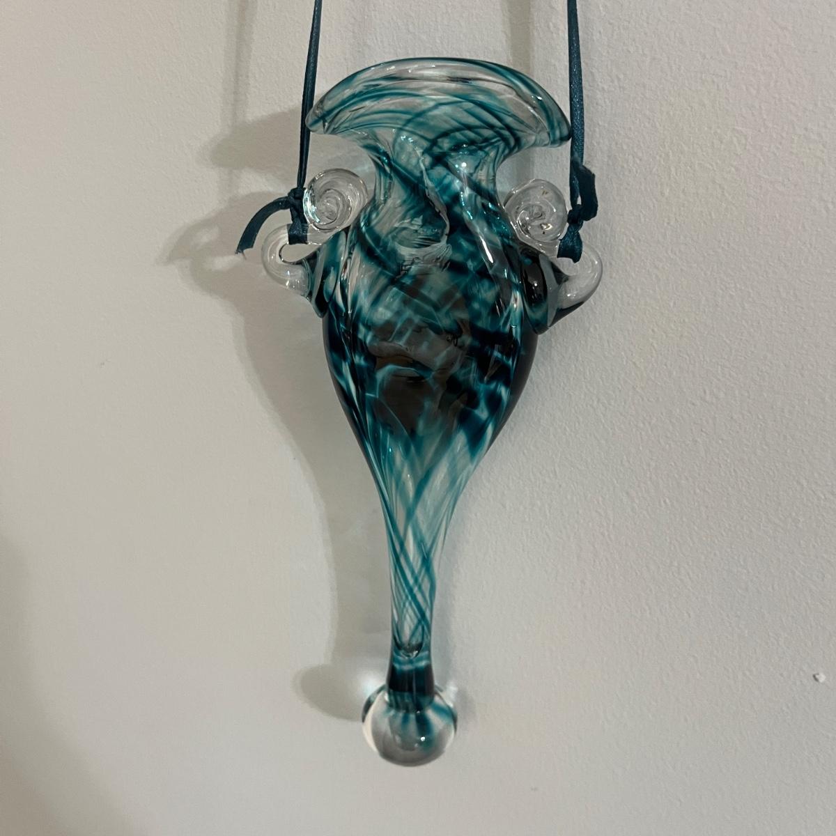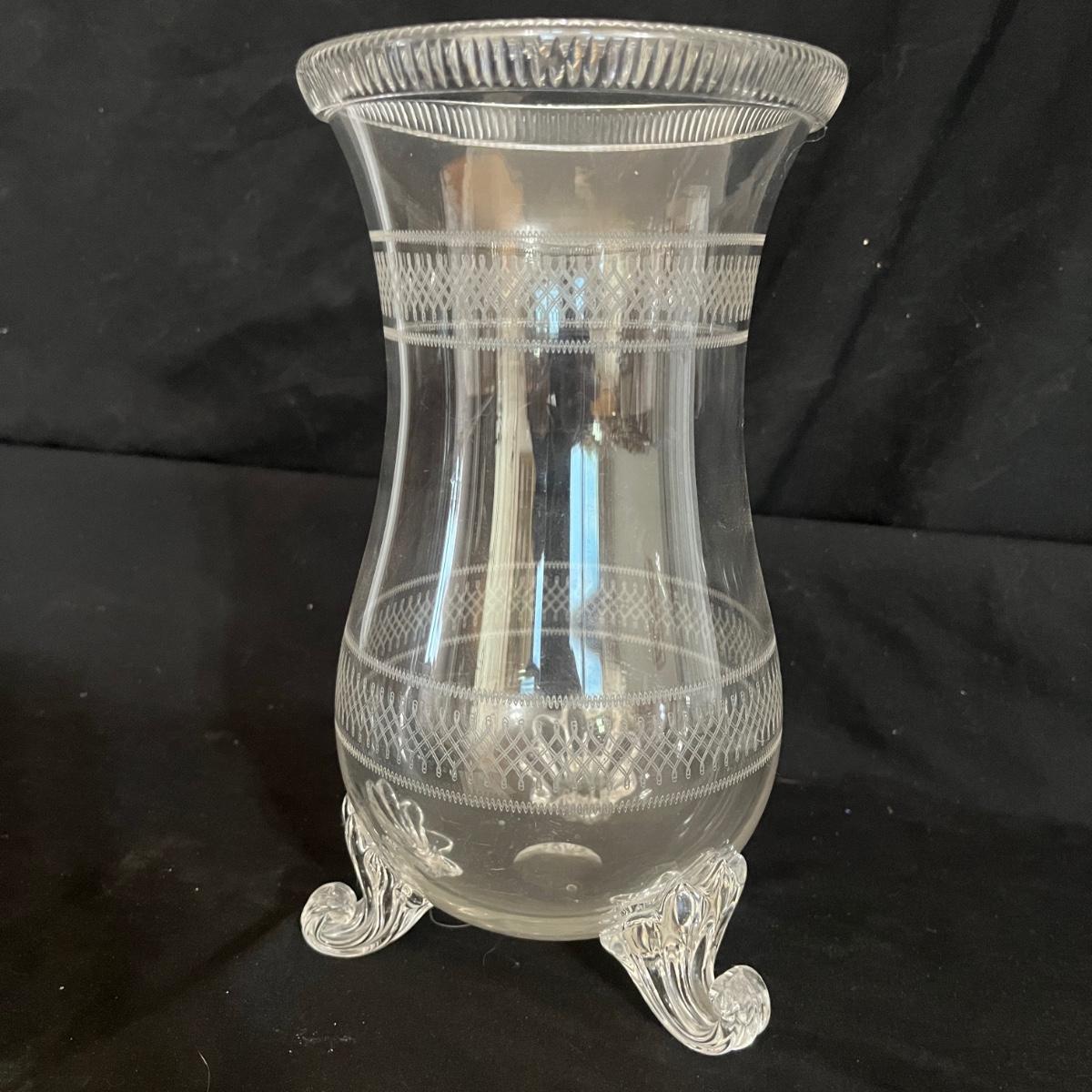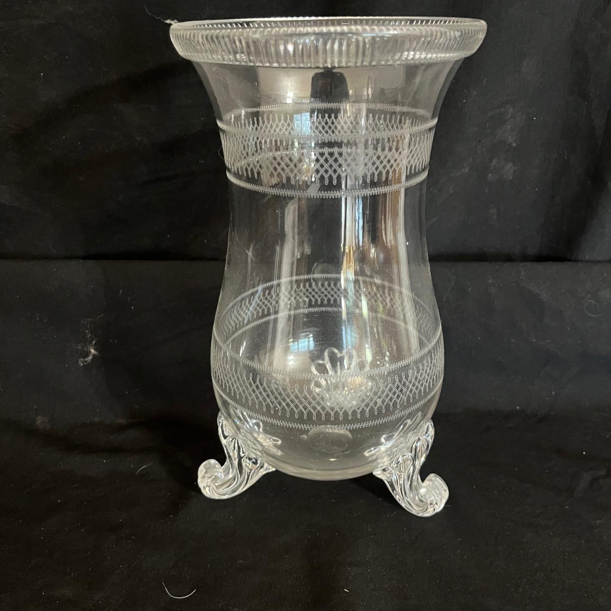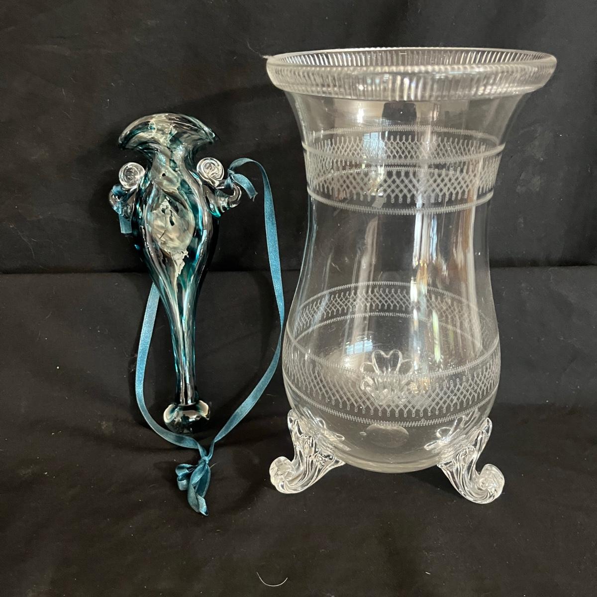 Lot includes a footed etched glass vase and a unique hanging vase with ribbon. Etched vase measures 5”D x 9”H.