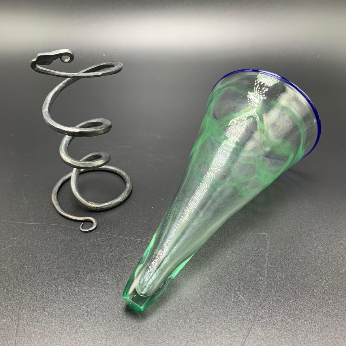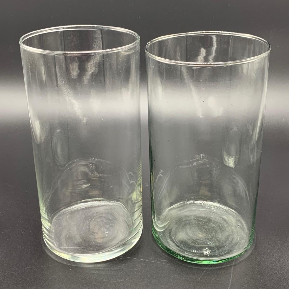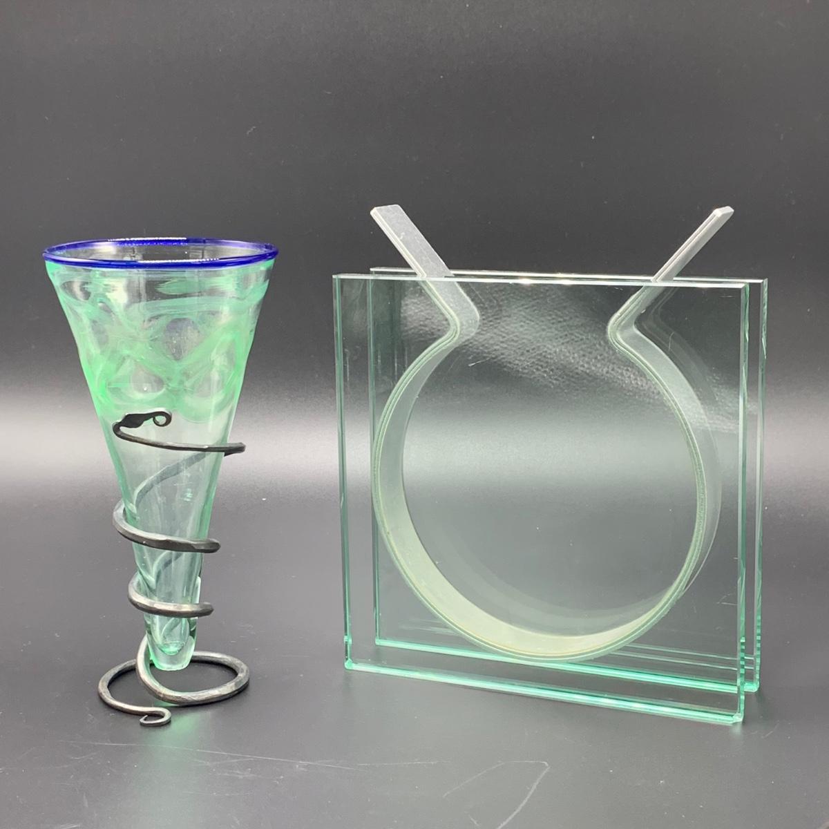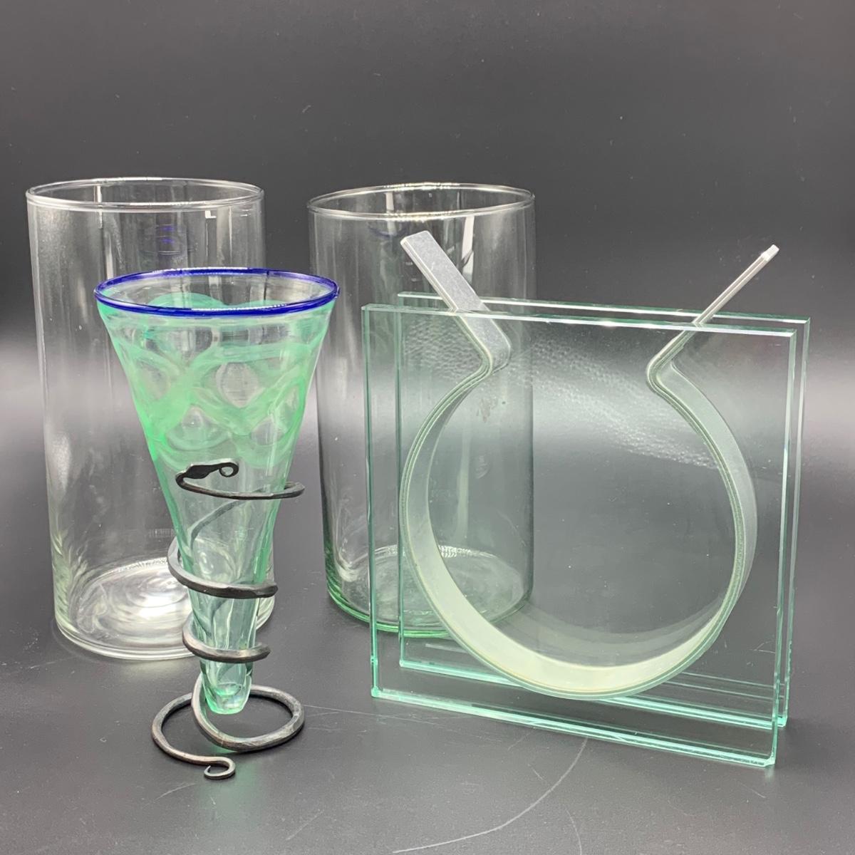 In this lot there are four glass vases. There is one cone shaped vase with colored glass that is held in a coiled metal stand. It is 7.25” tall. One blemish is pictured. It feels like a small piece of something stuck to the inside that could be scraped off. There is also a square vase with a metal structure inside. There are chips in the glass on a few corners. It is 6.75”x6.75” and feels thick and sturdy. There are also two cylindrical glass vases. The taller one is 8.25” tall and the other is about a centimeter shorter. Shipping Available.