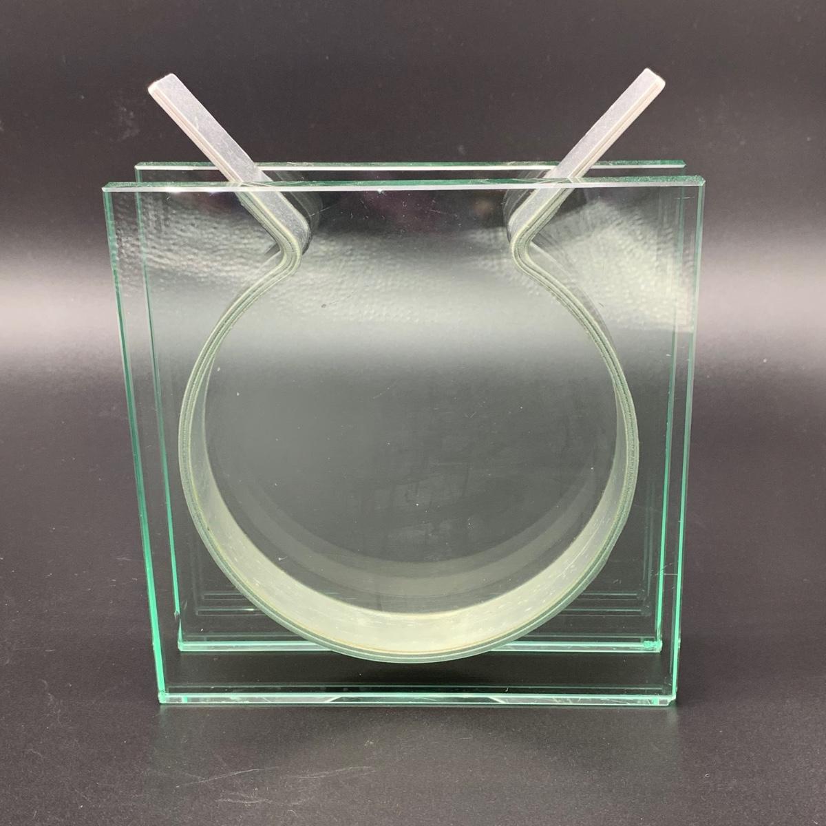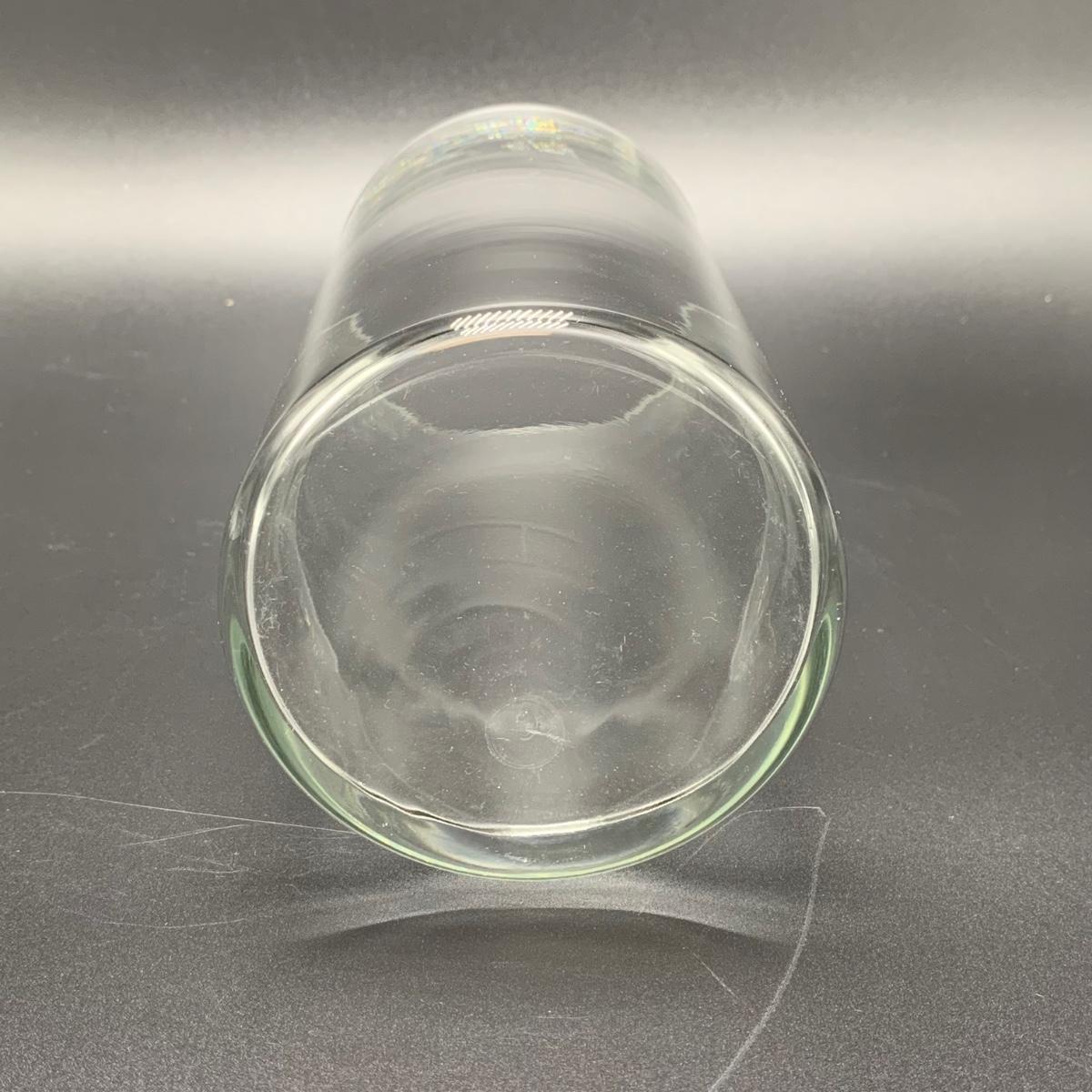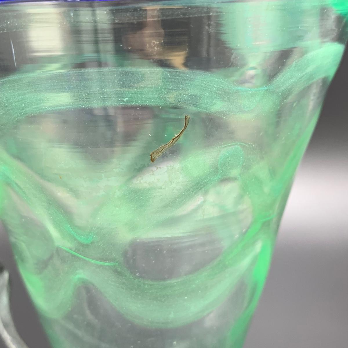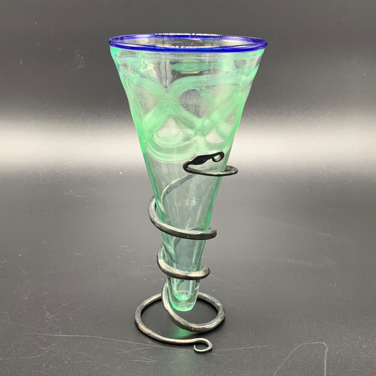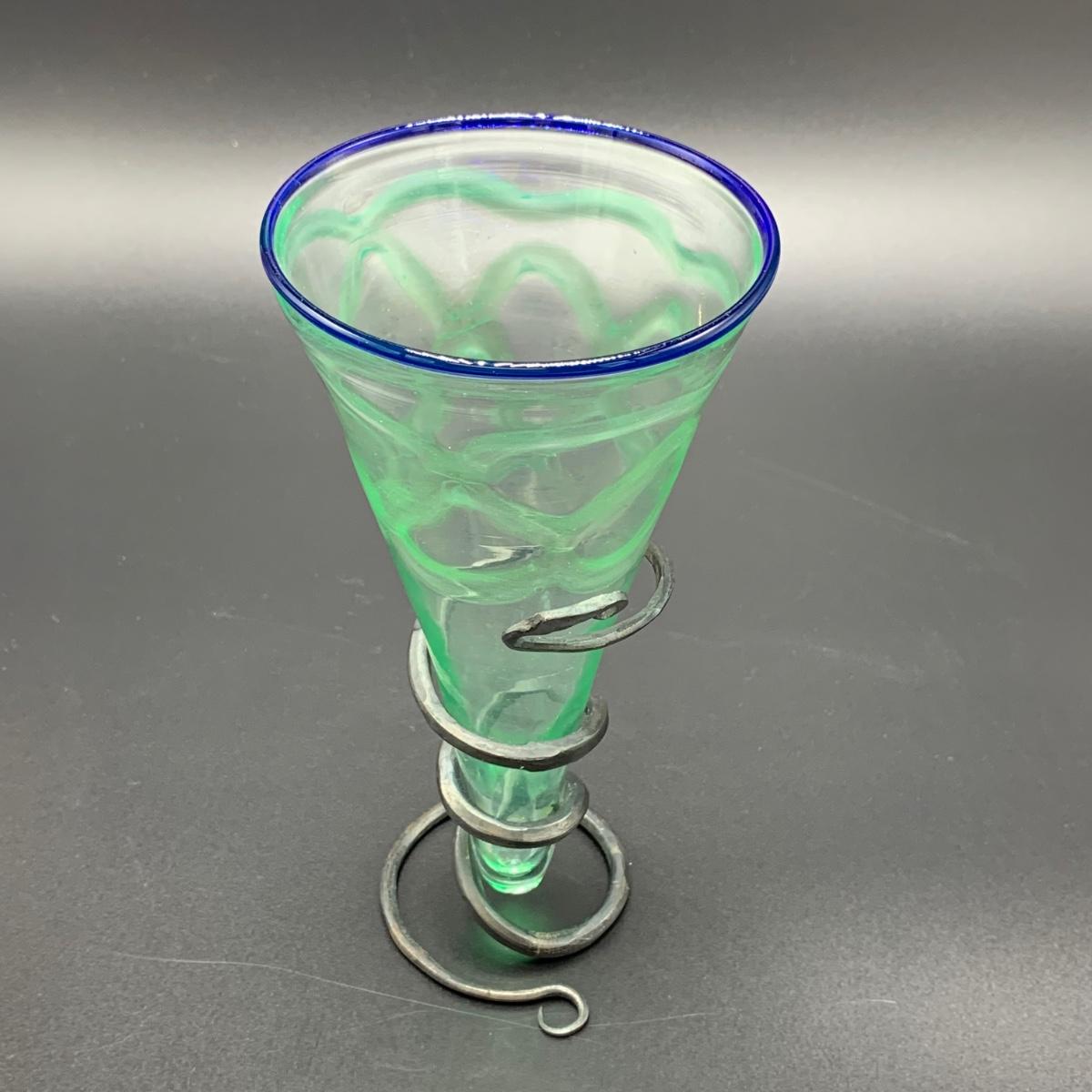 In this lot there are four glass vases. There is one cone shaped vase with colored glass that is held in a coiled metal stand. It is 7.25” tall. One blemish is pictured. It feels like a small piece of something stuck to the inside that could be scraped off. There is also a square vase with a metal structure inside. There are chips in the glass on a few corners. It is 6.75”x6.75” and feels thick and sturdy. There are also two cylindrical glass vases. The taller one is 8.25” tall and the other is about a centimeter shorter. Shipping Available.