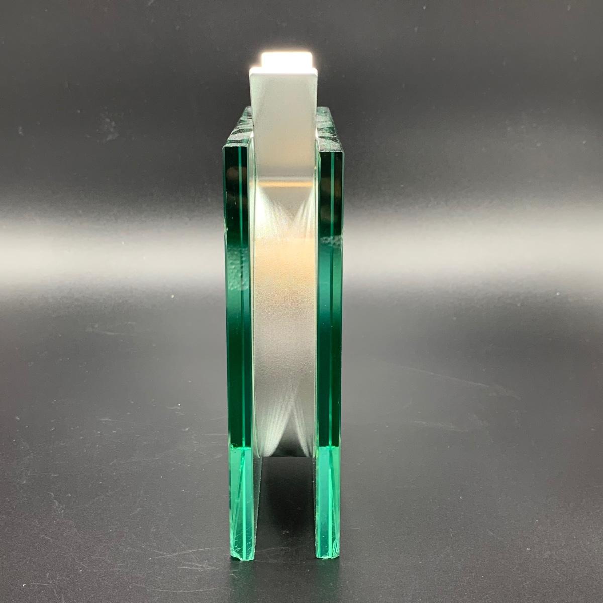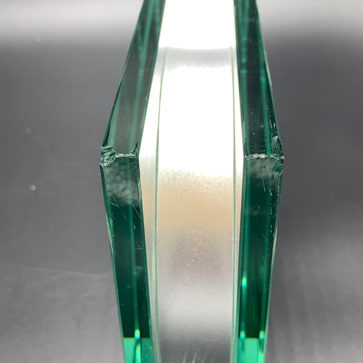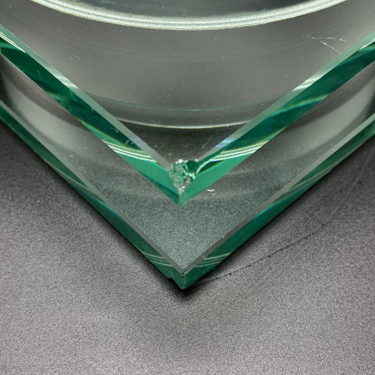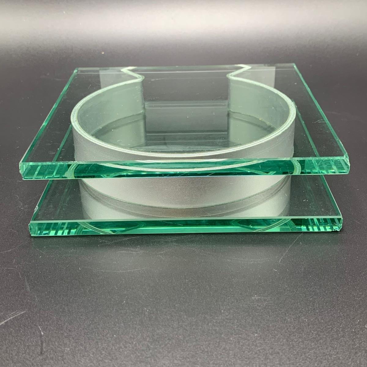 In this lot there are four glass vases. There is one cone shaped vase with colored glass that is held in a coiled metal stand. It is 7.25” tall. One blemish is pictured. It feels like a small piece of something stuck to the inside that could be scraped off. There is also a square vase with a metal structure inside. There are chips in the glass on a few corners. It is 6.75”x6.75” and feels thick and sturdy. There are also two cylindrical glass vases. The taller one is 8.25” tall and the other is about a centimeter shorter. Shipping Available.