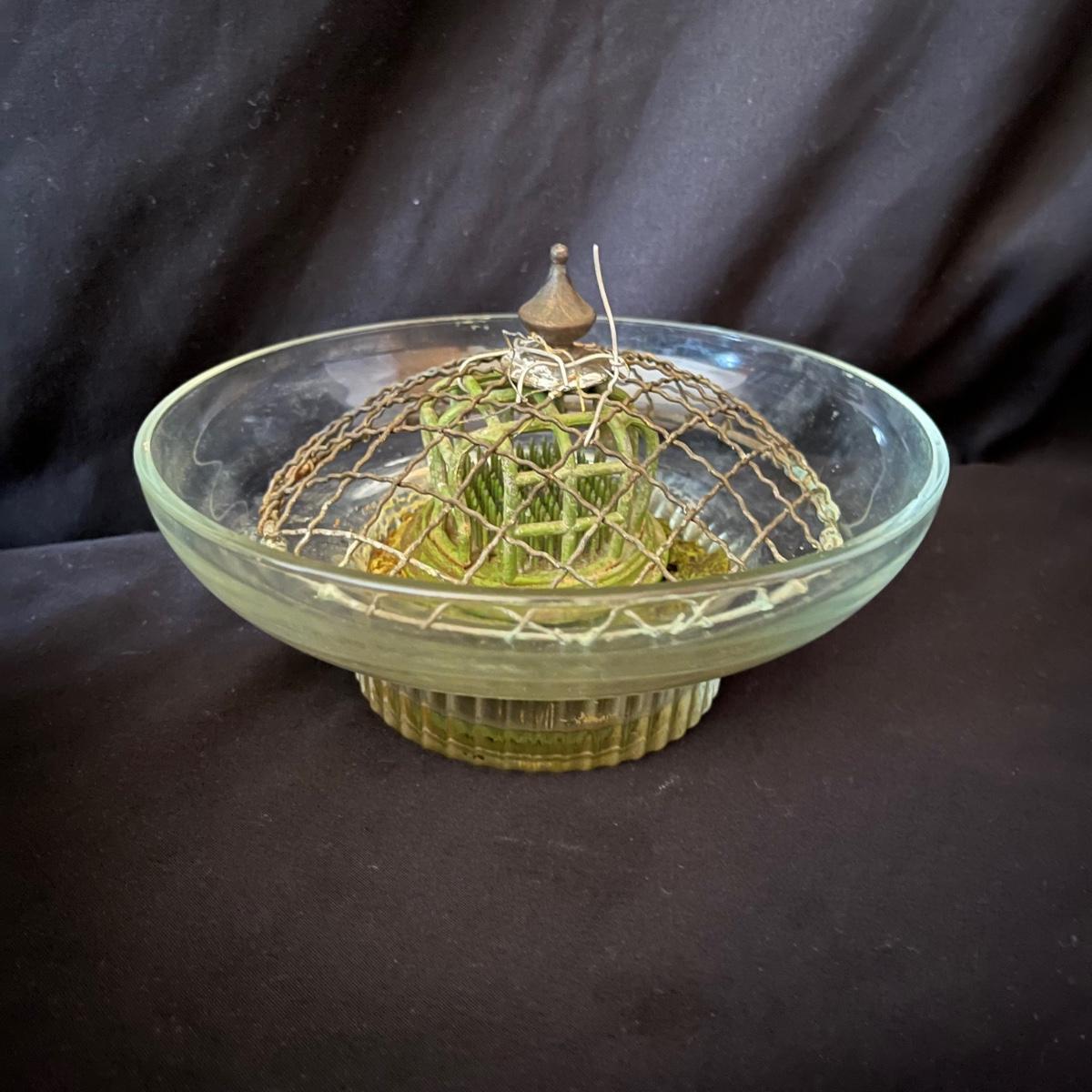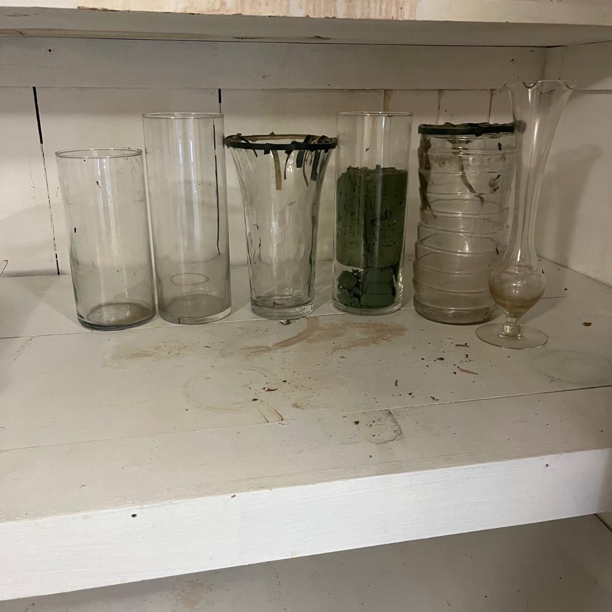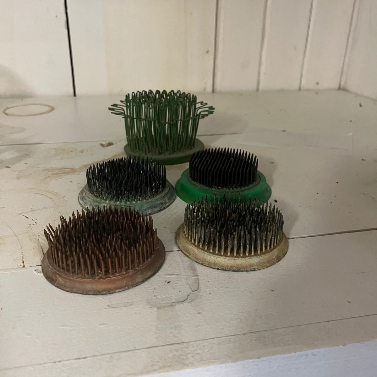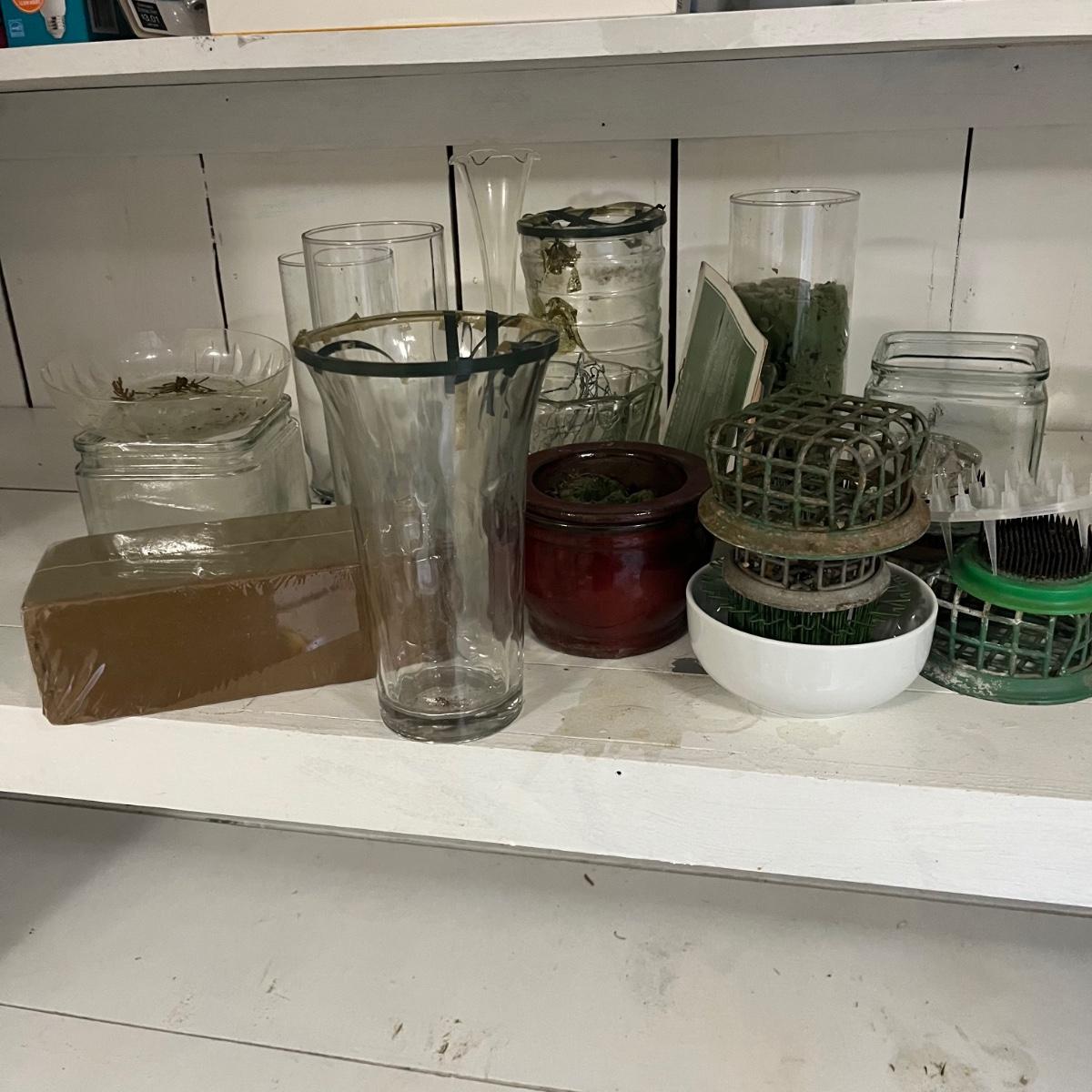 Lot includes a variety of metal and glass flower frogs, as well as some vogue holders. Also includes glass vases in a variety of sizes with the tallest measuring 3.5”D x 9” tall.