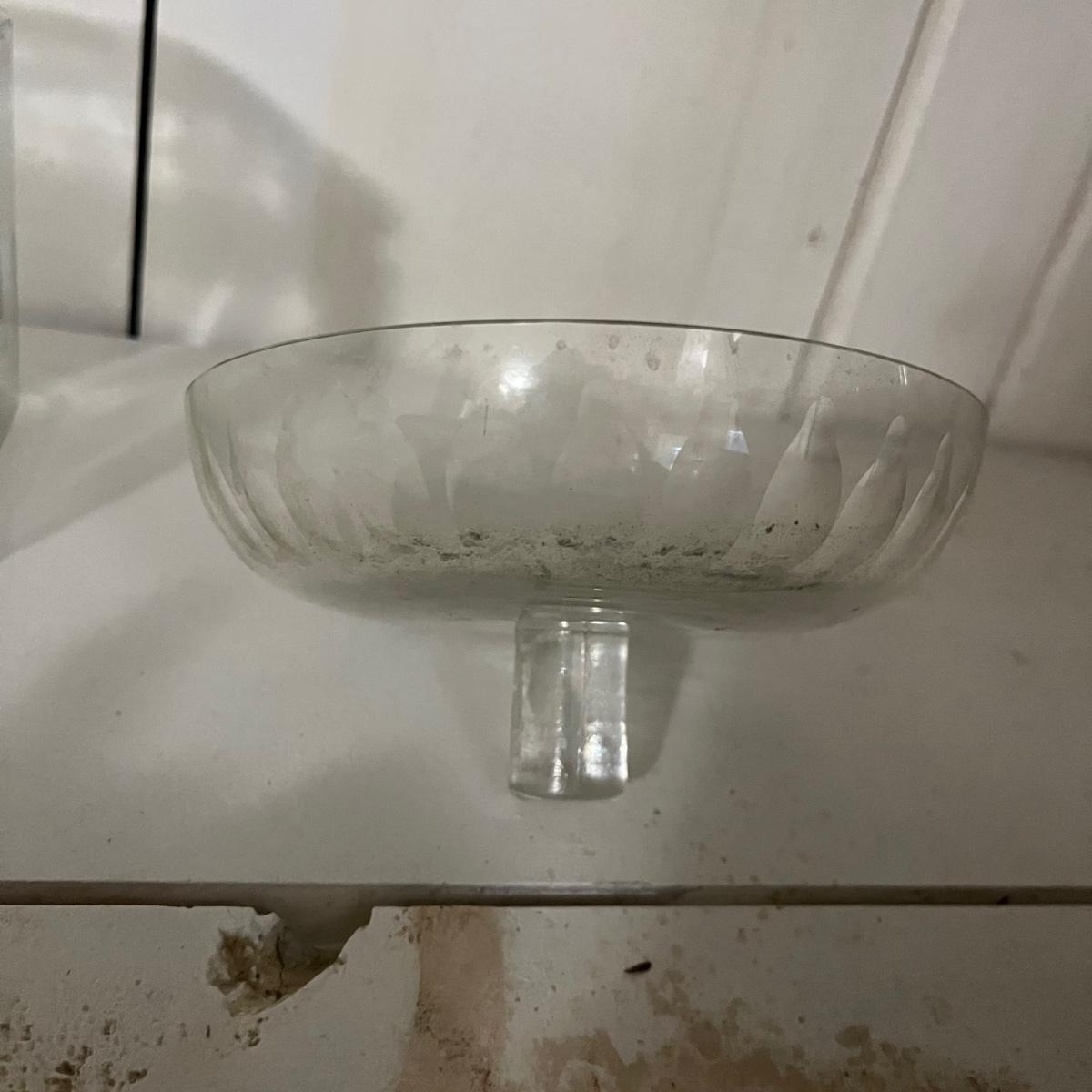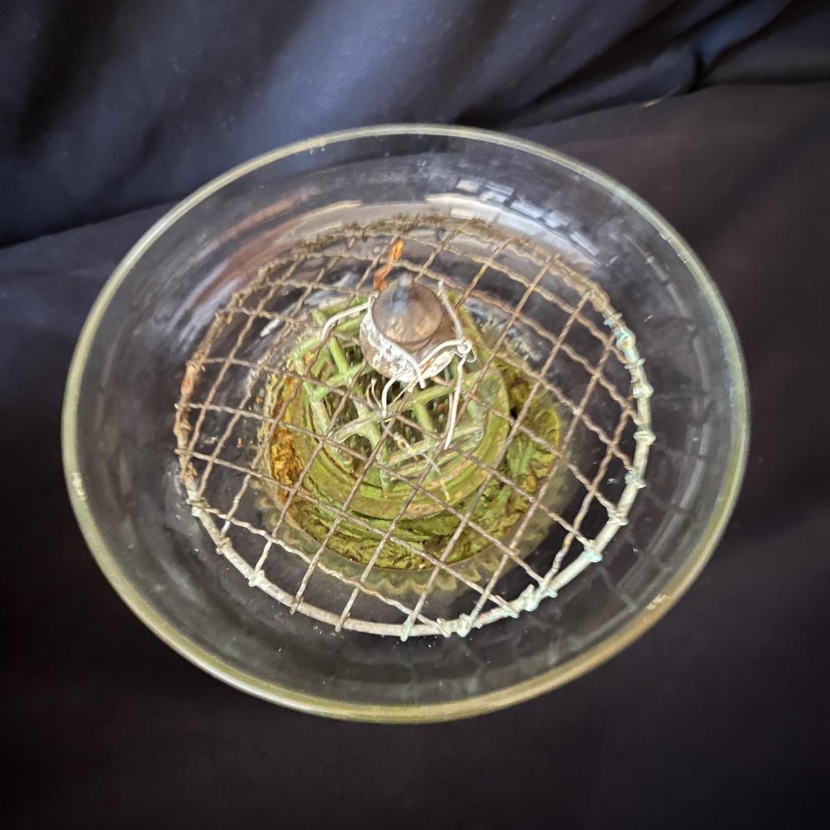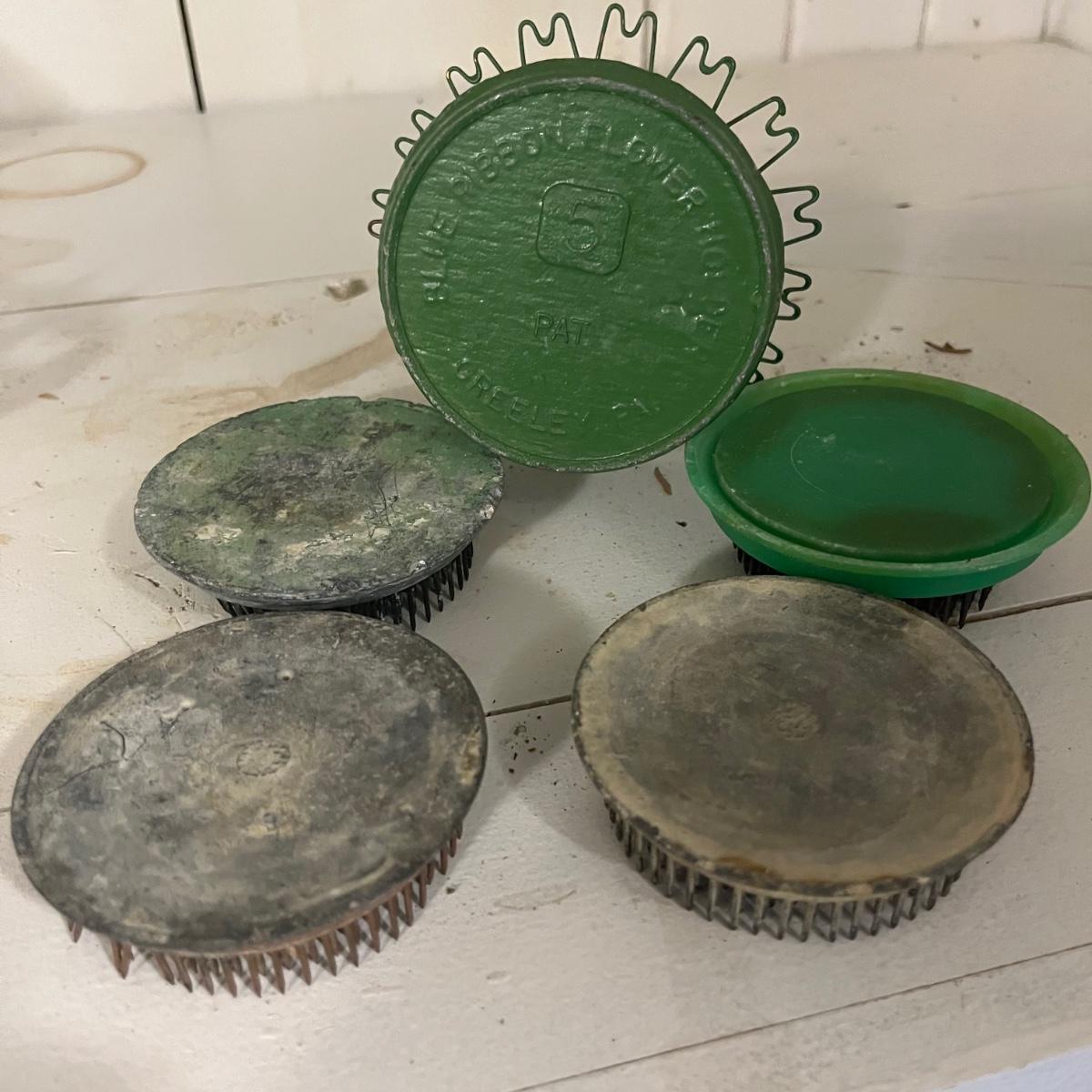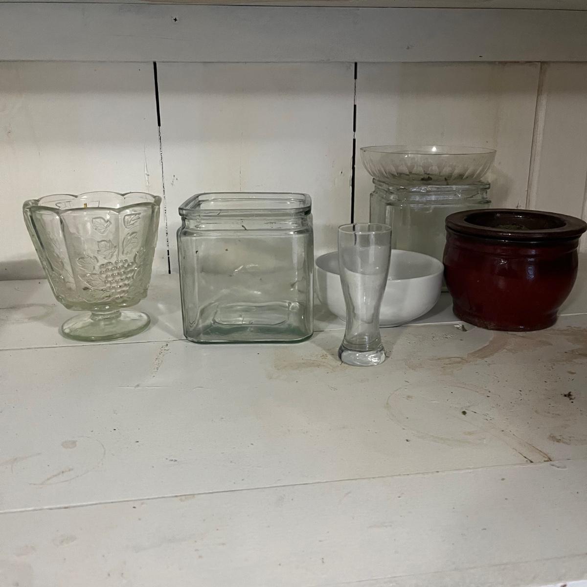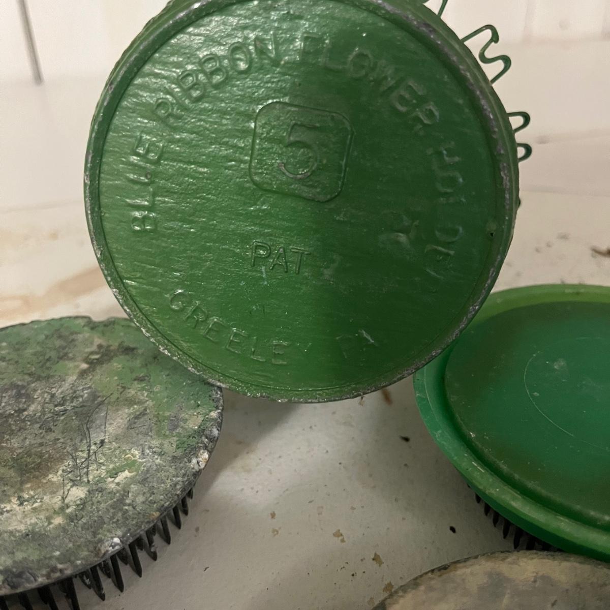 Lot includes a variety of metal and glass flower frogs, as well as some vogue holders. Also includes glass vases in a variety of sizes with the tallest measuring 3.5”D x 9” tall.