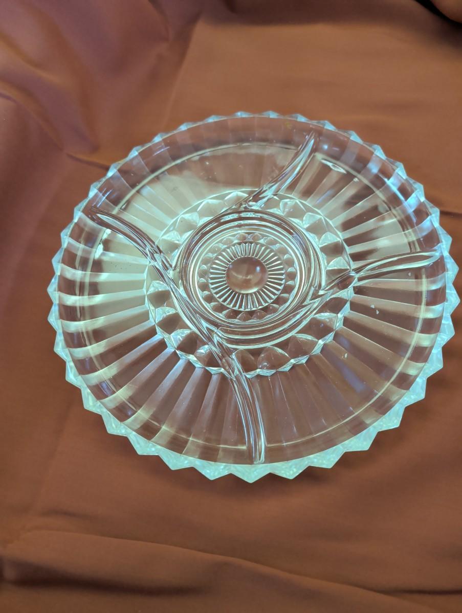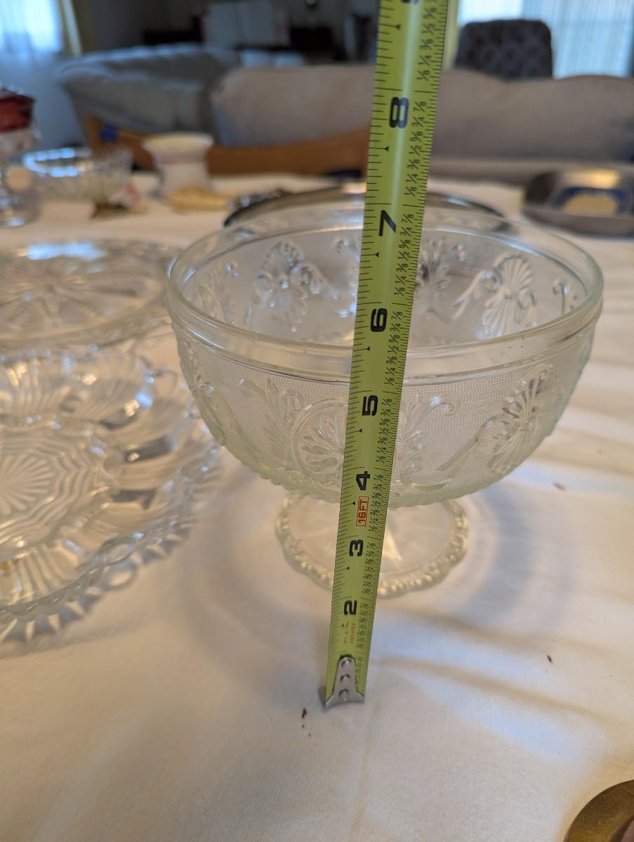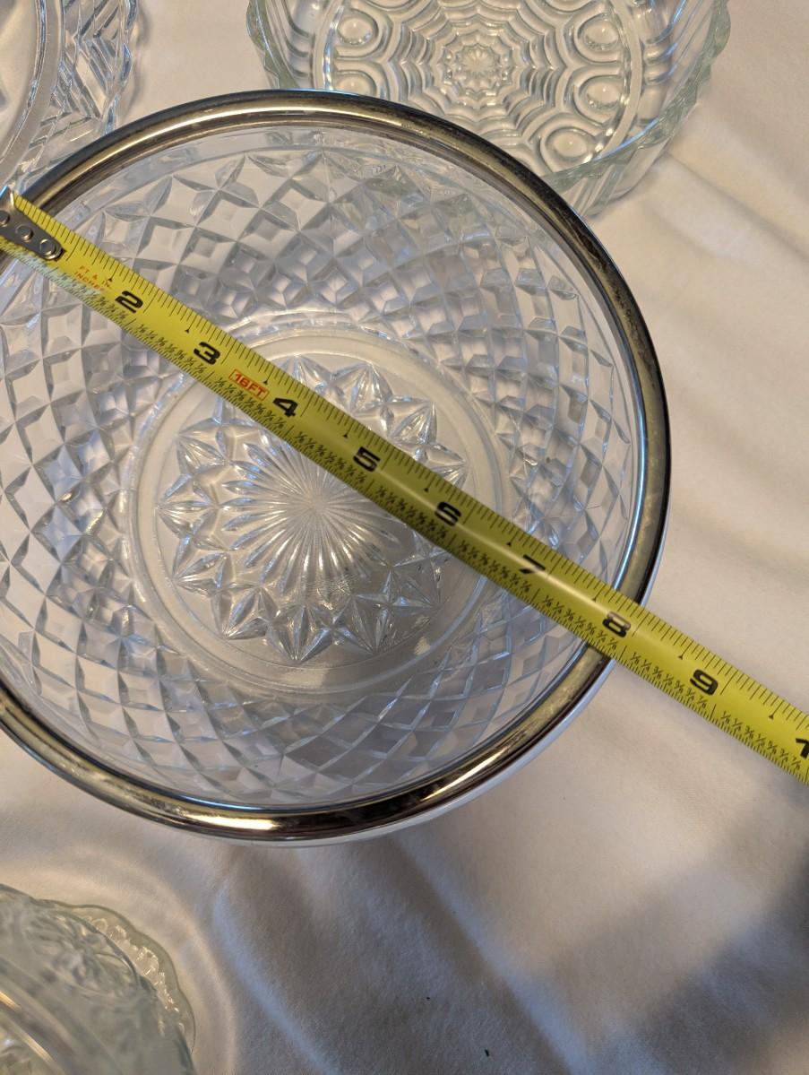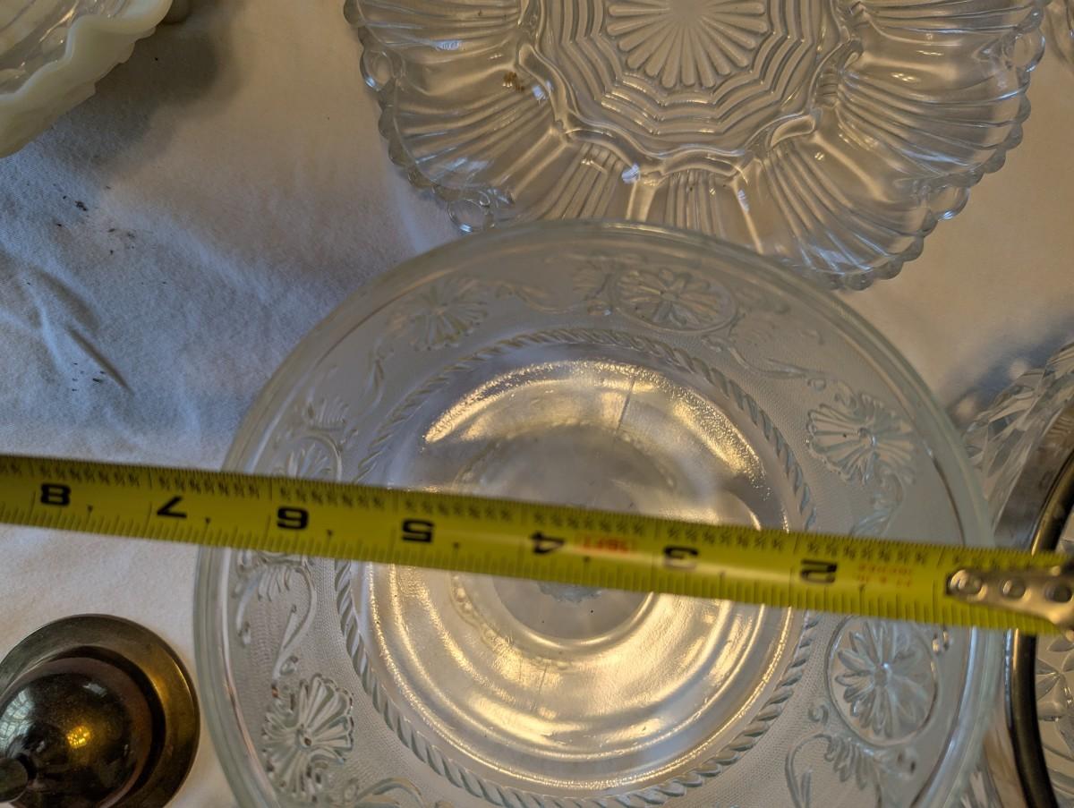 Vintage glass bowl made in England waffle pattern silver metal rim. Vintage pedestal glass candy dish. Vintage clear pressed glass round serving dish. Vintage anchor Hocking Queen Mary clear platter. Federal Glass three-legged glass cake plate. Indiana glass five section ribbed relish tray. Anchor Hocking clear glass deviled egg plate.