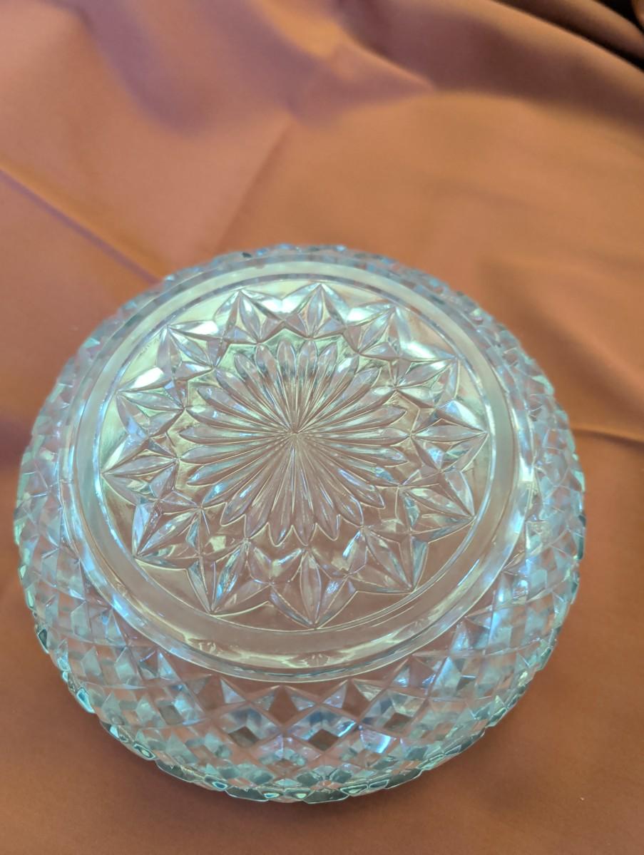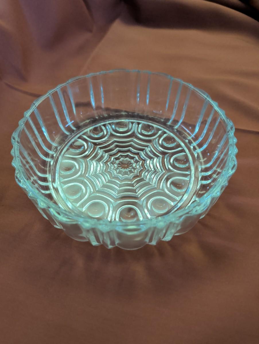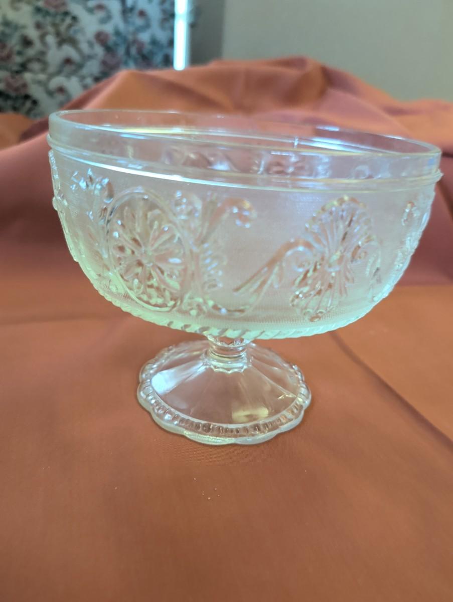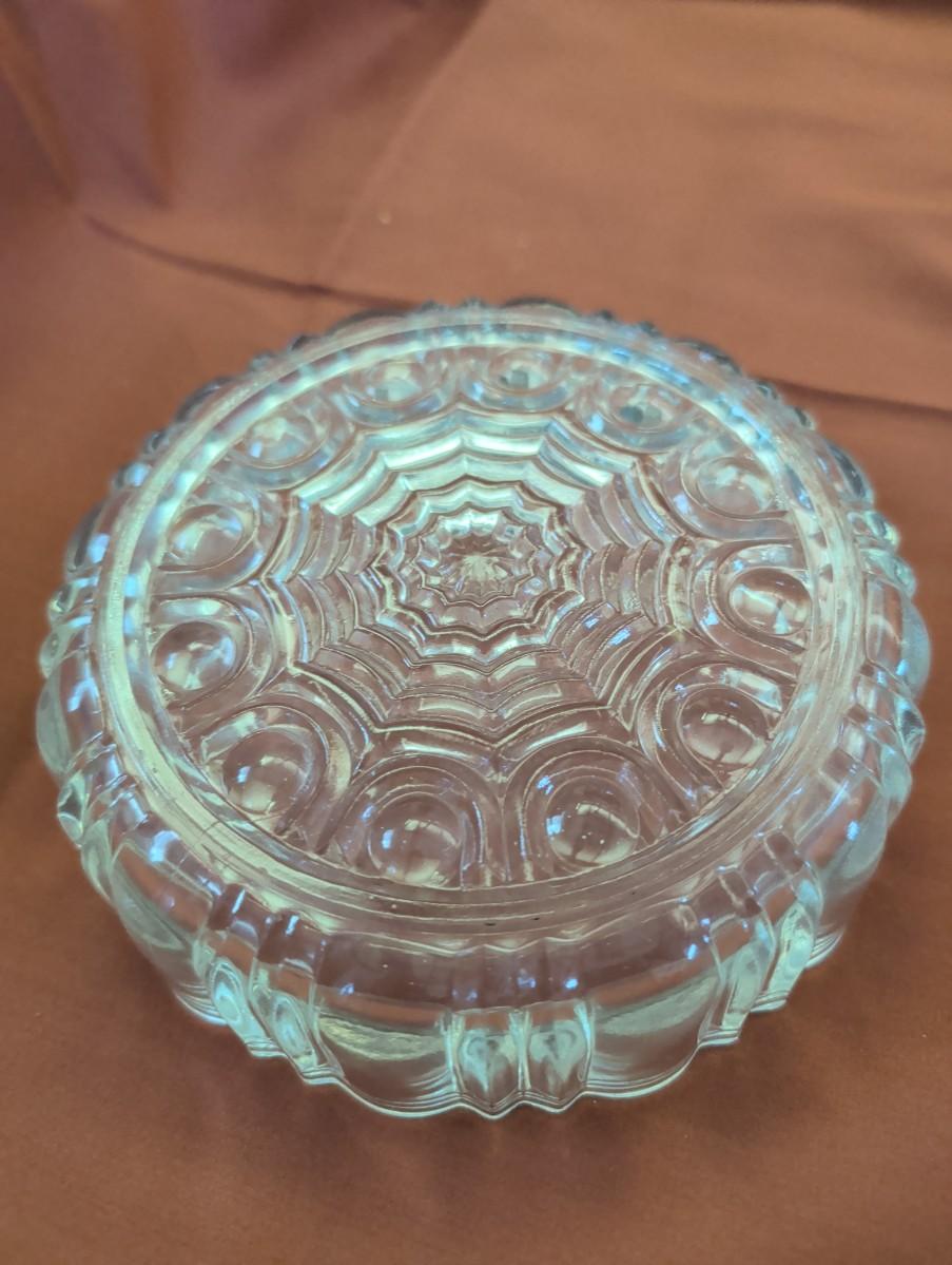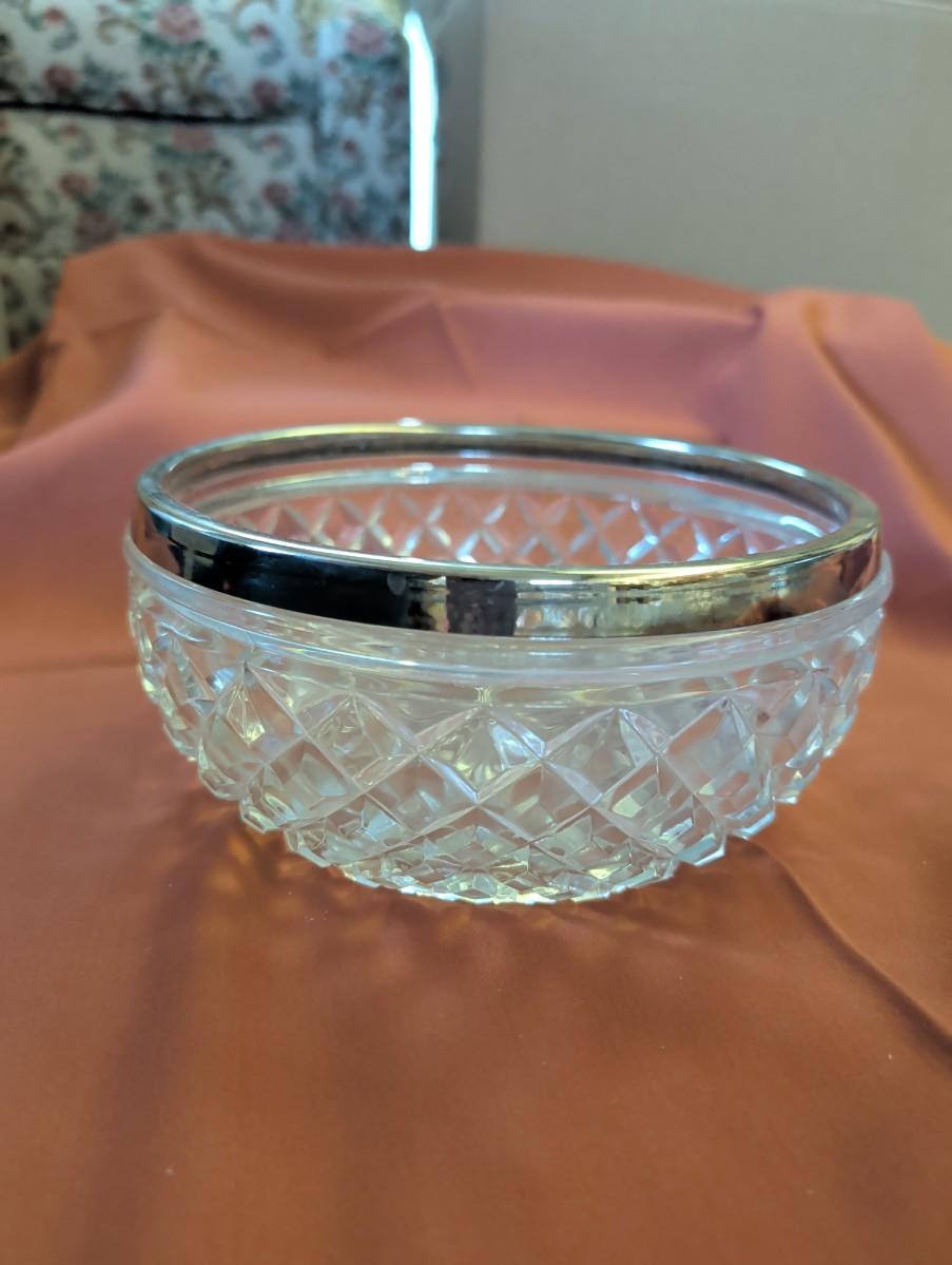 Vintage glass bowl made in England waffle pattern silver metal rim. Vintage pedestal glass candy dish. Vintage clear pressed glass round serving dish. Vintage anchor Hocking Queen Mary clear platter. Federal Glass three-legged glass cake plate. Indiana glass five section ribbed relish tray. Anchor Hocking clear glass deviled egg plate.