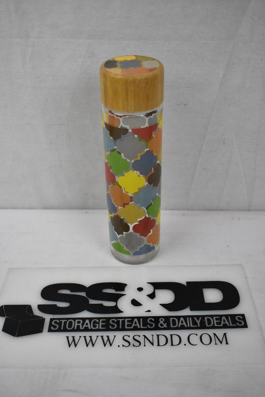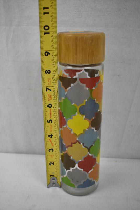 Glass Water Bottle with Wooden Lid. Colorful Painted Designs
